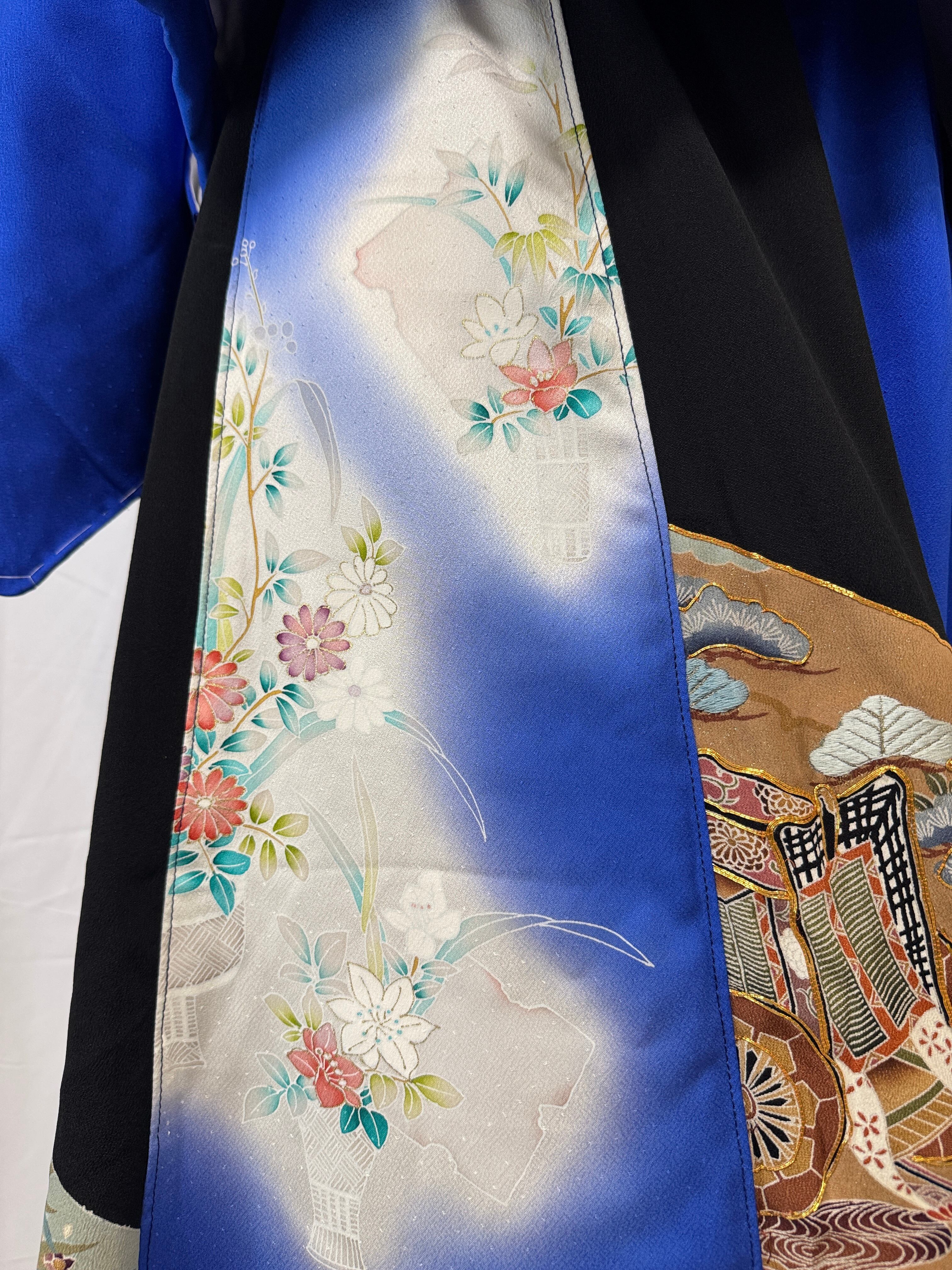 スカートには、2着の着物(訪問着と留袖)の裾柄を交互に配置。