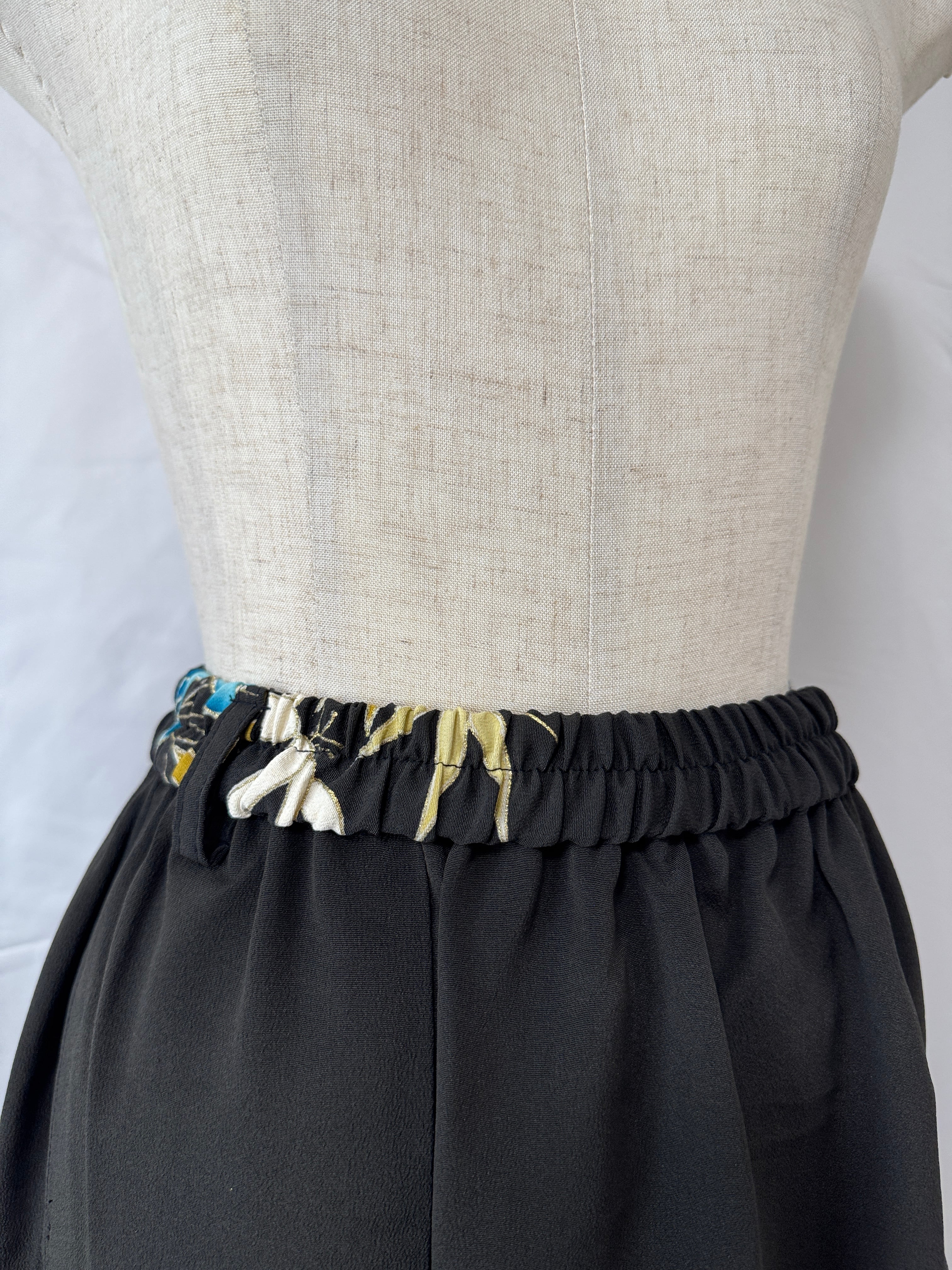 ウエストは伸縮性のあるゴムで仕立てており、ベルト通しもございます。