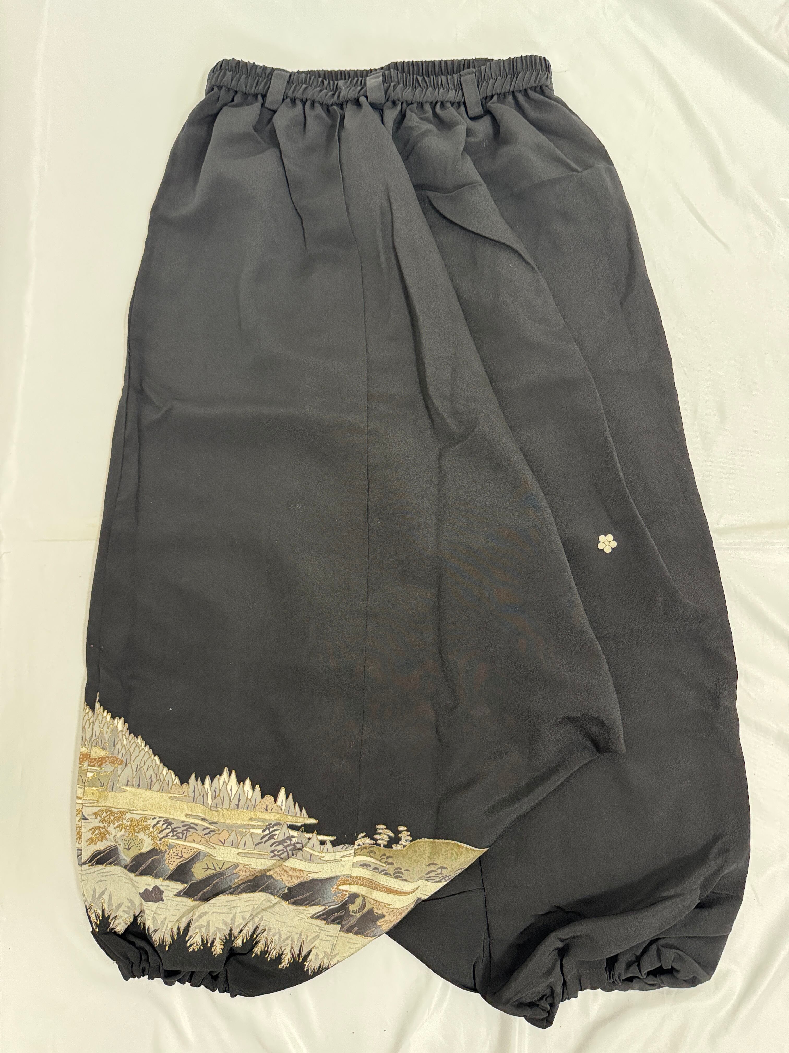 格式ある黒留袖を贅沢に使用し、ゆったりとしたサルエルシルエットのパンツにリメイクしました。