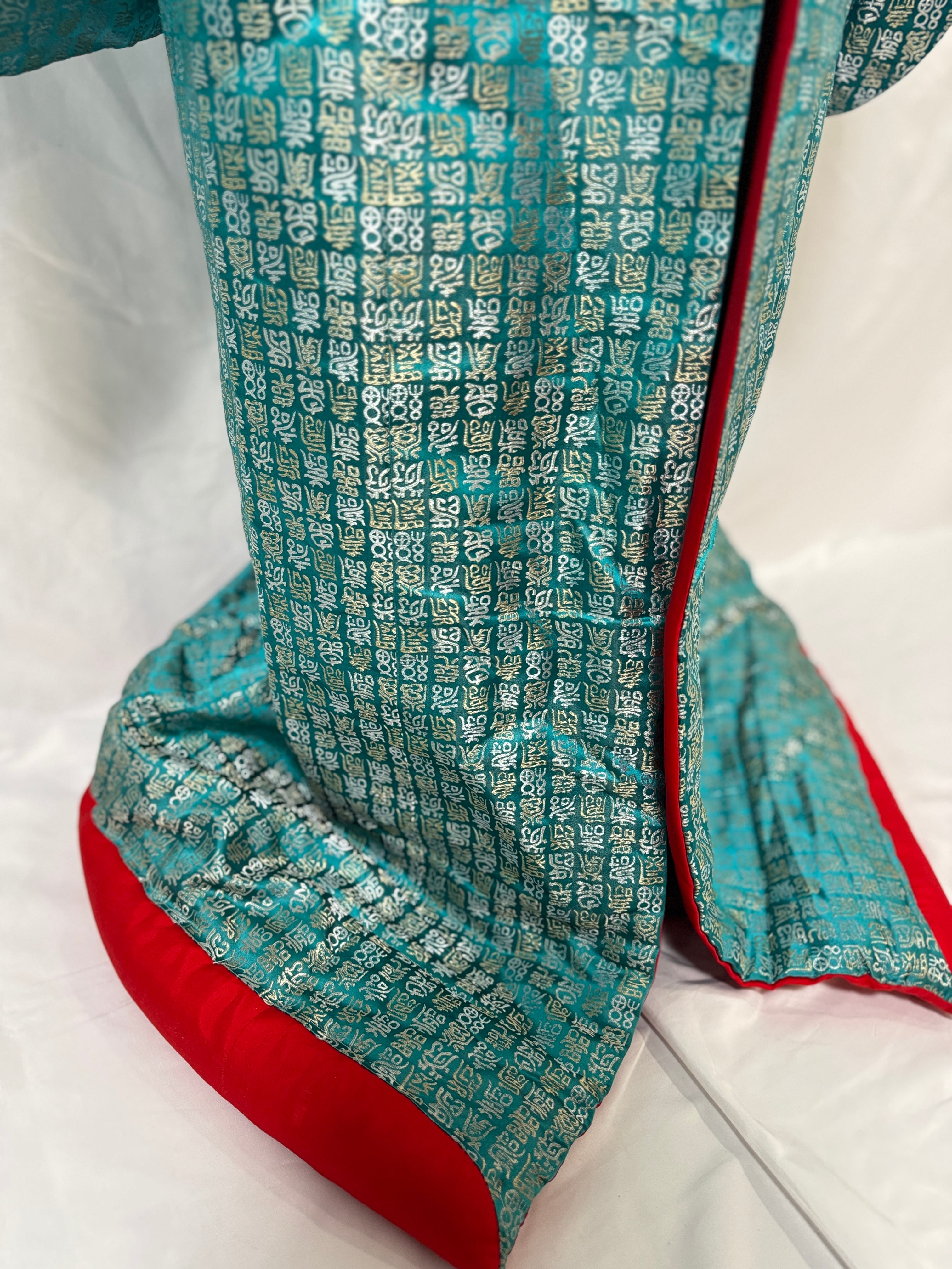 and is decorated with various colors and embroidery such as red, gold, and green.