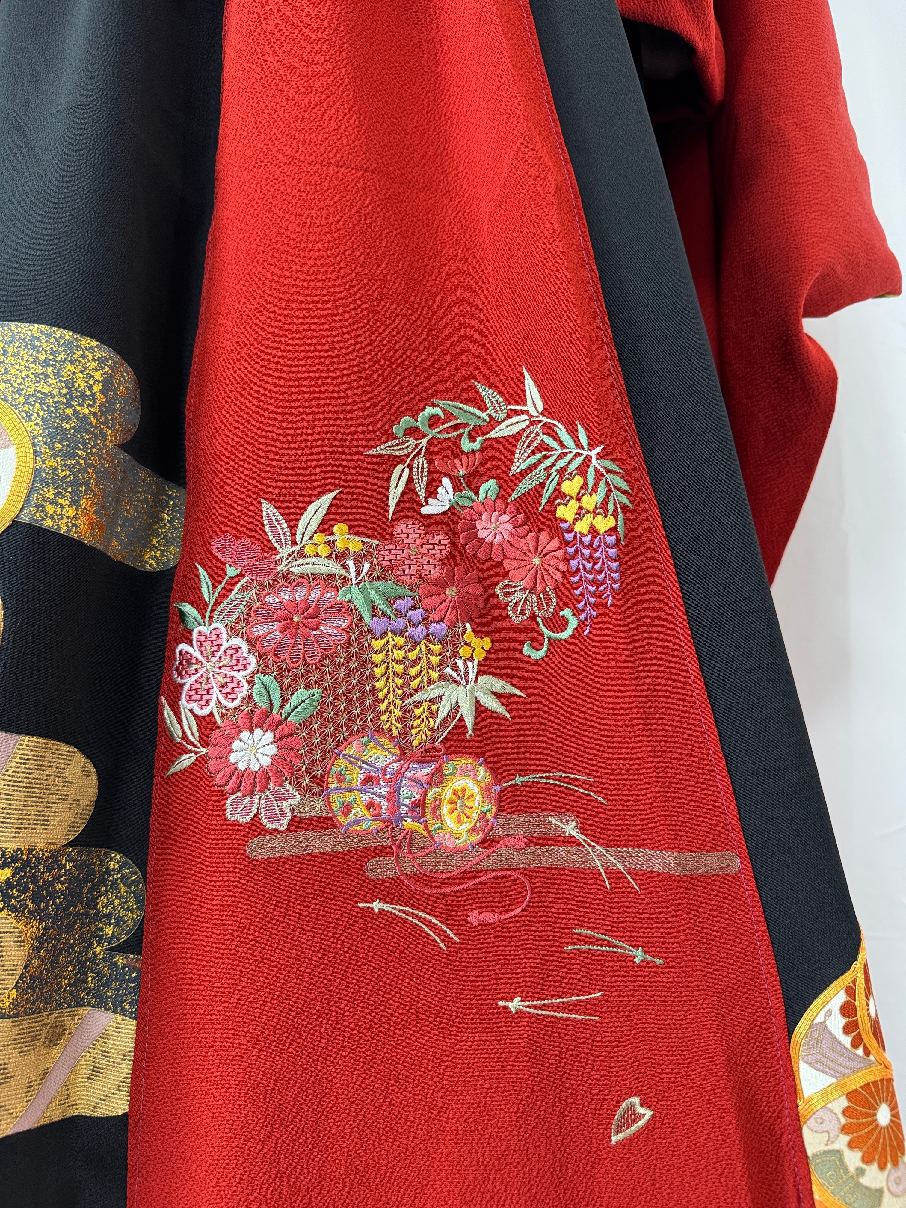 Based on a striking deep crimson furisode, it features embroidery of floral motifs and pine, bamboo, and plum designs.