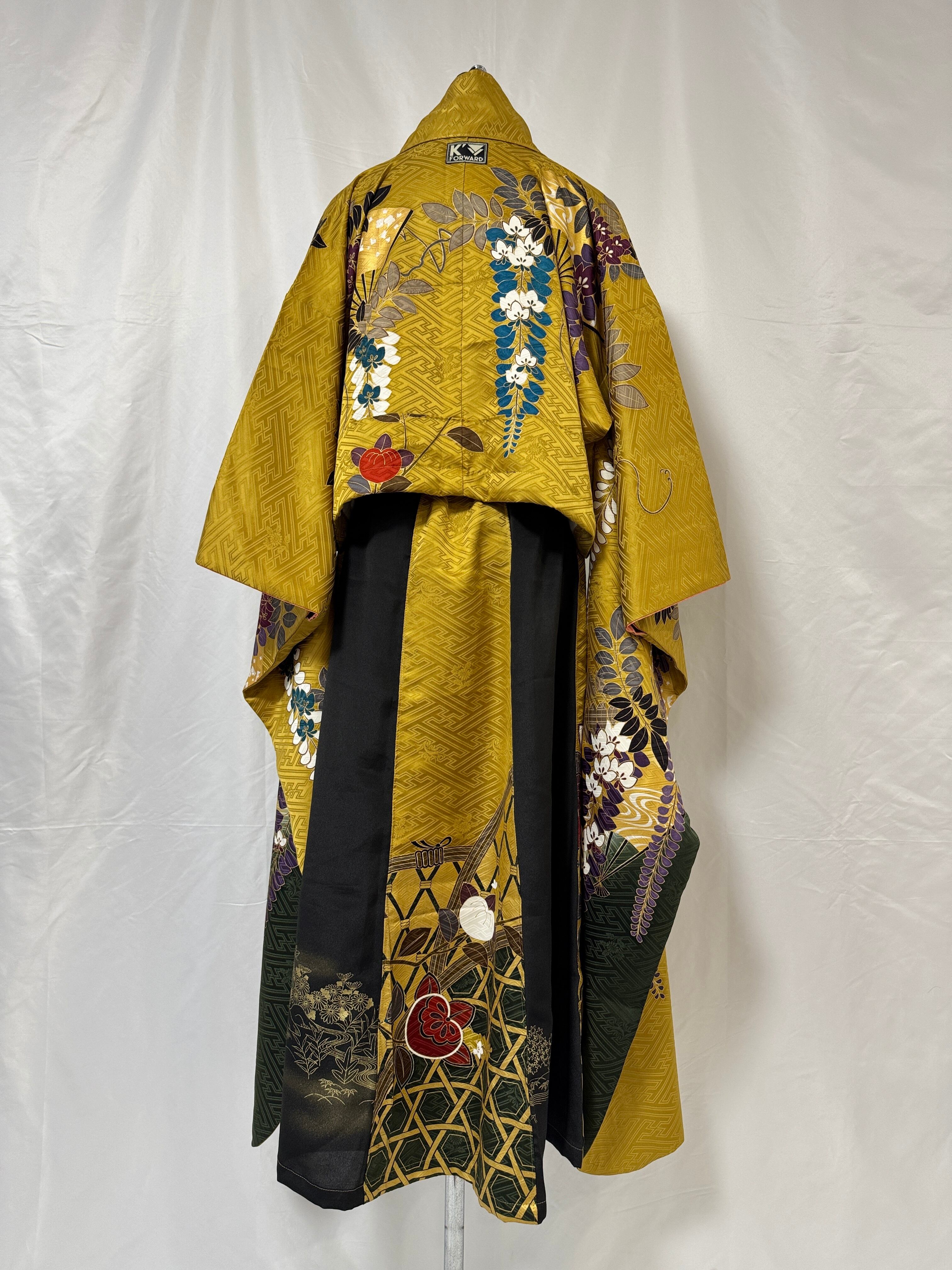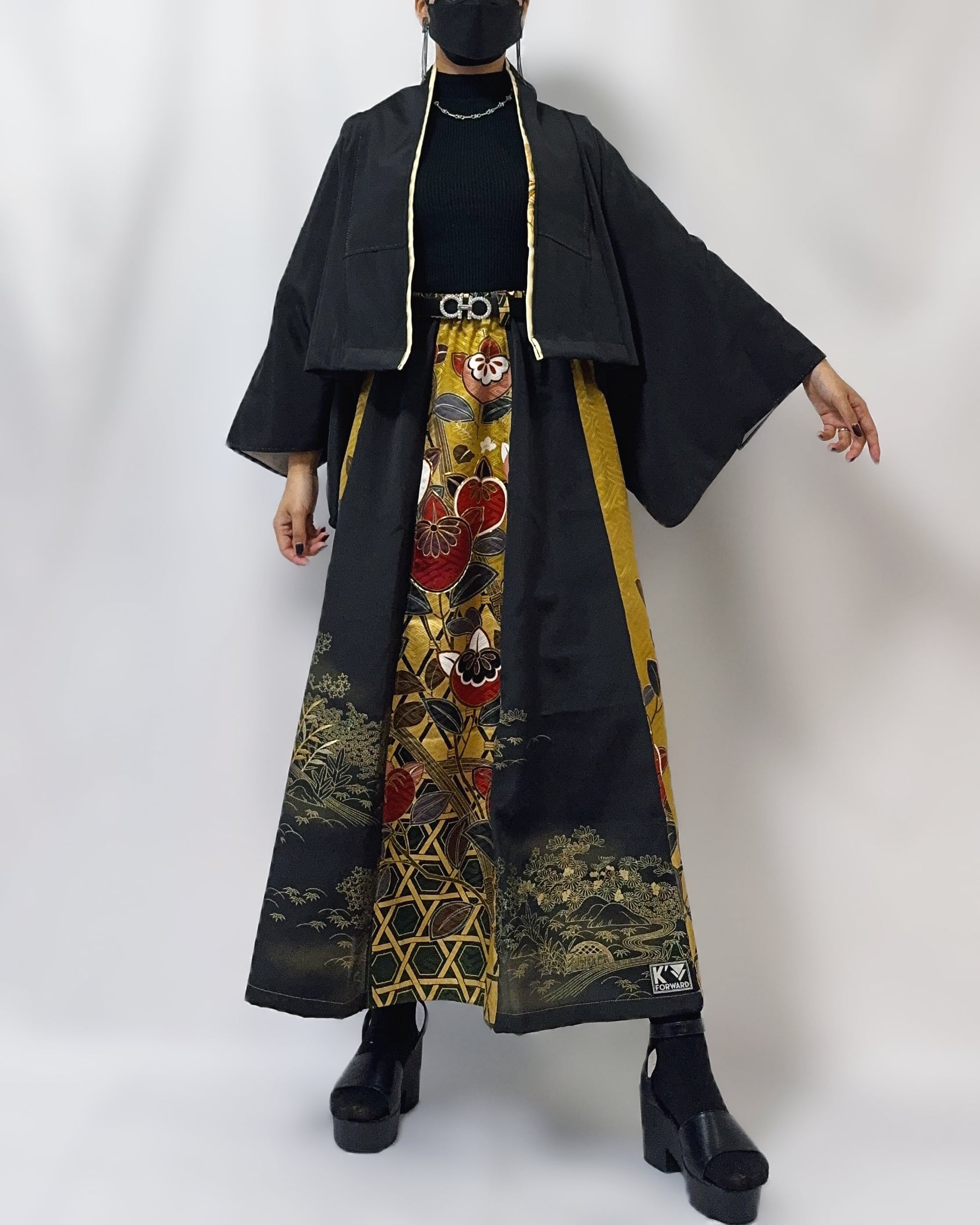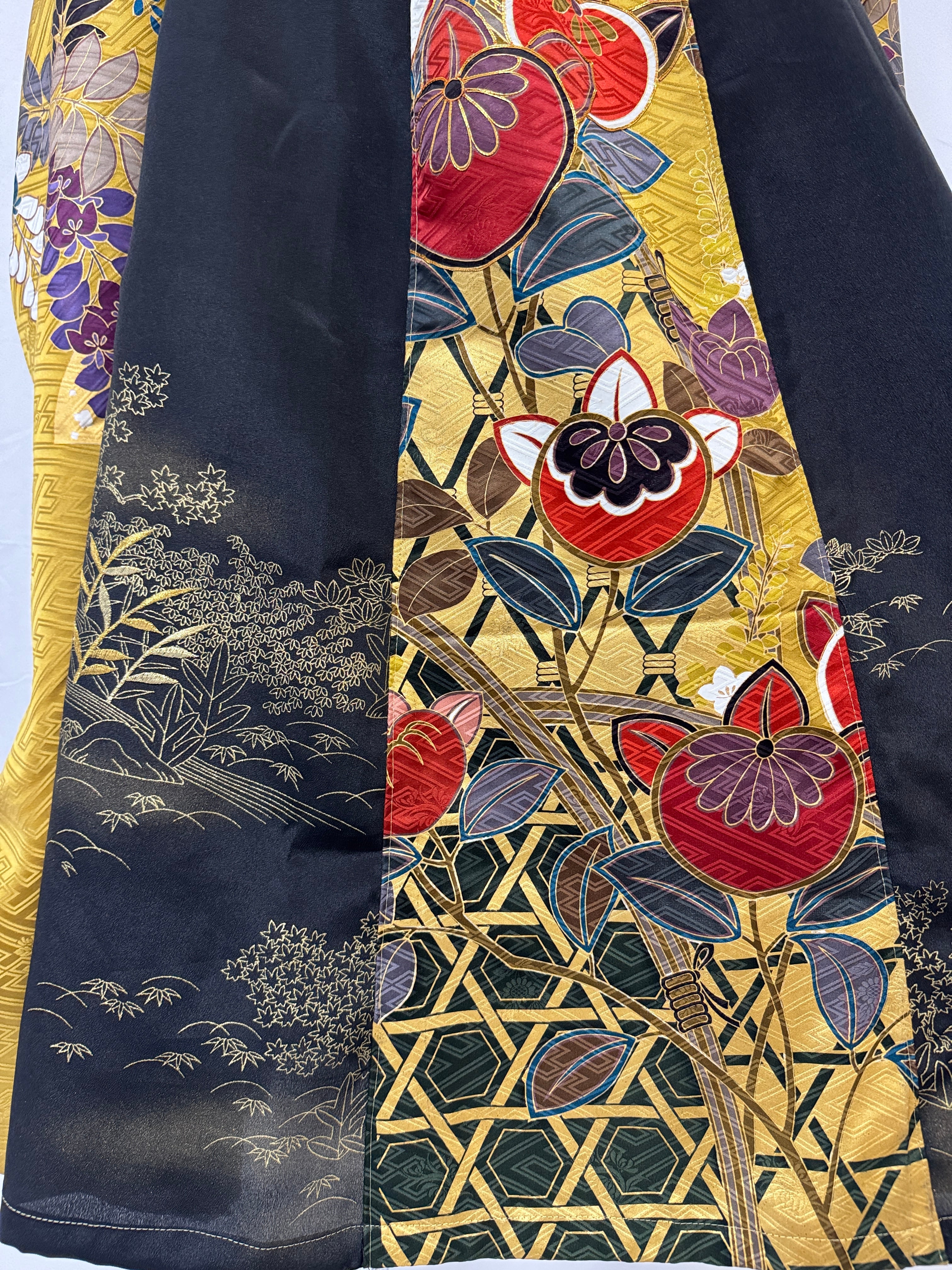The skirt is crafted by lavishly combining the hem sections of both kimonos.
