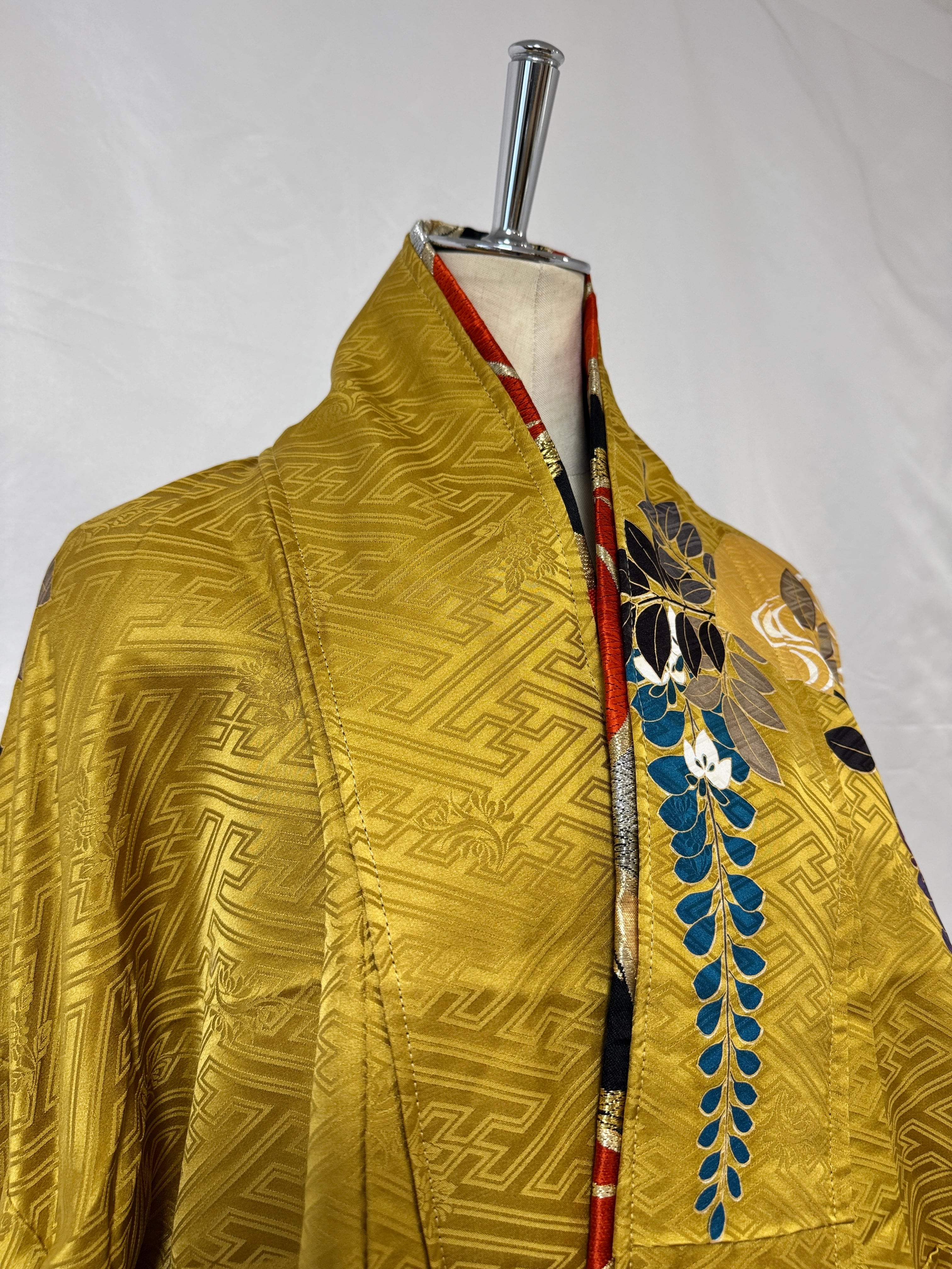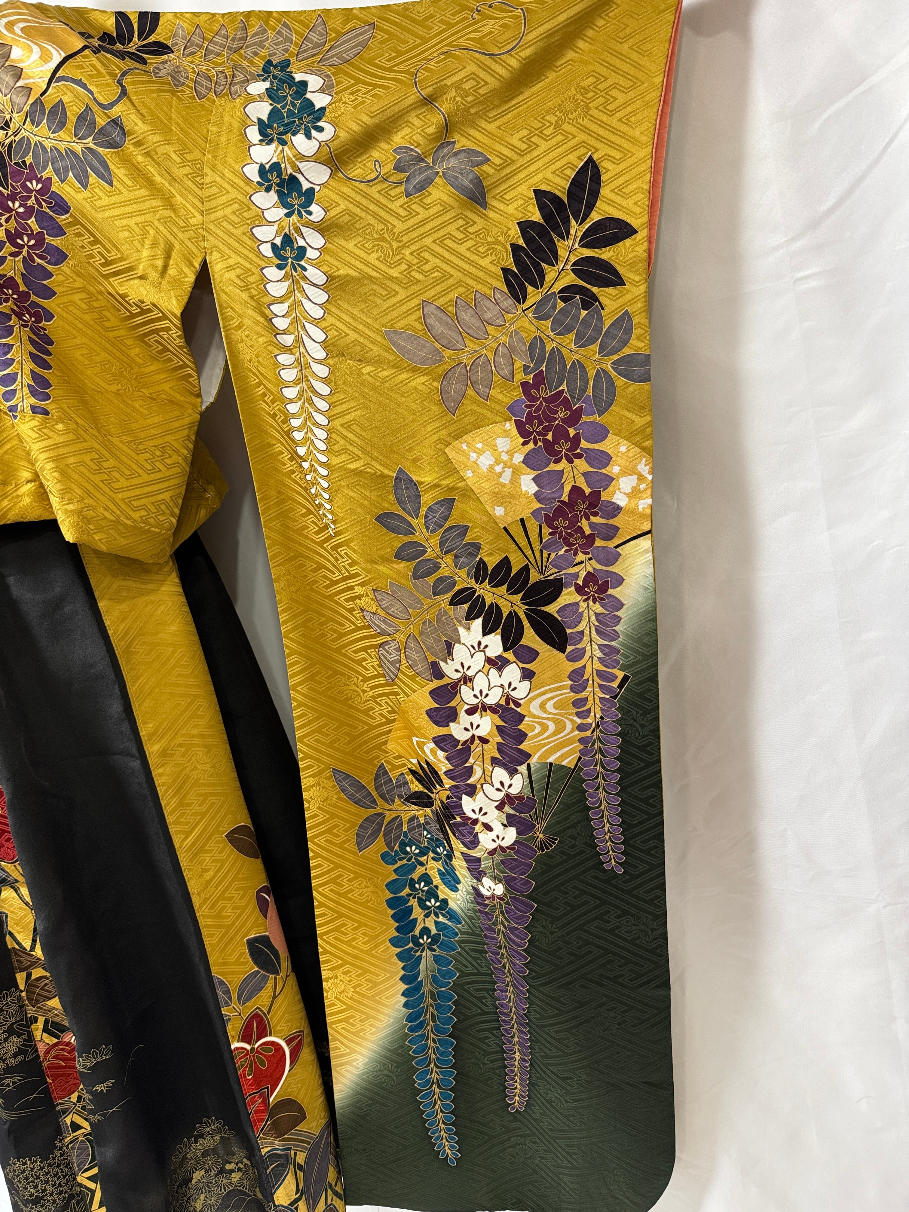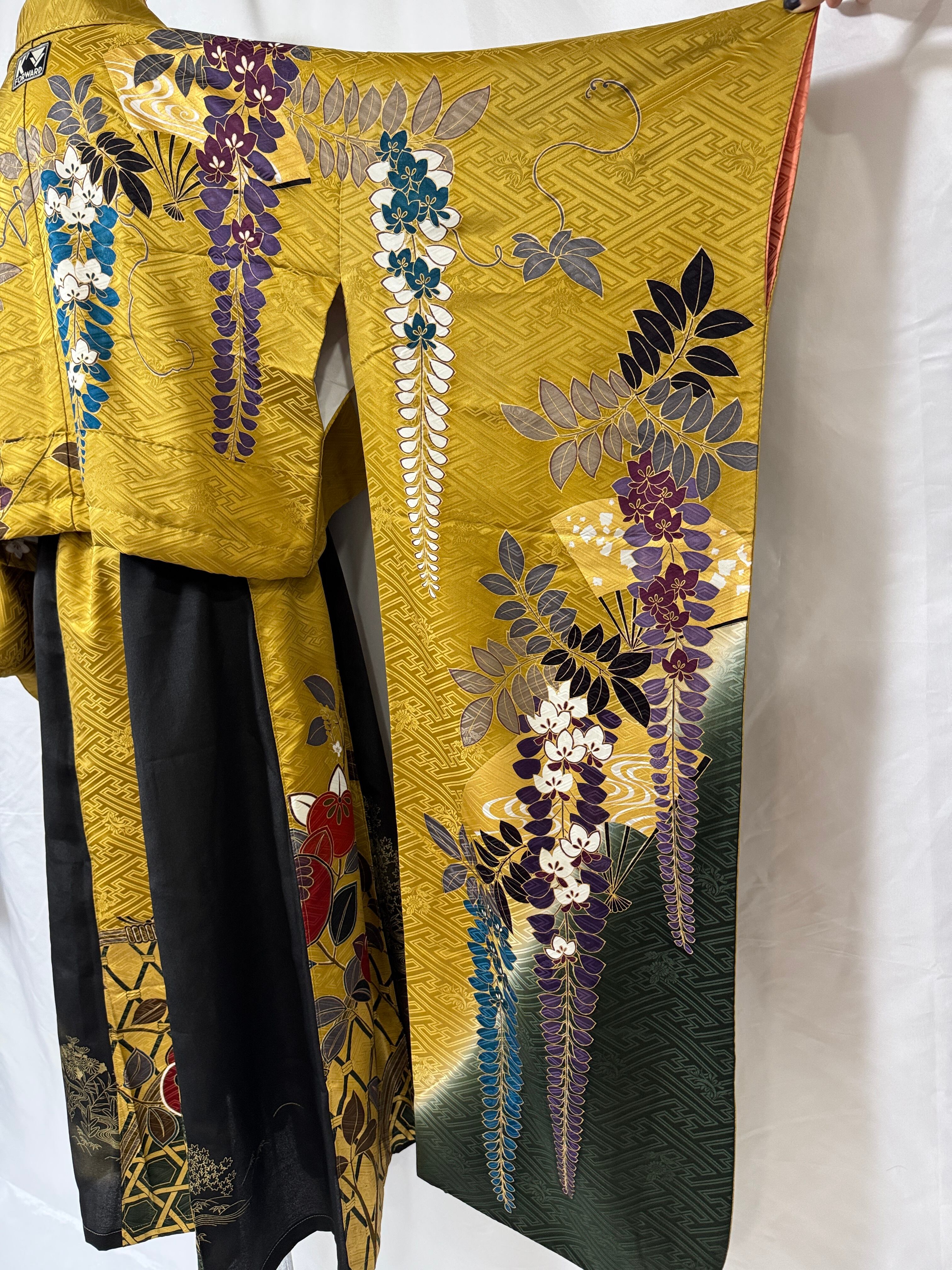 The mustard-colored furisode, adorned with flowing wisteria blossoms, exudes an elegant yet vibrant impression.