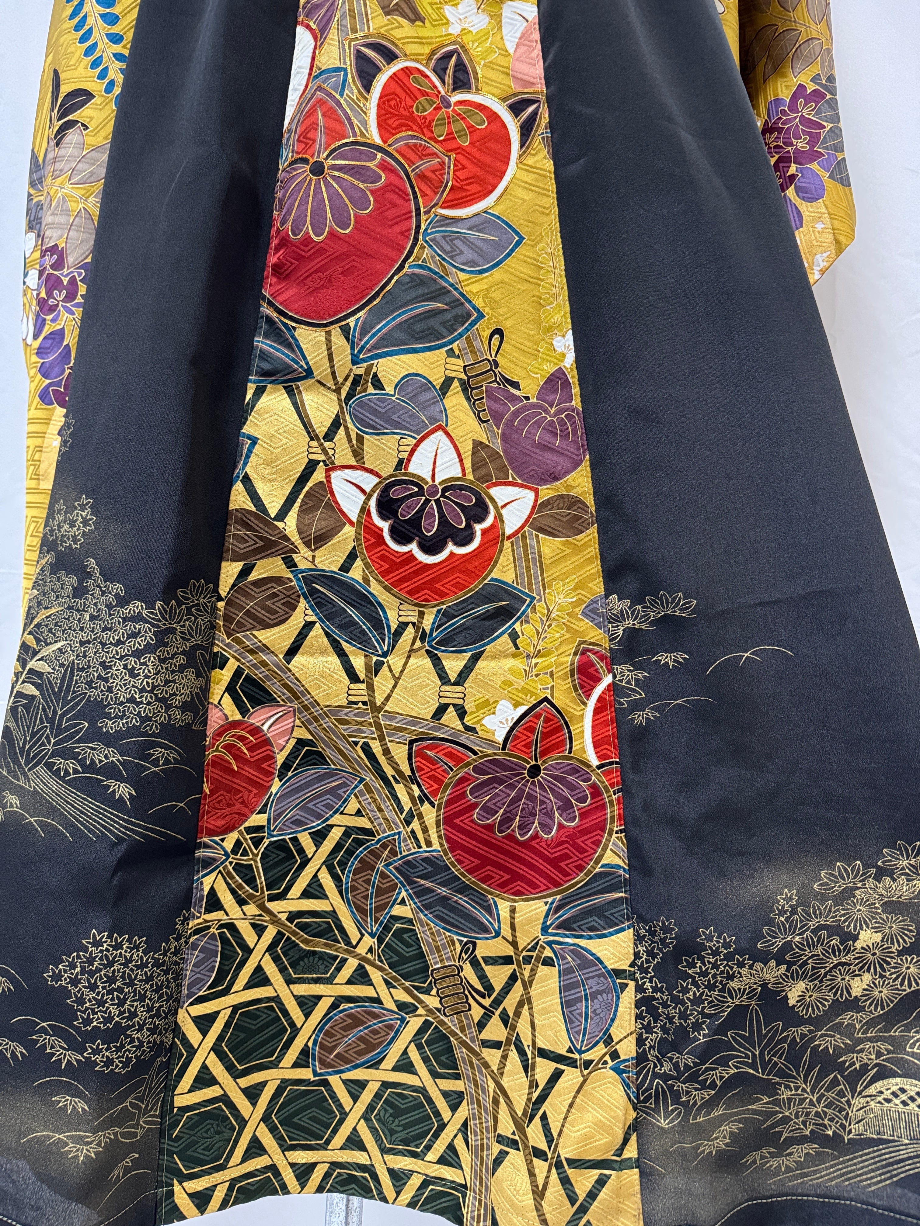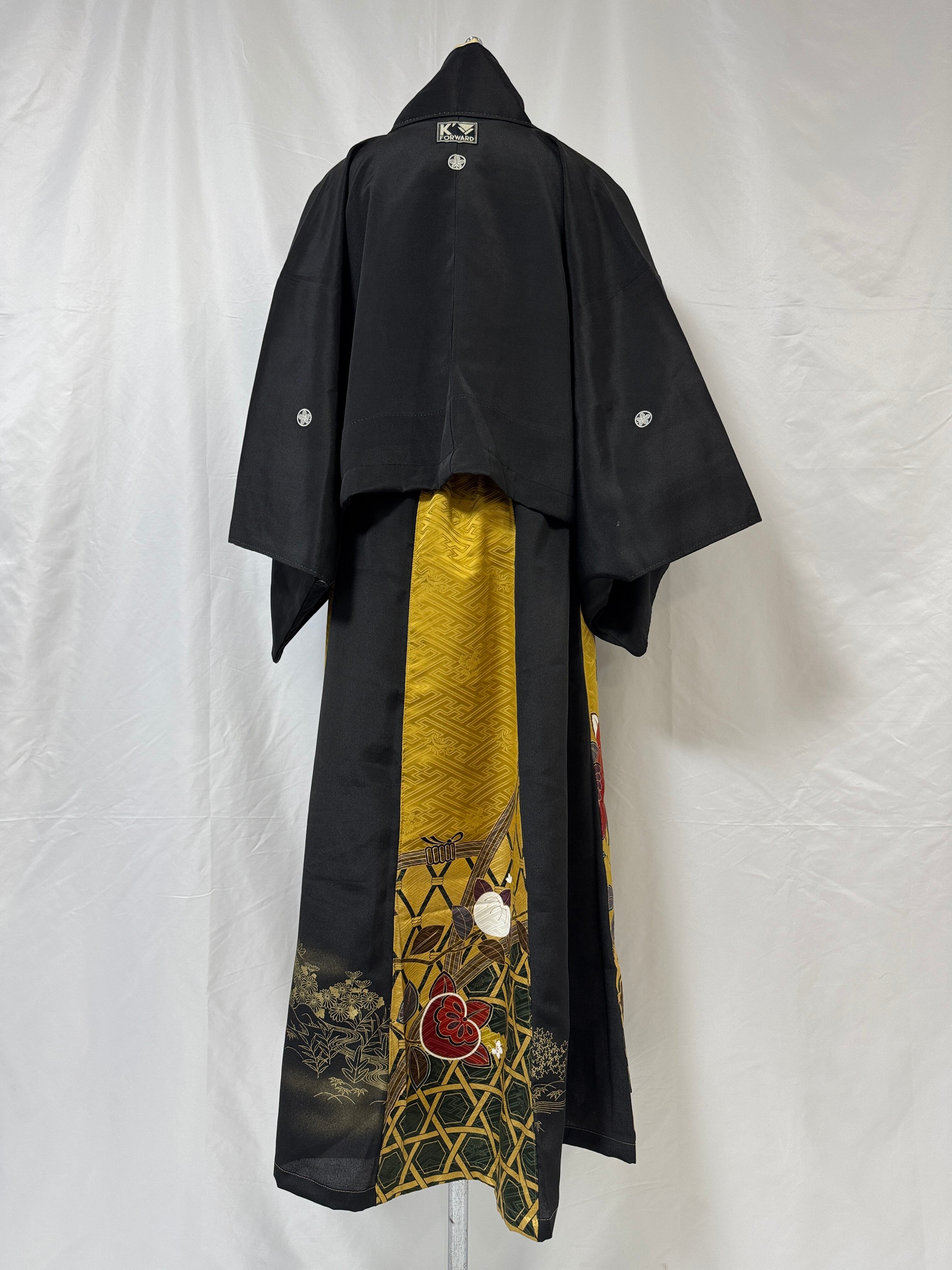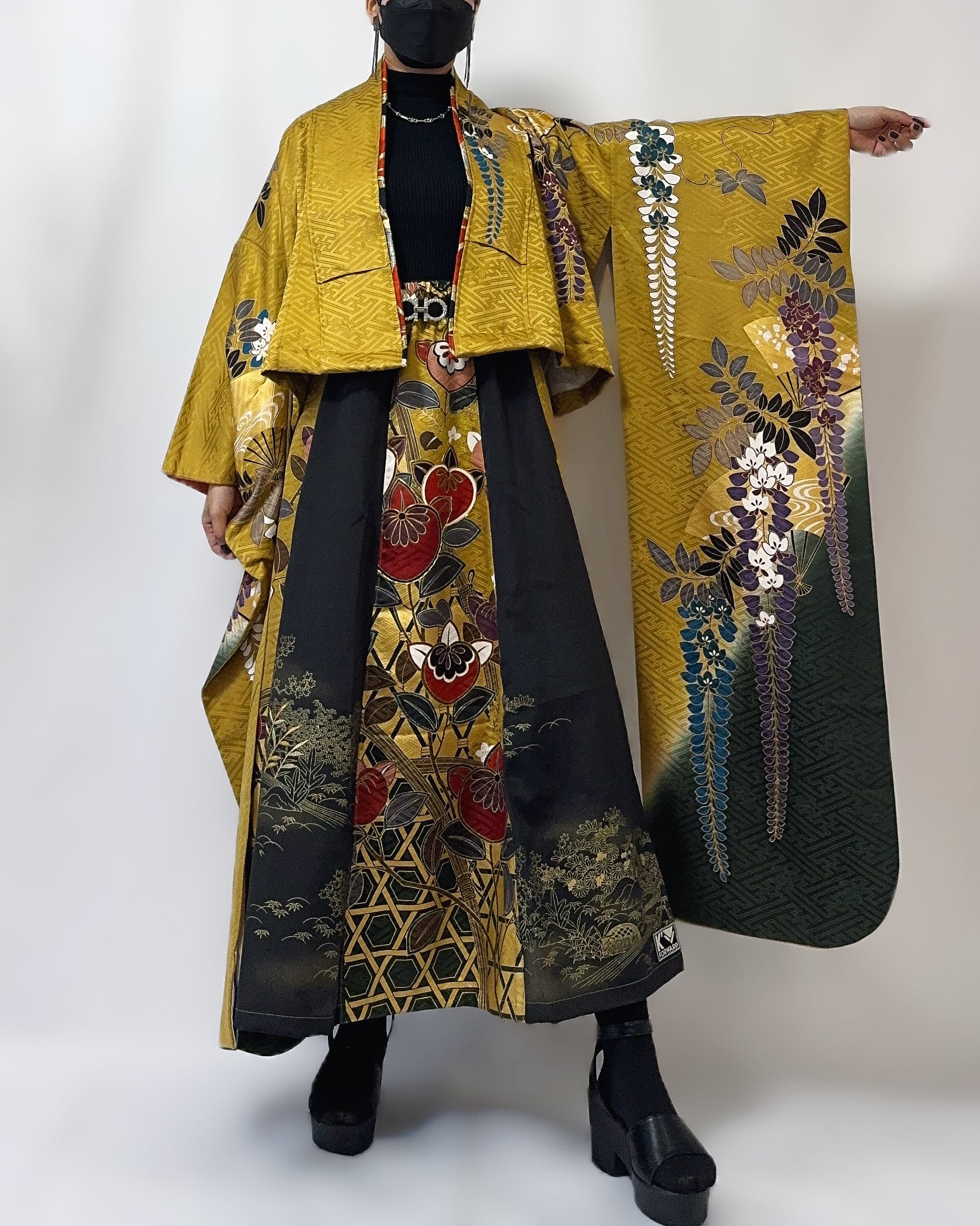 An upcycled two-piece set featuring traditional Japanese garments: ‘furisode’ and ‘tomesode’.
