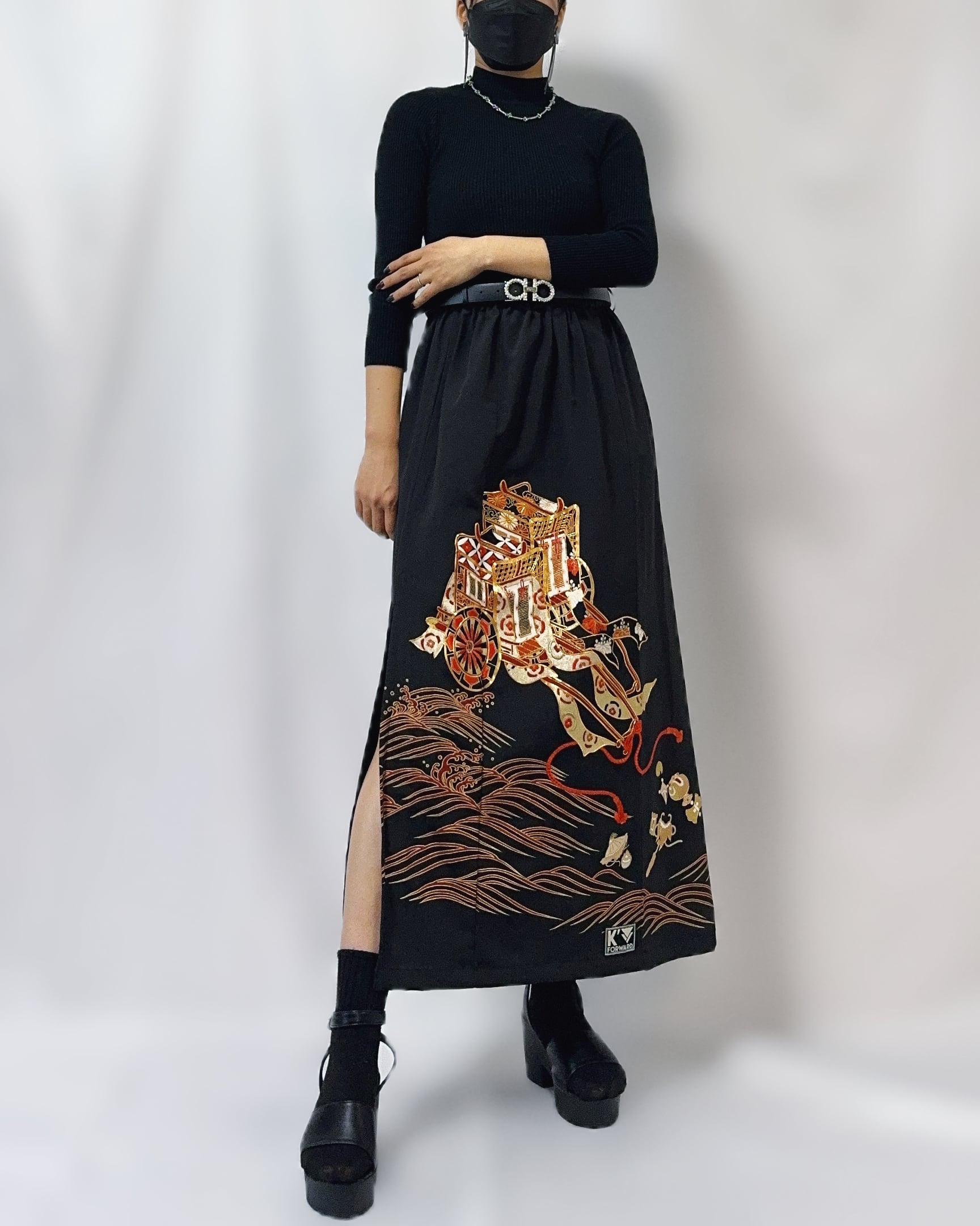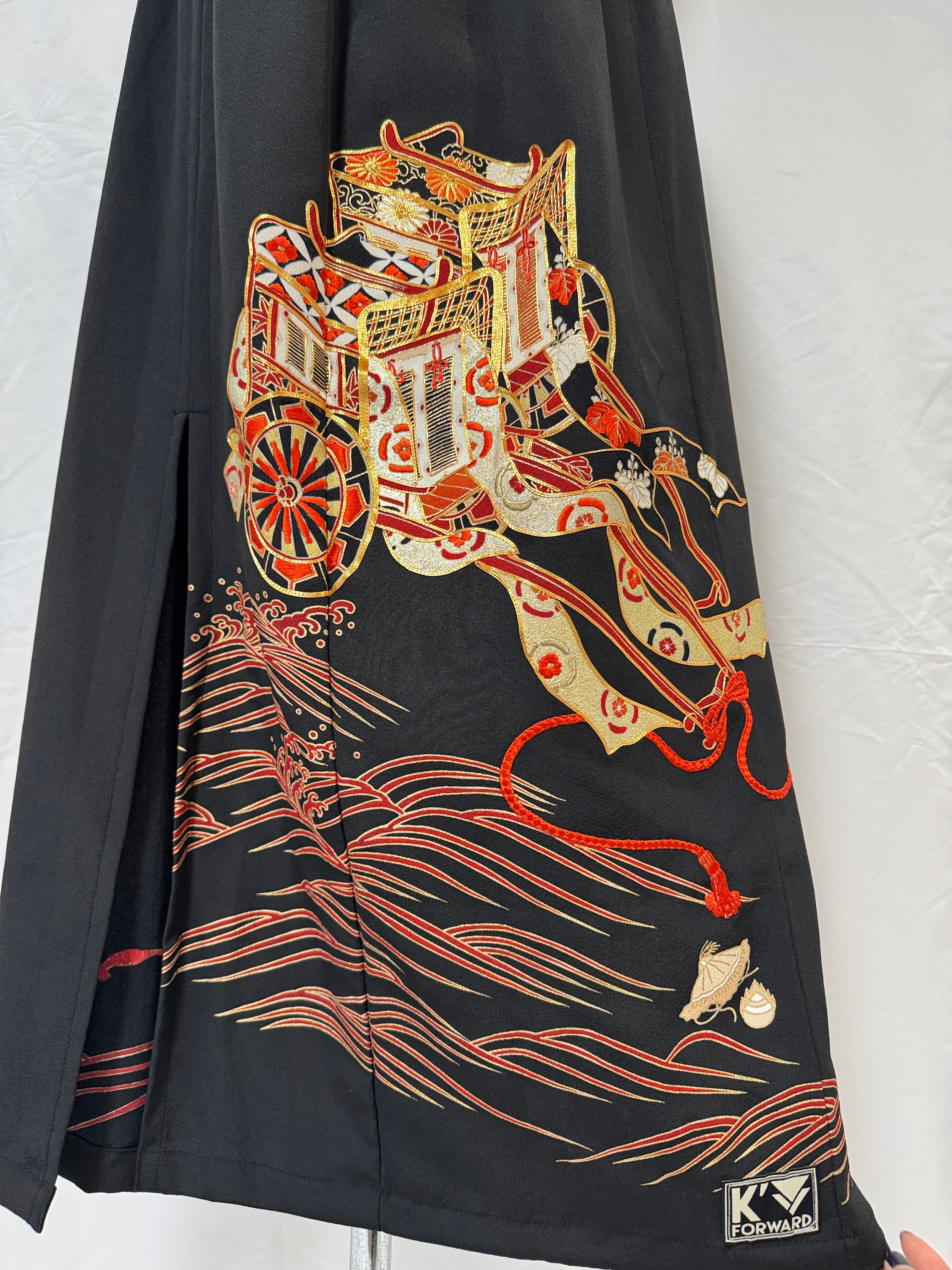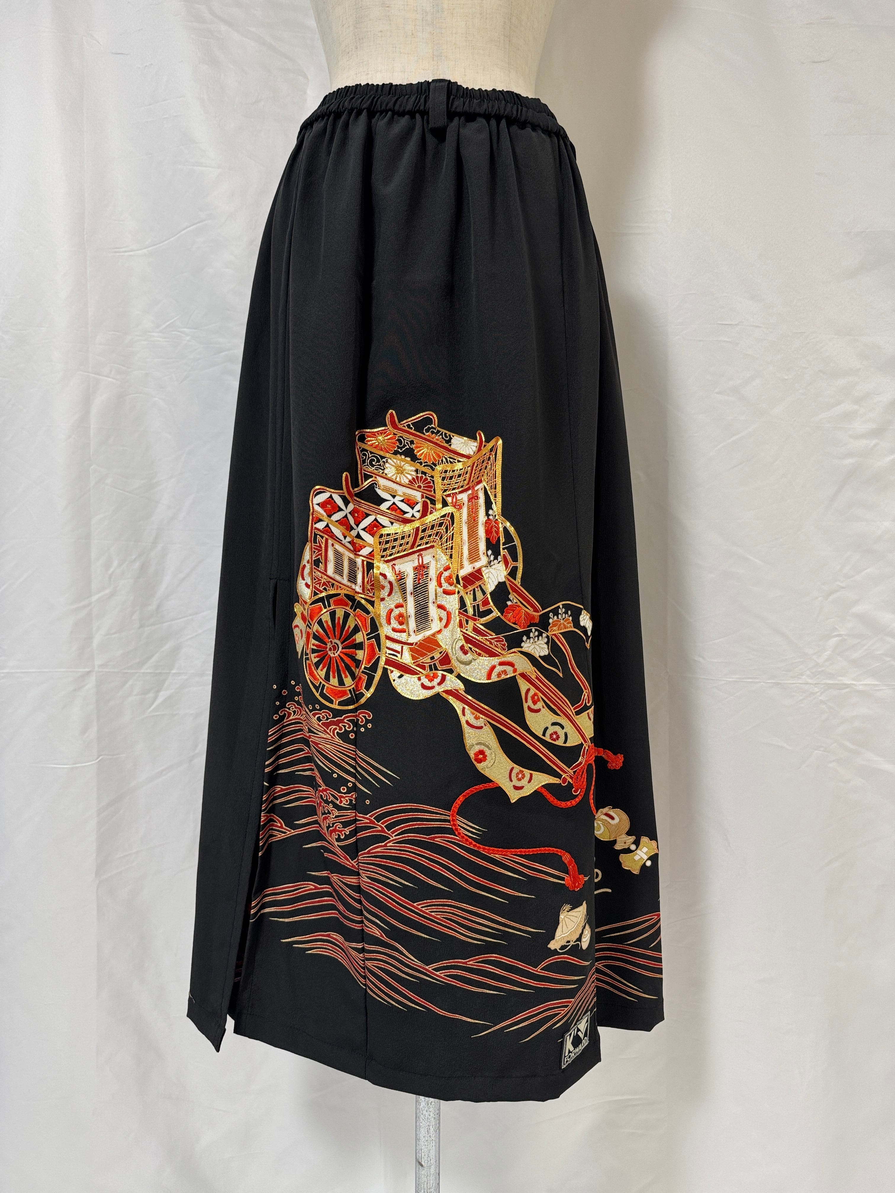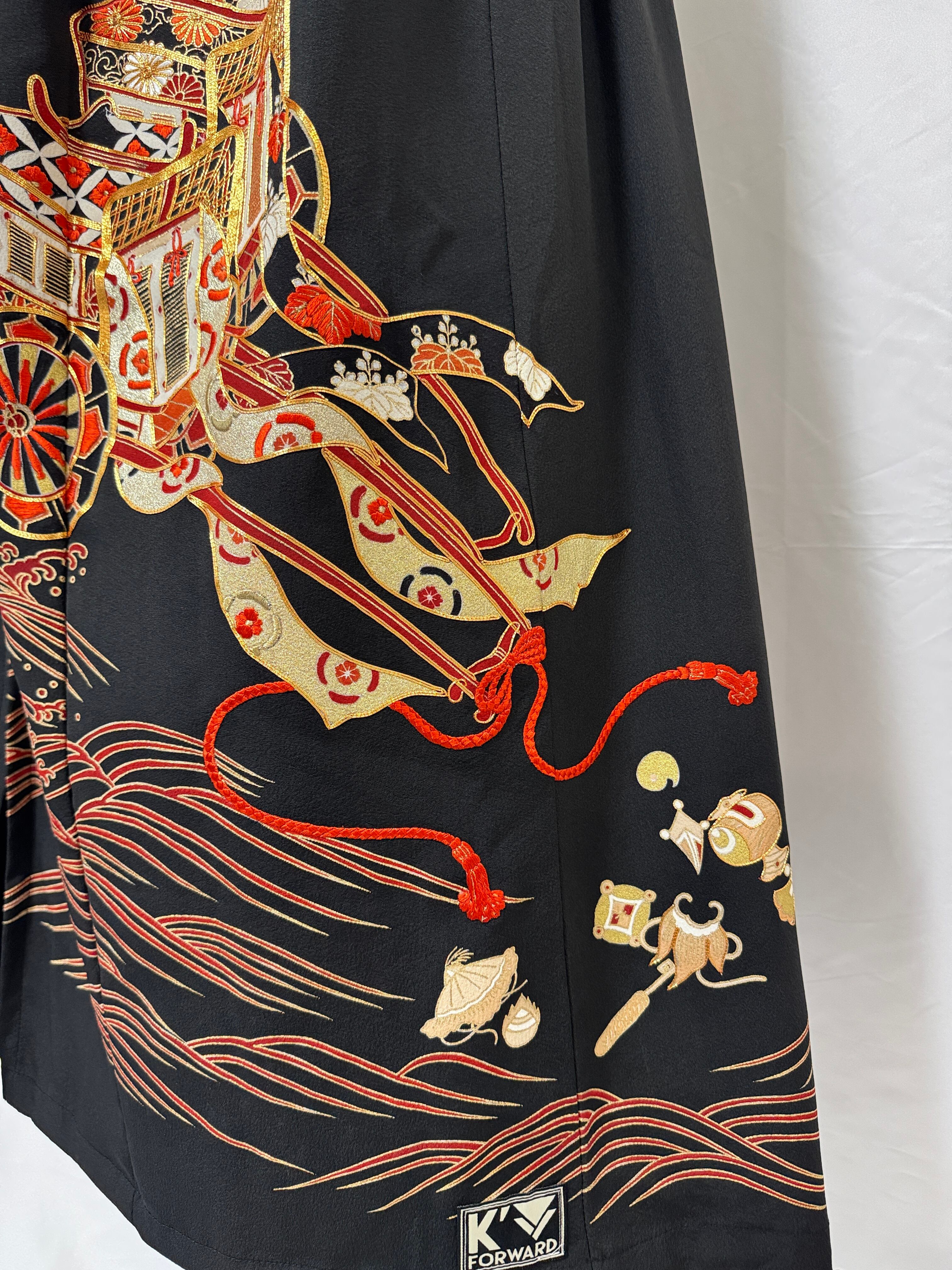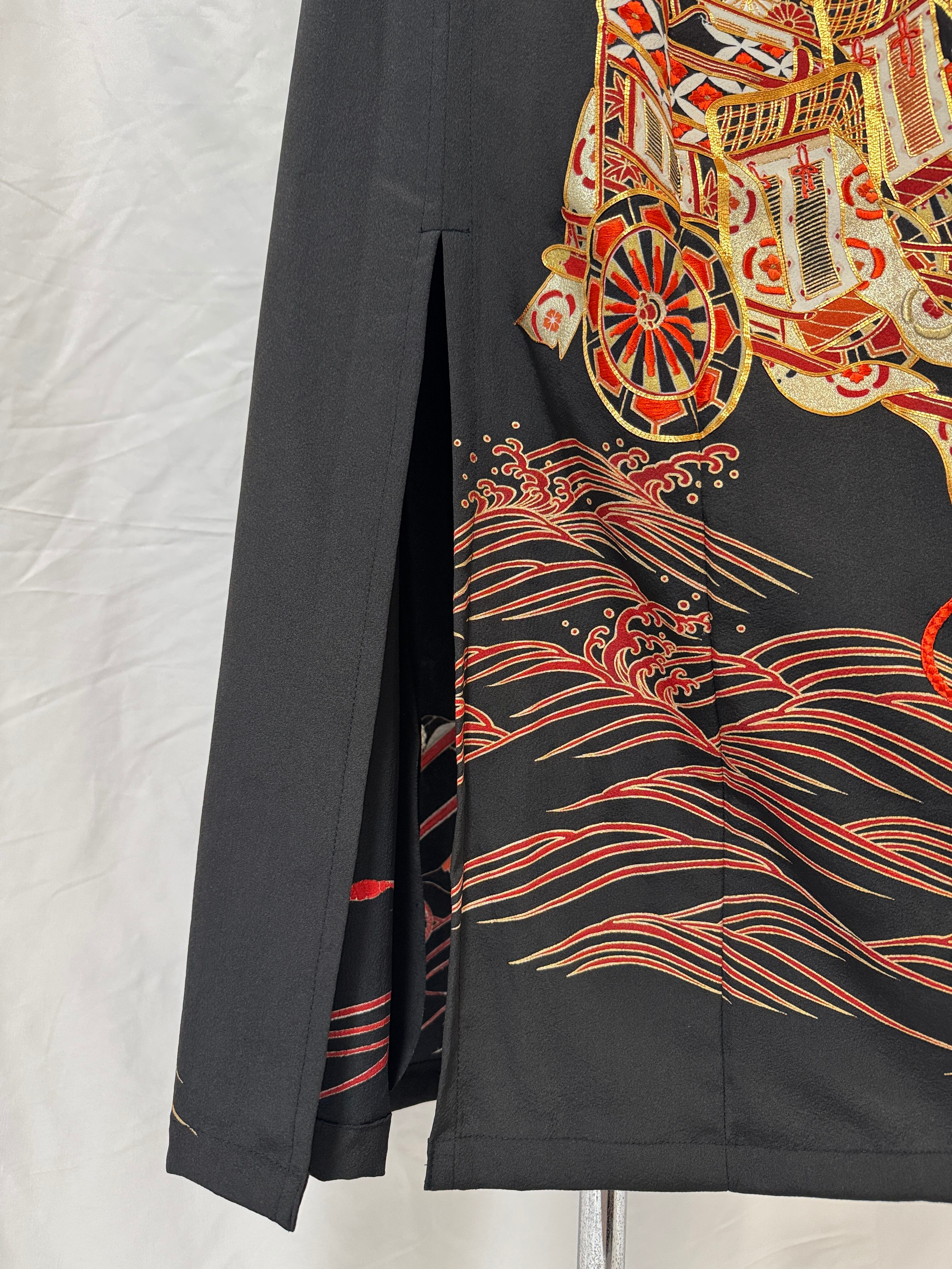 A one-of-a-kind remake skirt born from a formal black tomesode kimono.