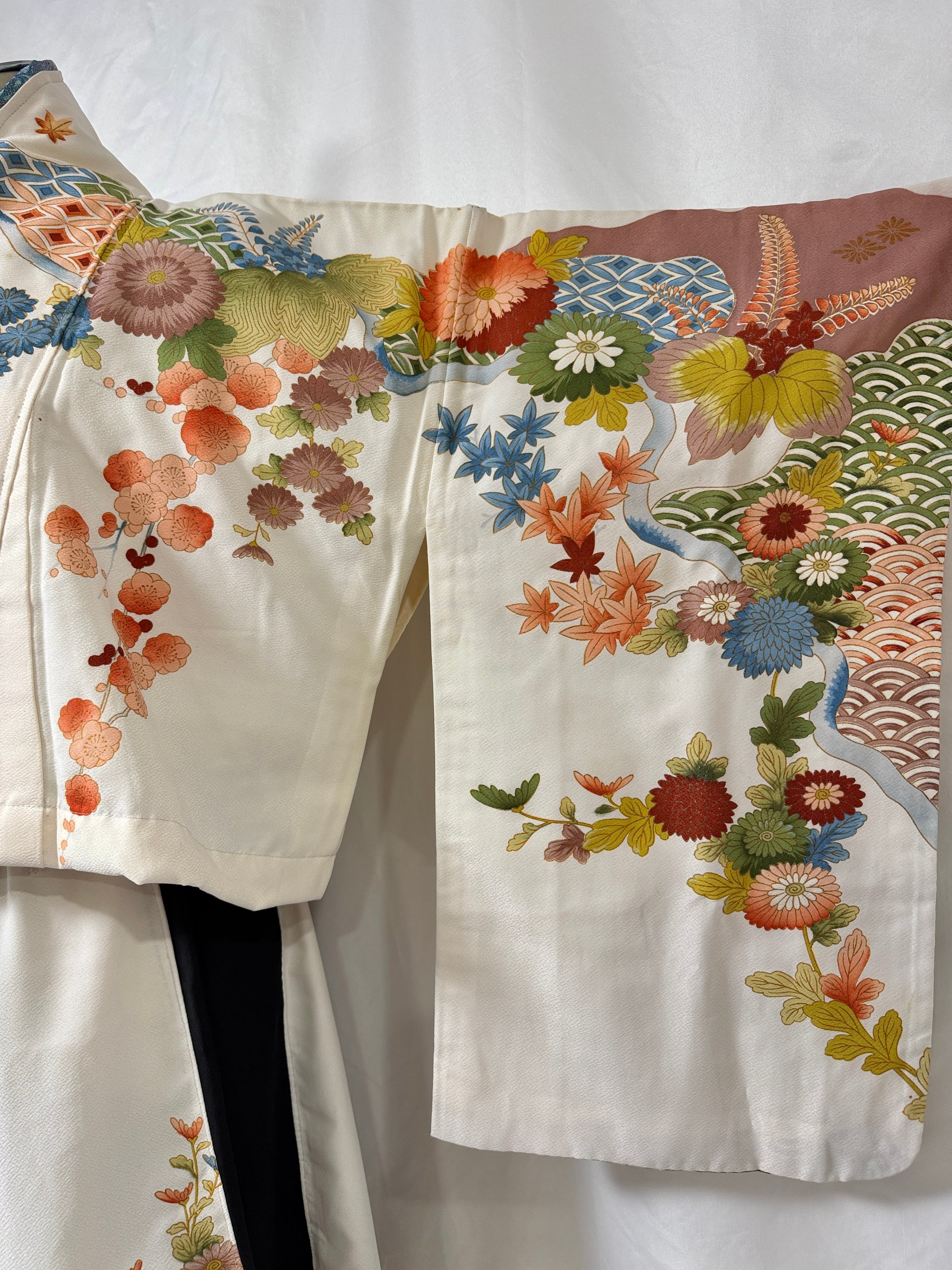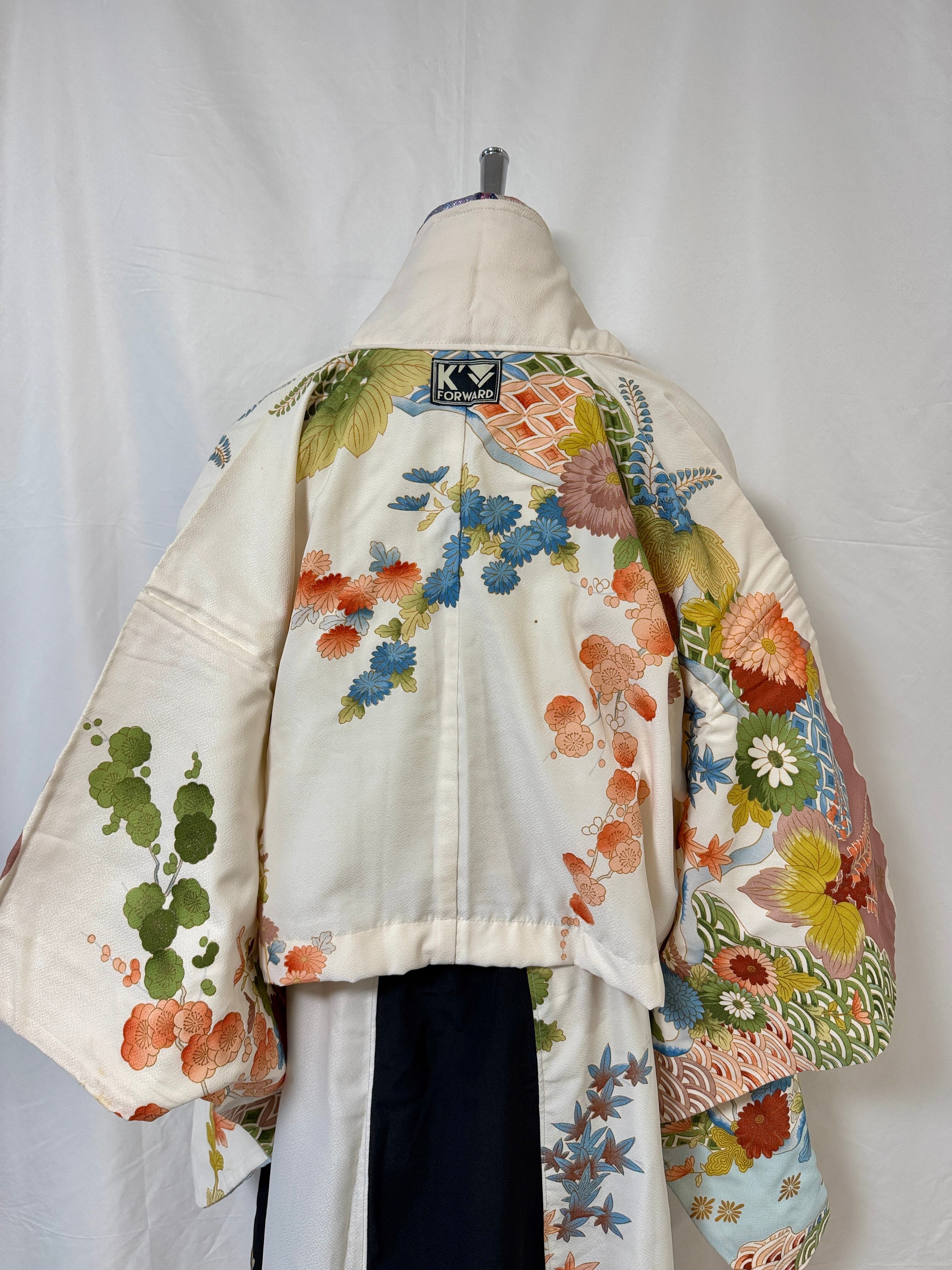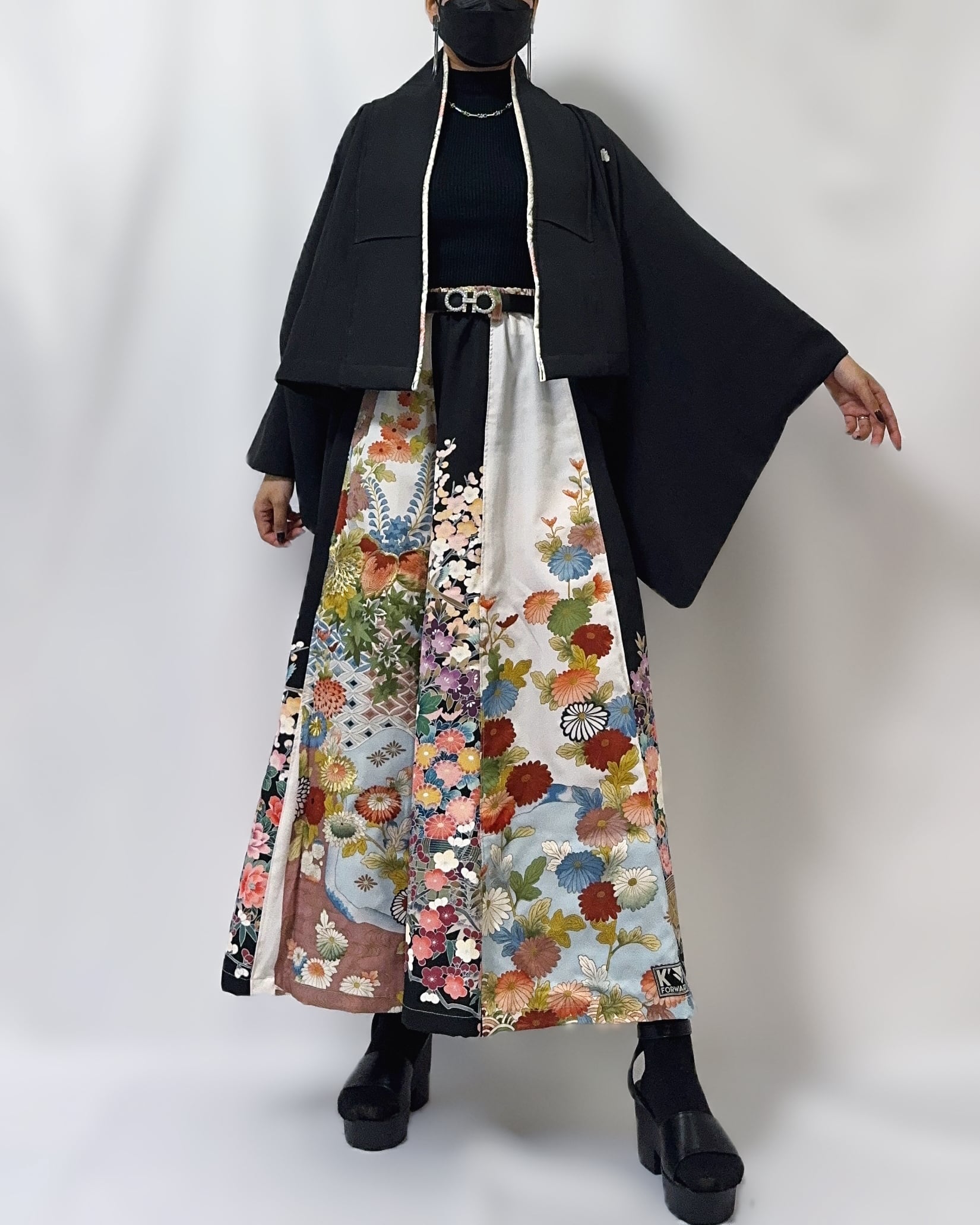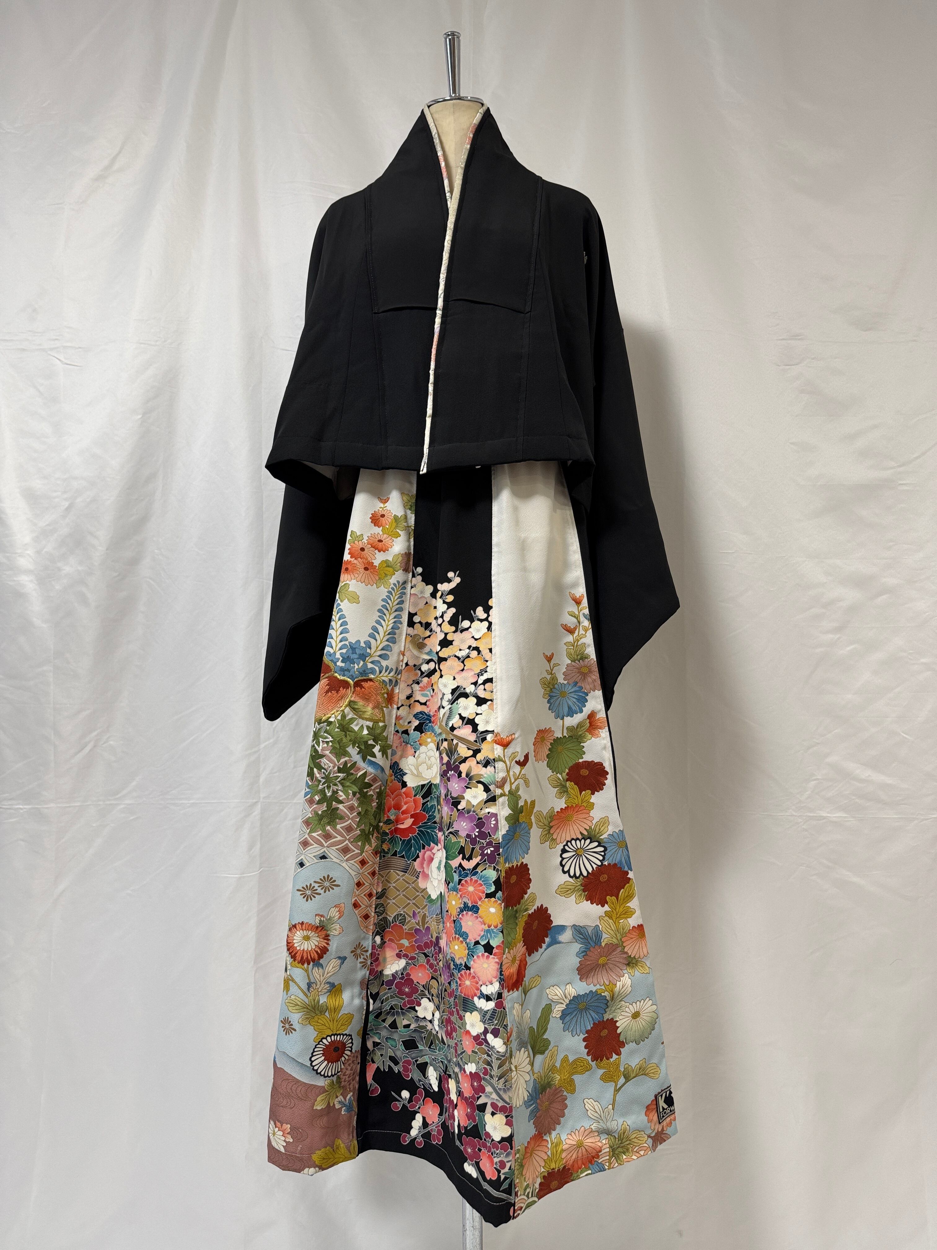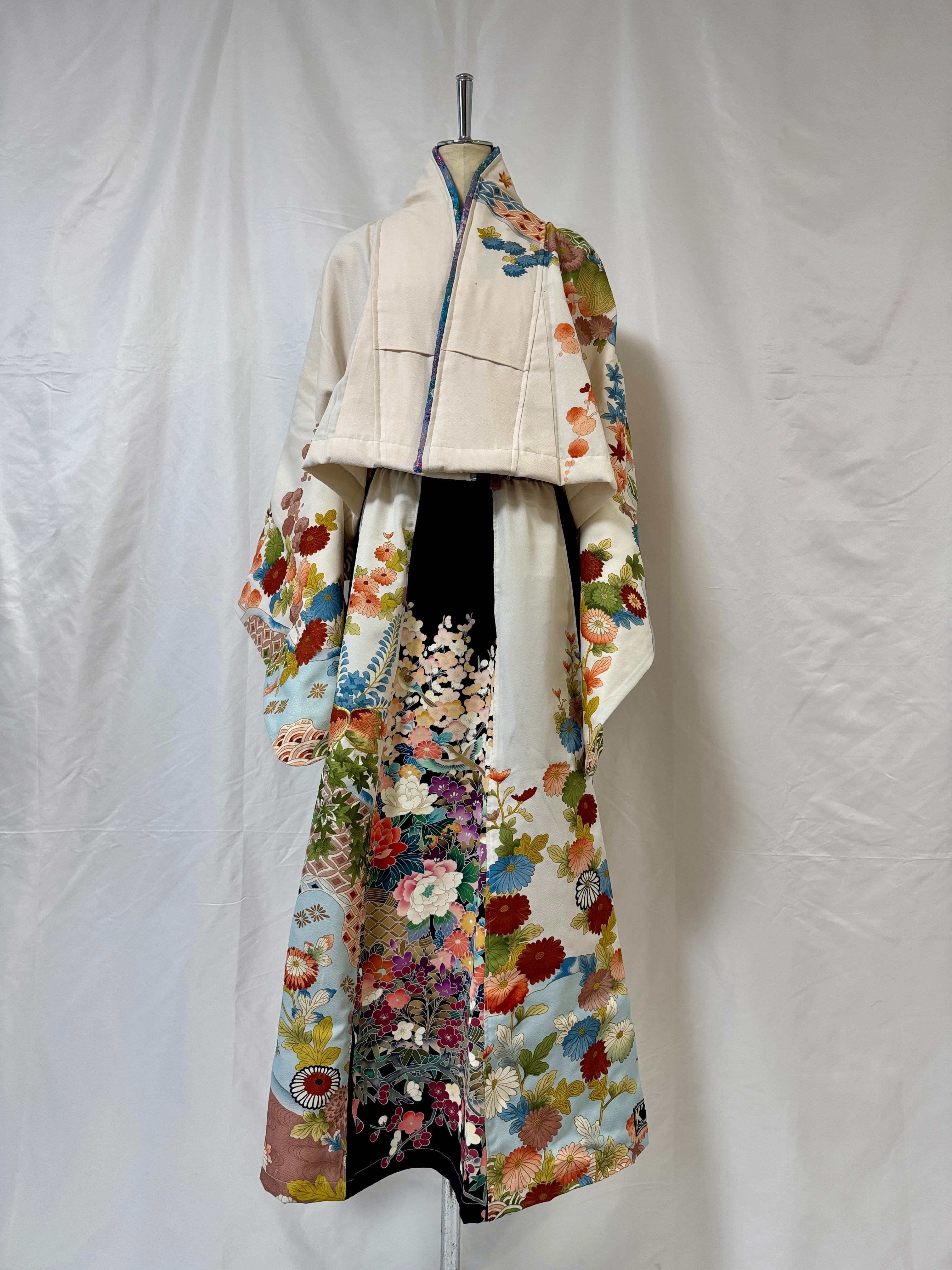 ヴィンテージの訪問着と留袖を用いて仕立てた、K´FORWARDの一点物セットアップ。
