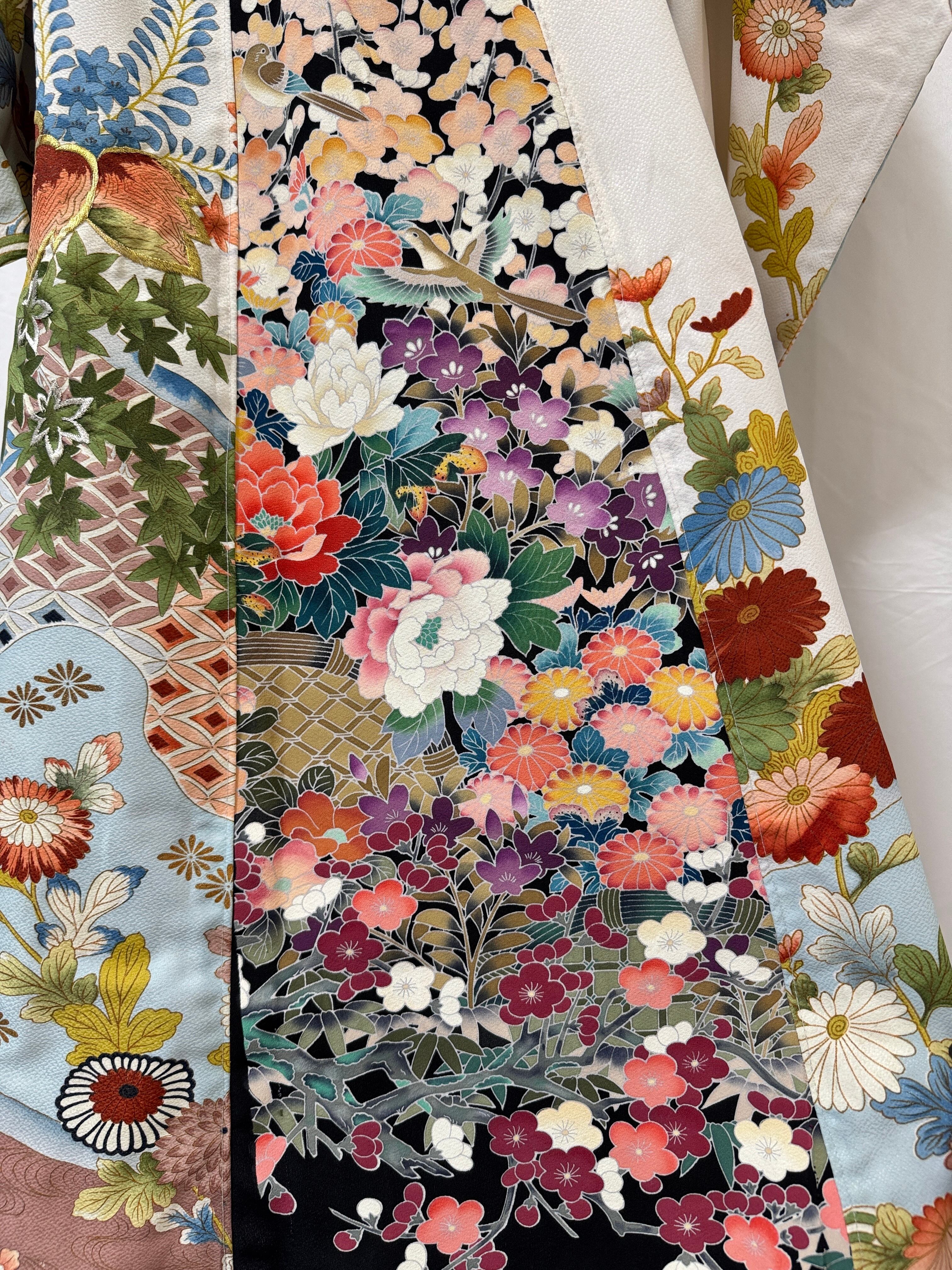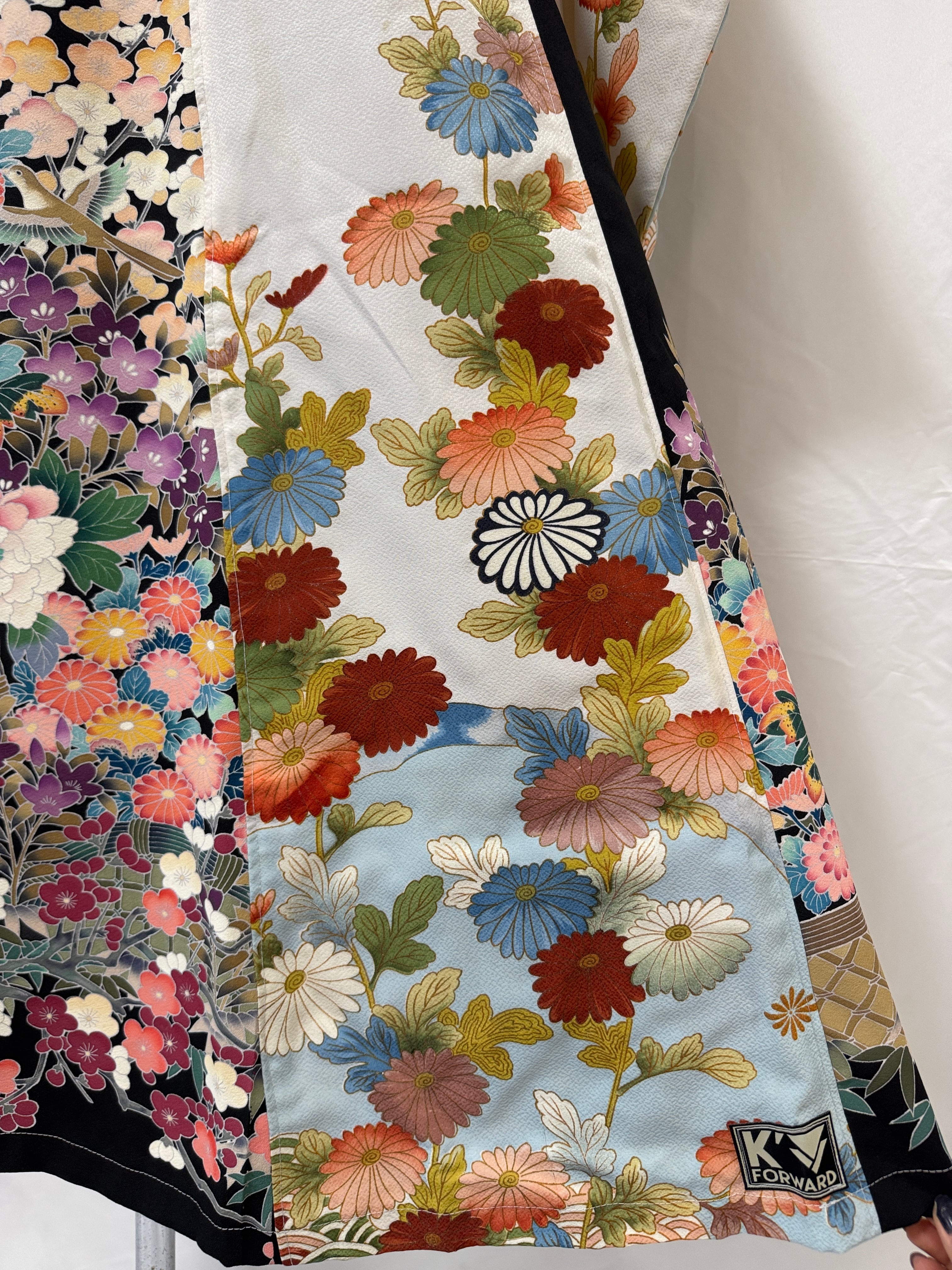 スカートには、2着の着物(訪問着と留袖)の裾柄を交互に配置。