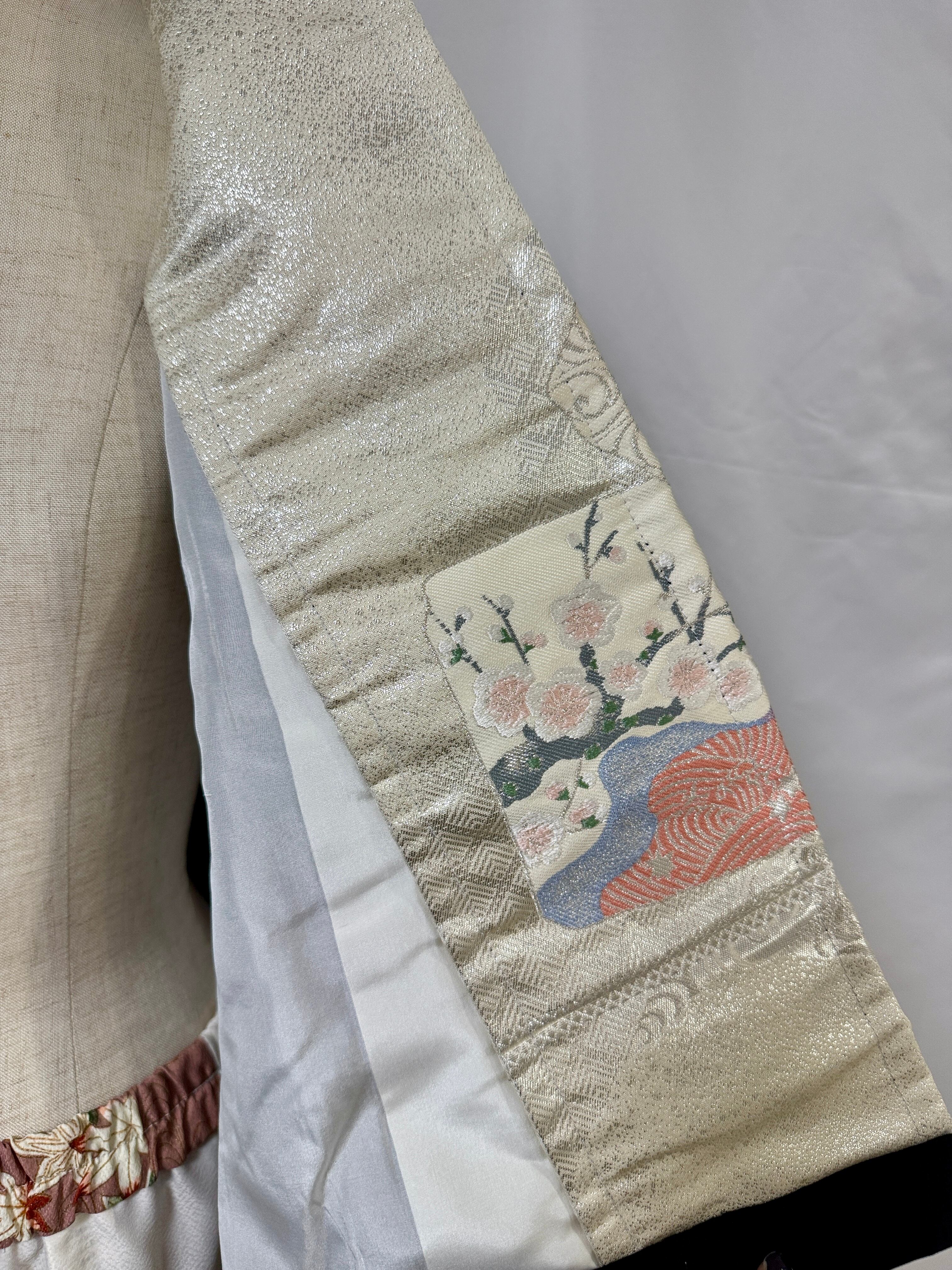 どちらのジャケットにも、襟裏に帯地をあしらっており、羽織ったときにちらりと見える帯柄が上品なアクセントに。