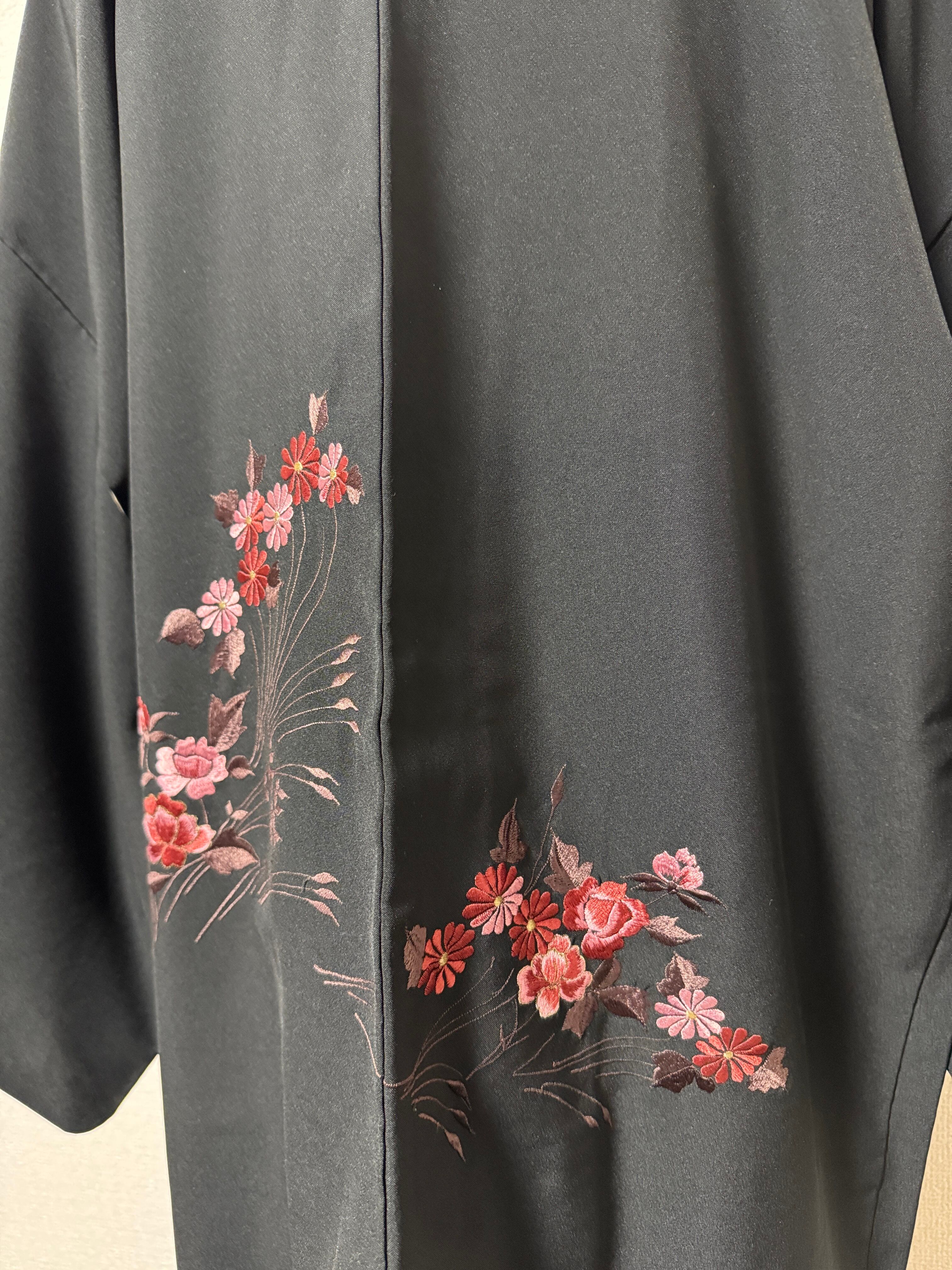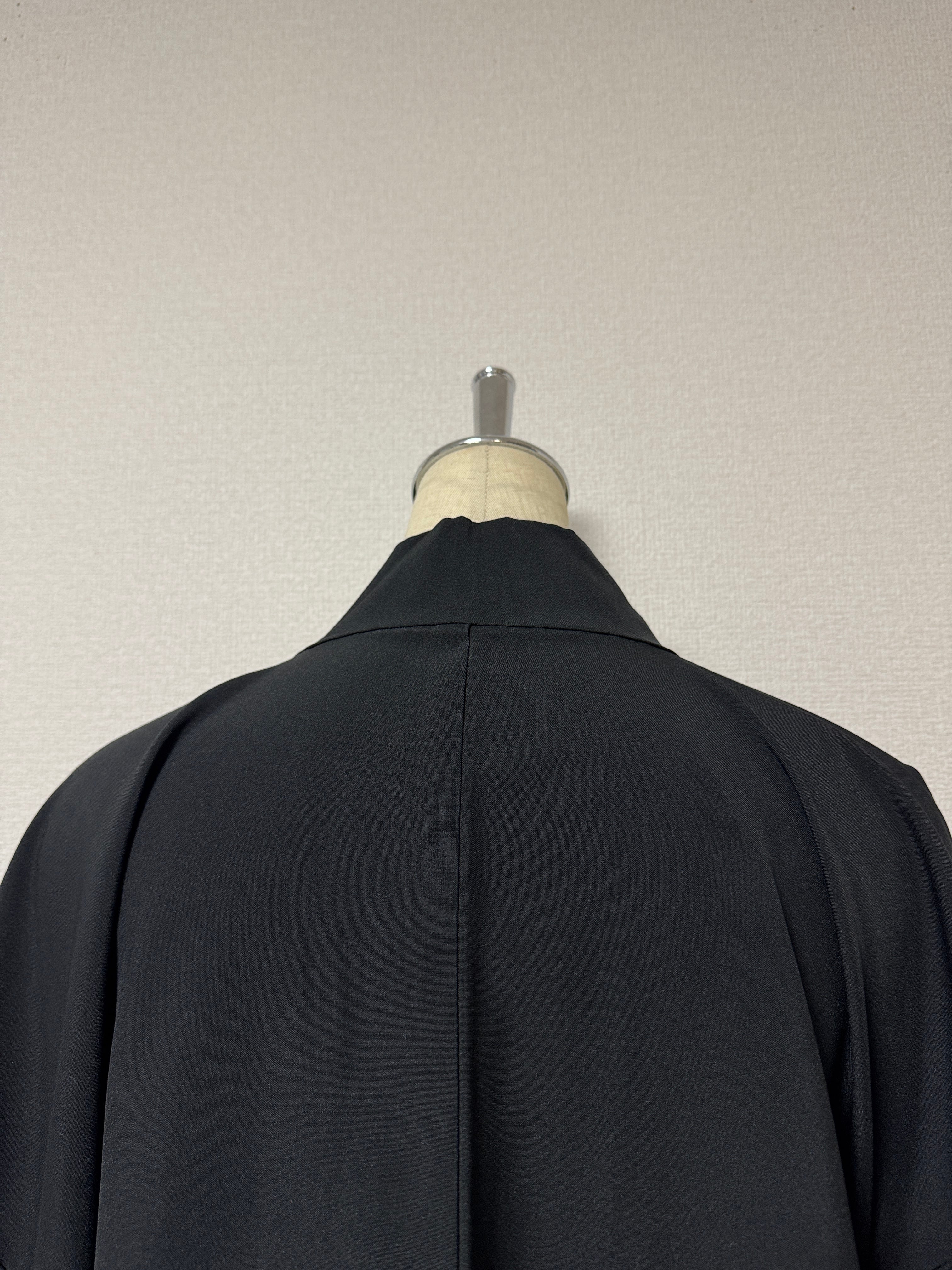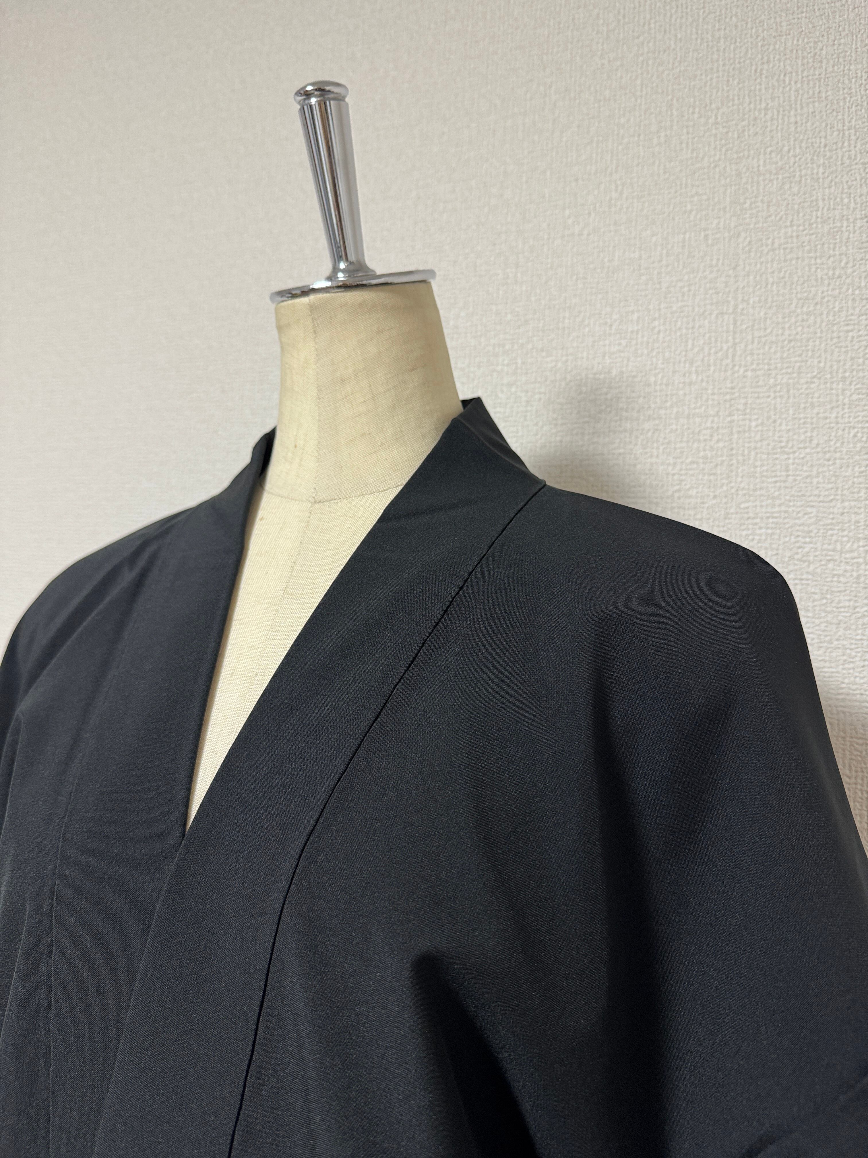 The kimono's unique design and deep black color make it a special piece of clothing.