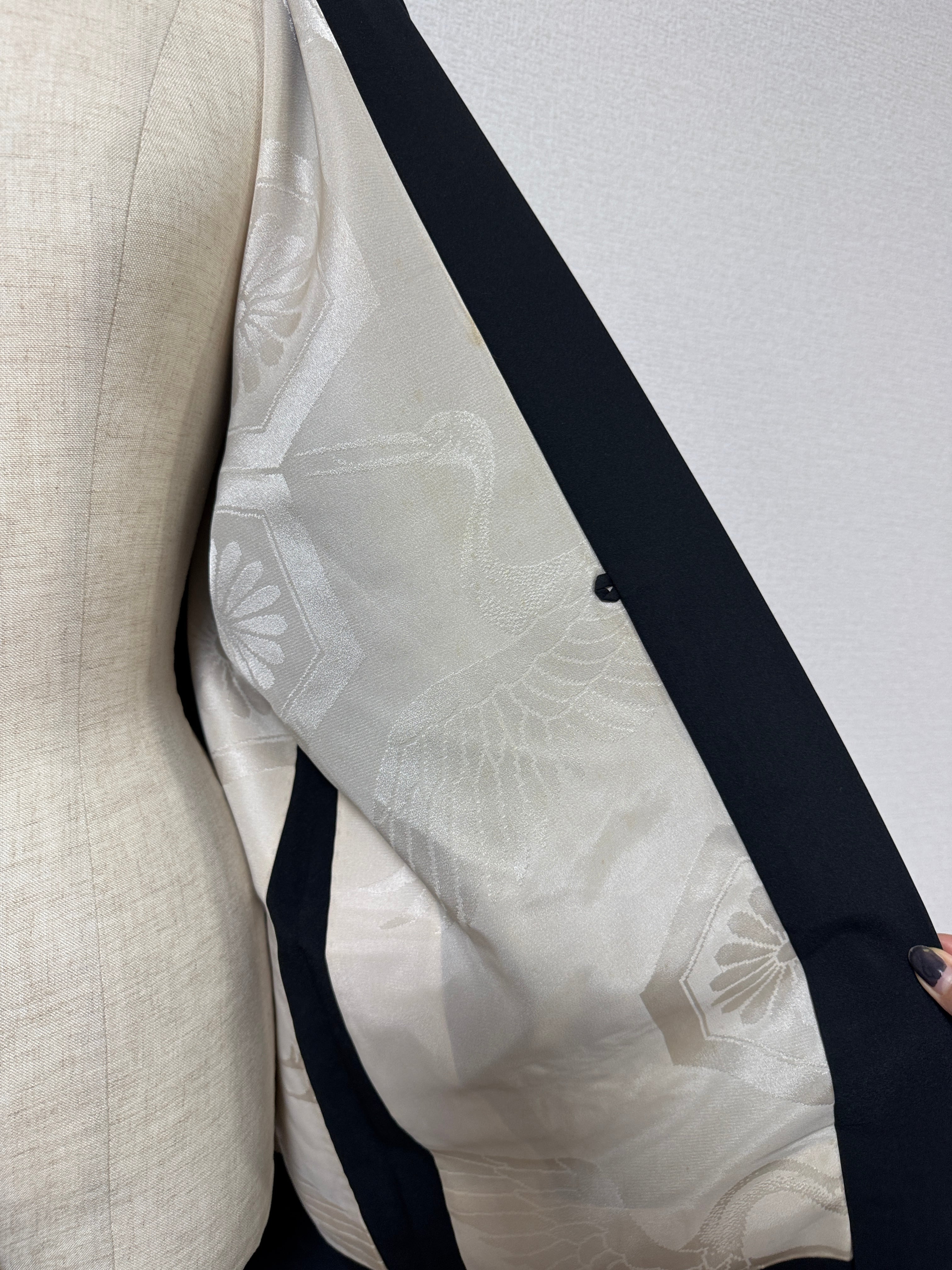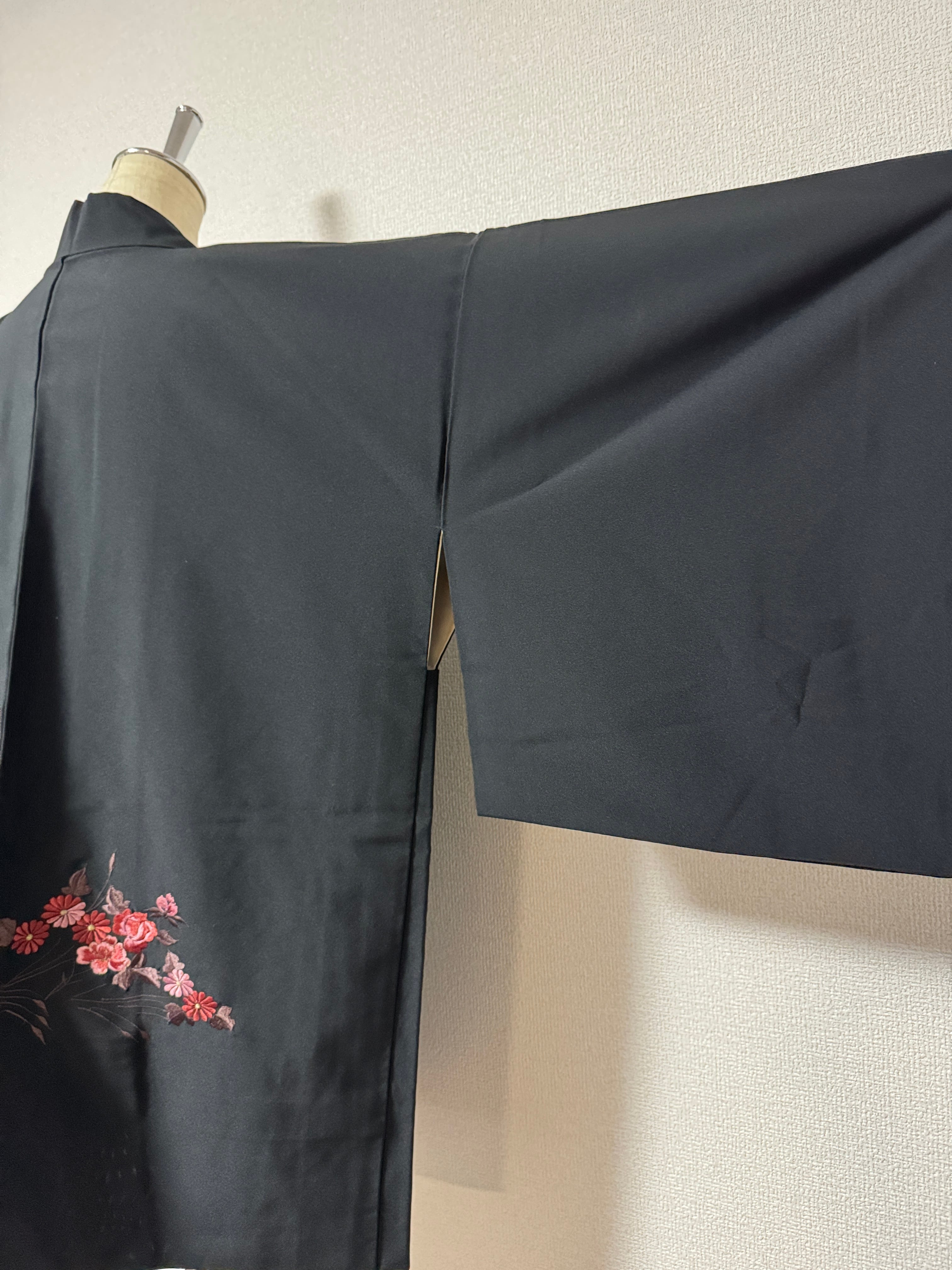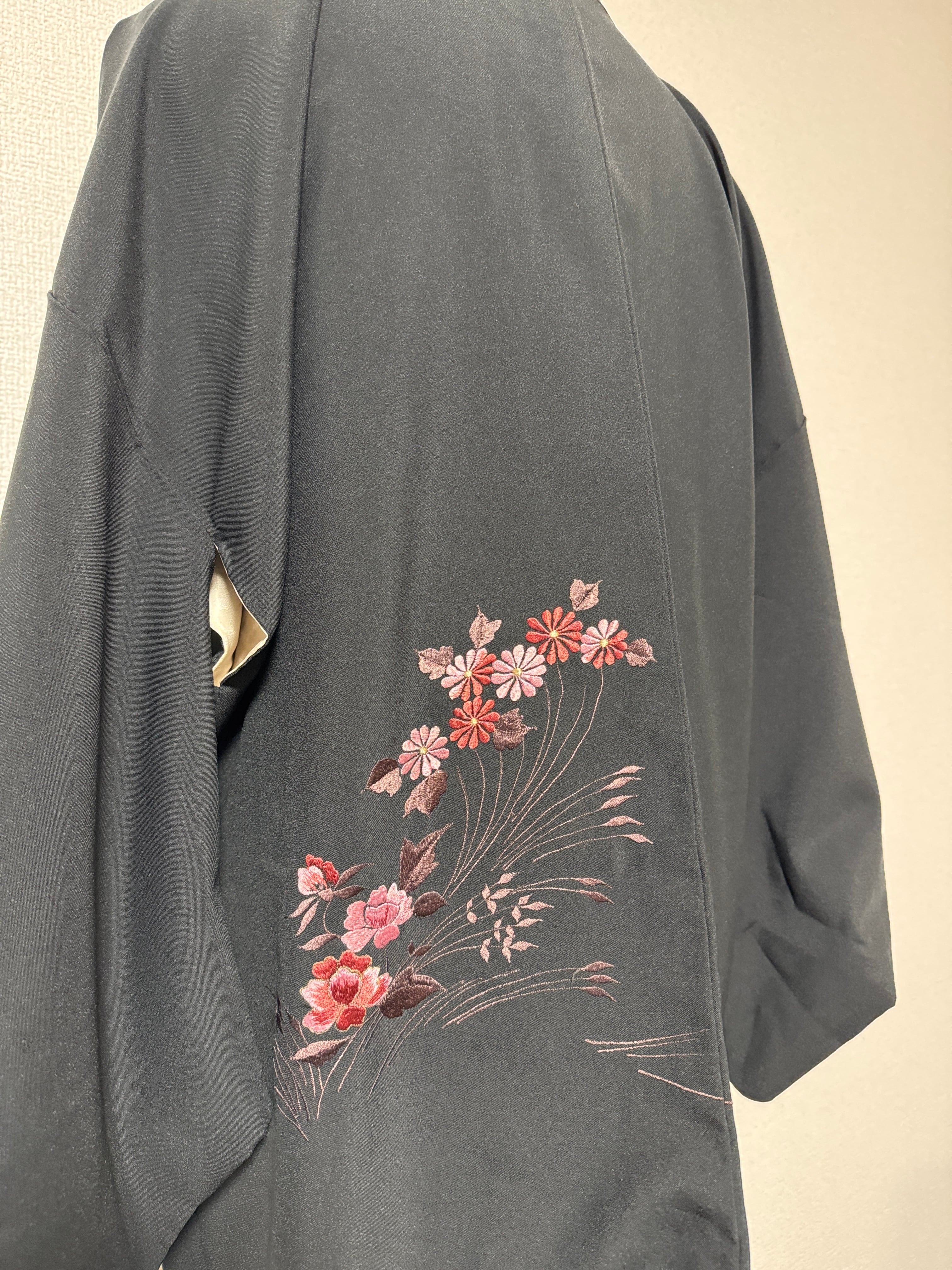 The kimono's unique design and deep black color make it a special piece of clothing.