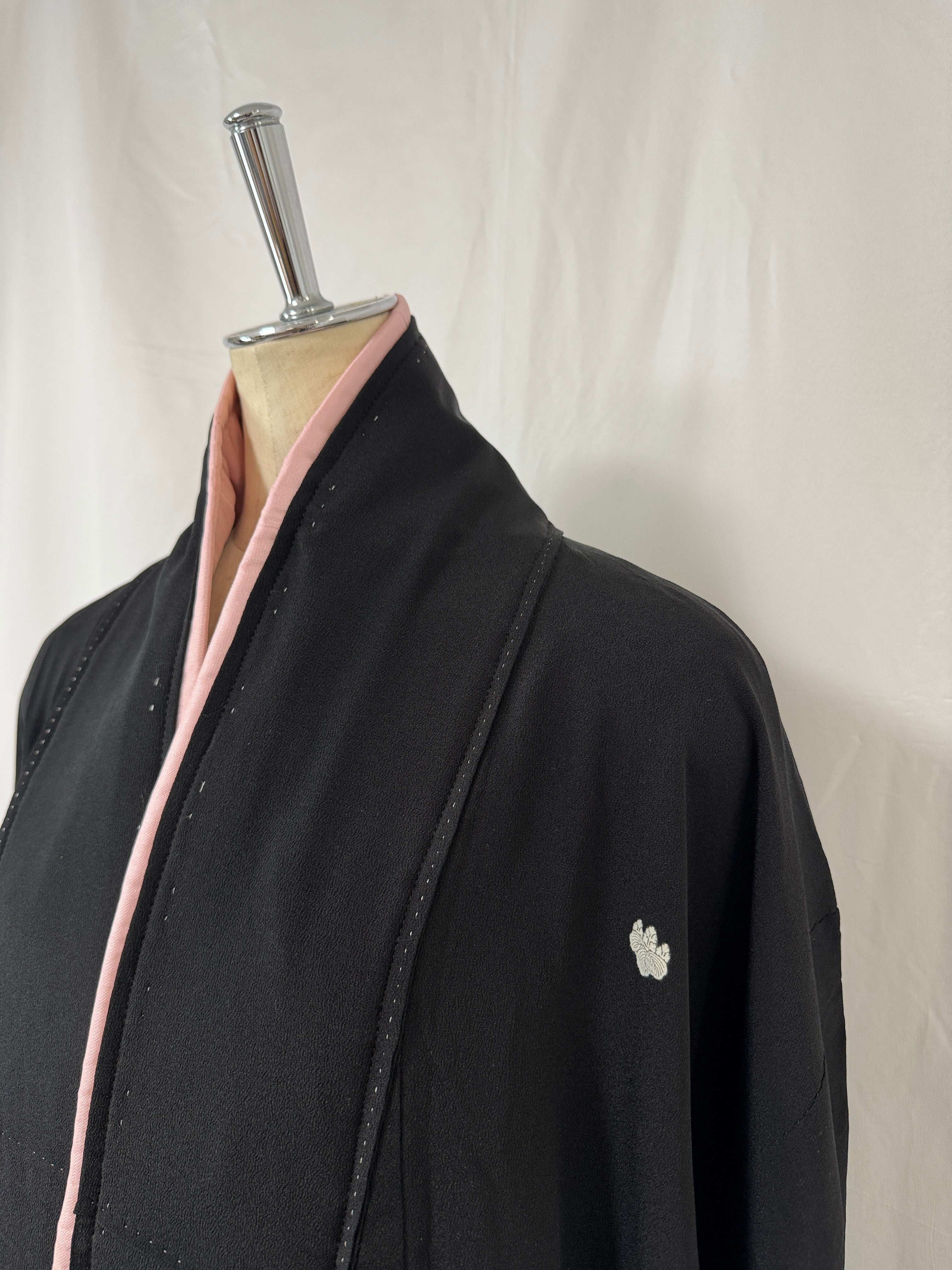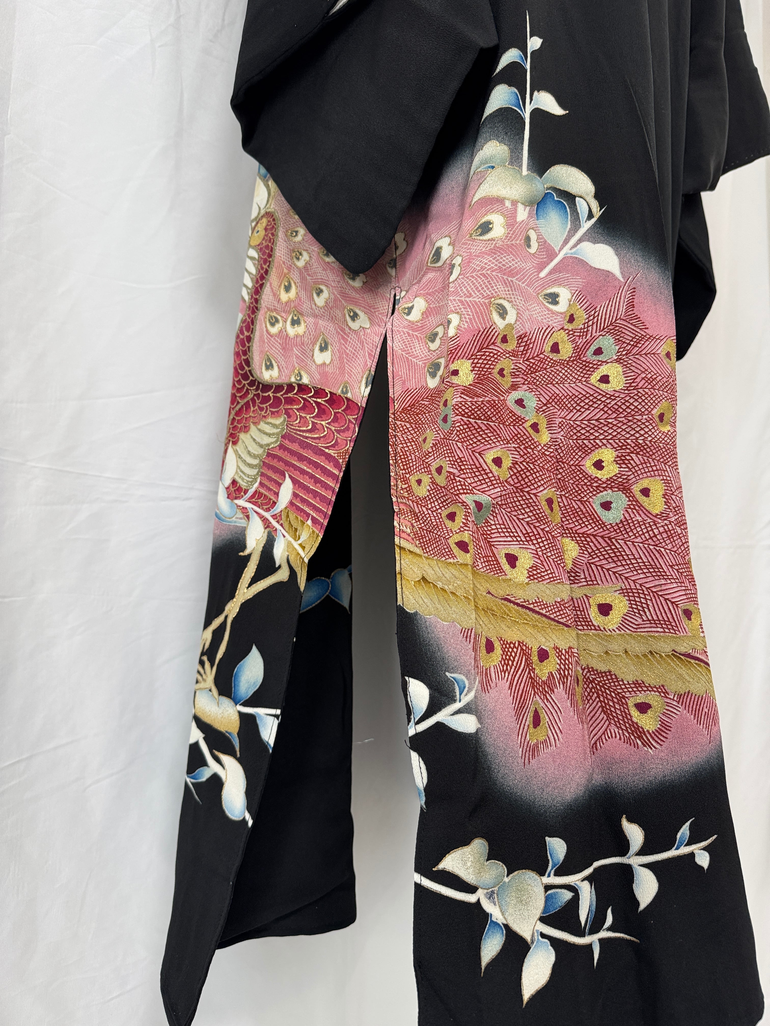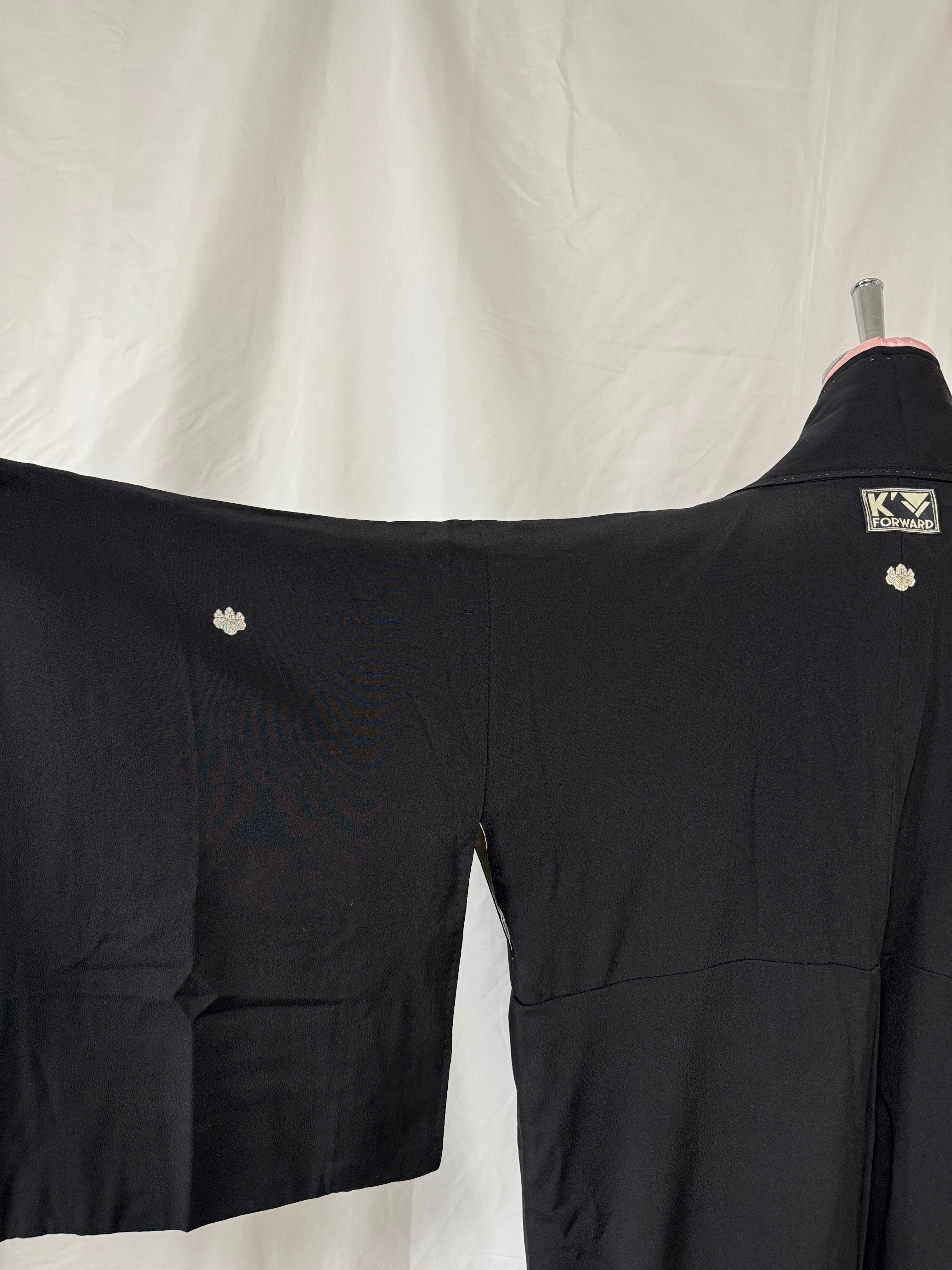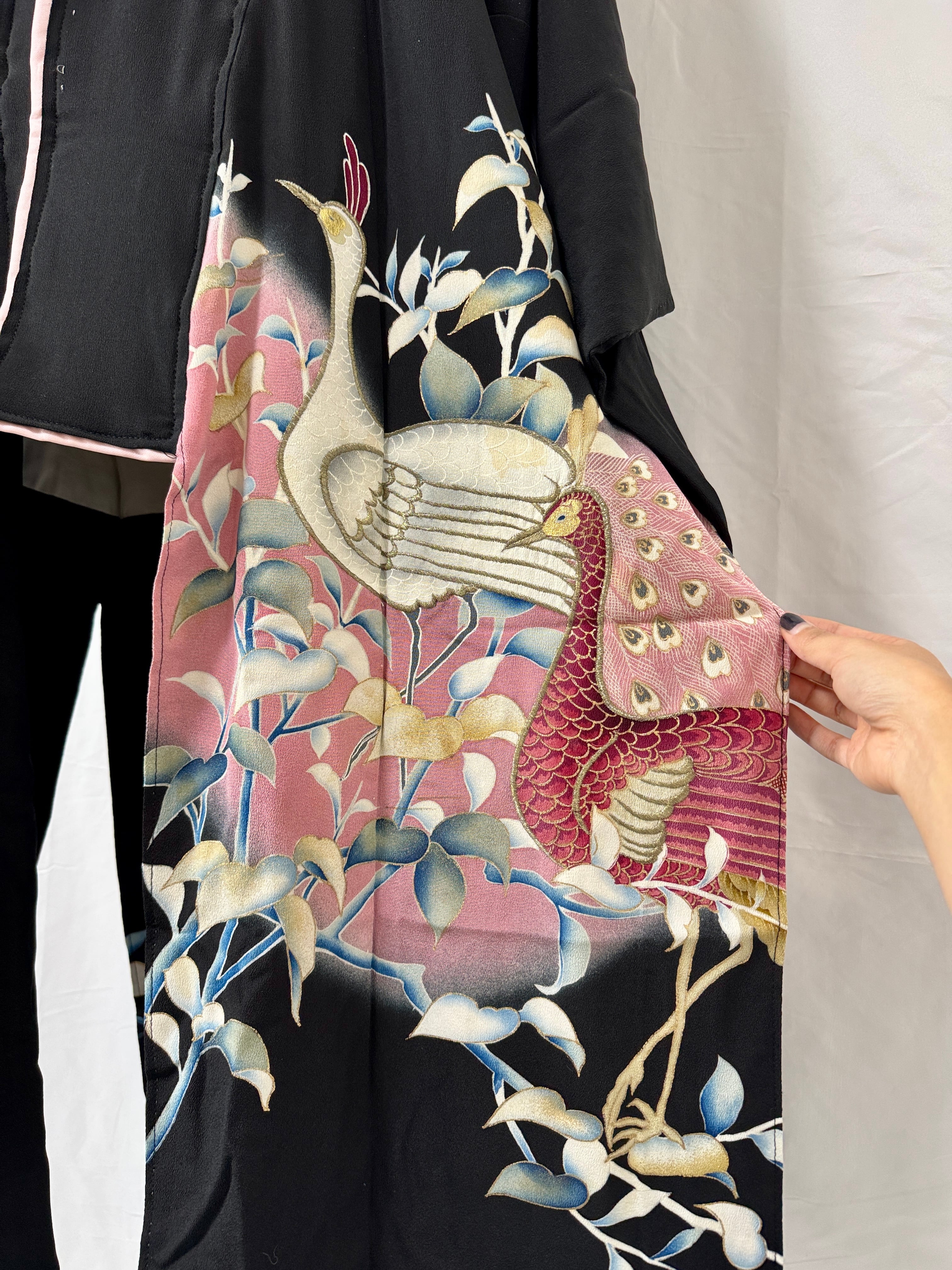 The motifs of cranes and flowers, beautifully rendered against a deep black background, embody the unique elegance and dignity characteristic of formal kimono.