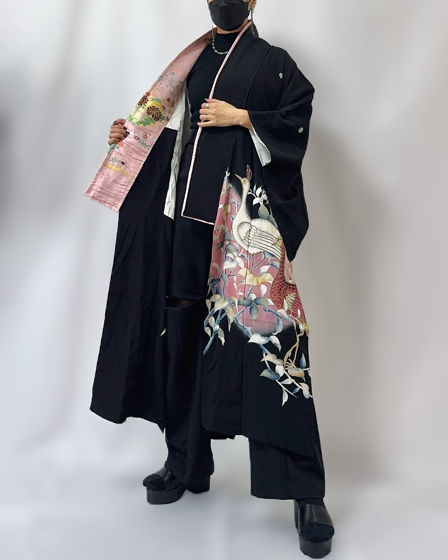 着物の造形美を崩さずに、現代のファッションへ落とし込んだ、唯一無二のリメイクコートです。