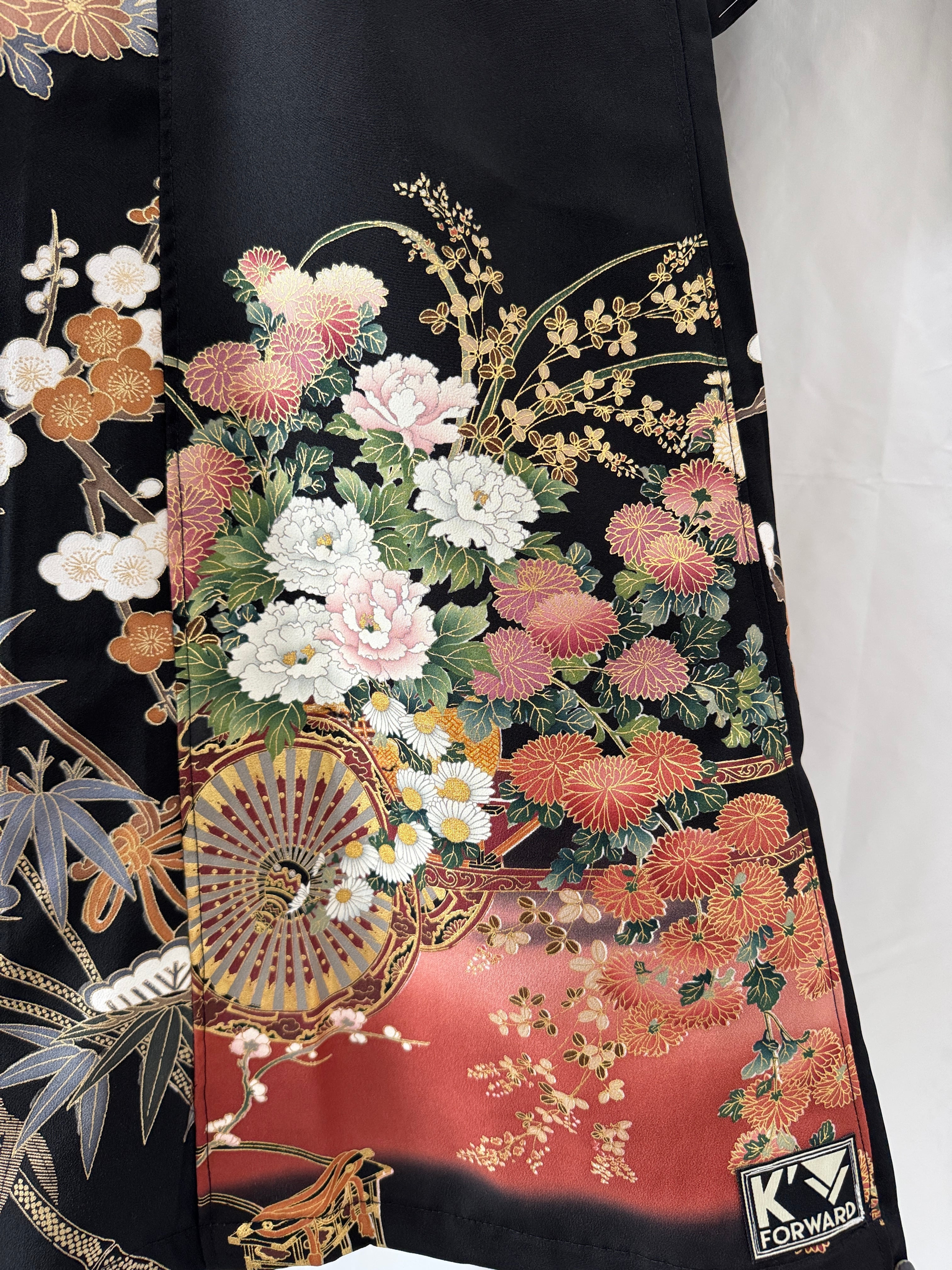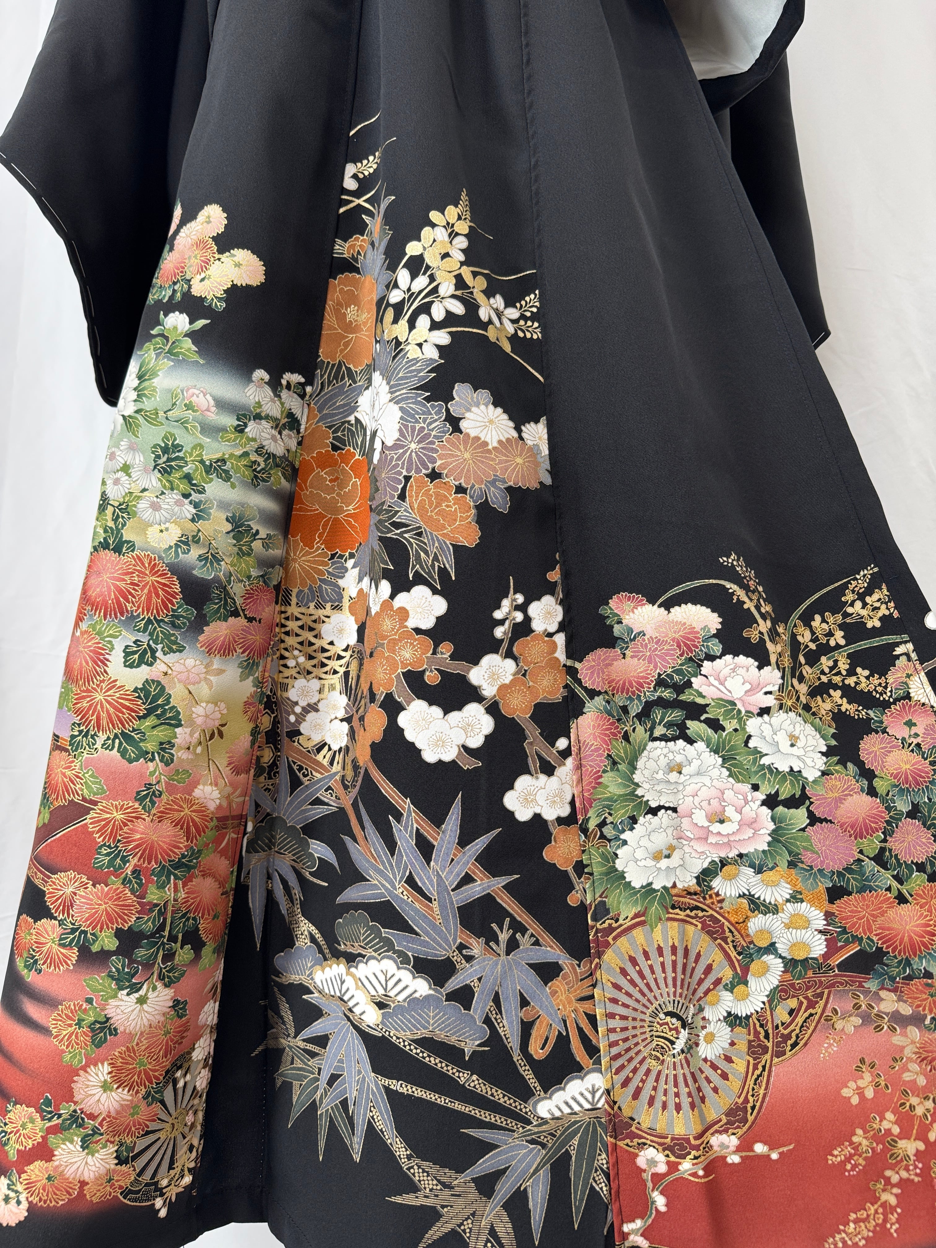 The skirt is crafted by combining two black formal kimono in a luxurious arrangement.