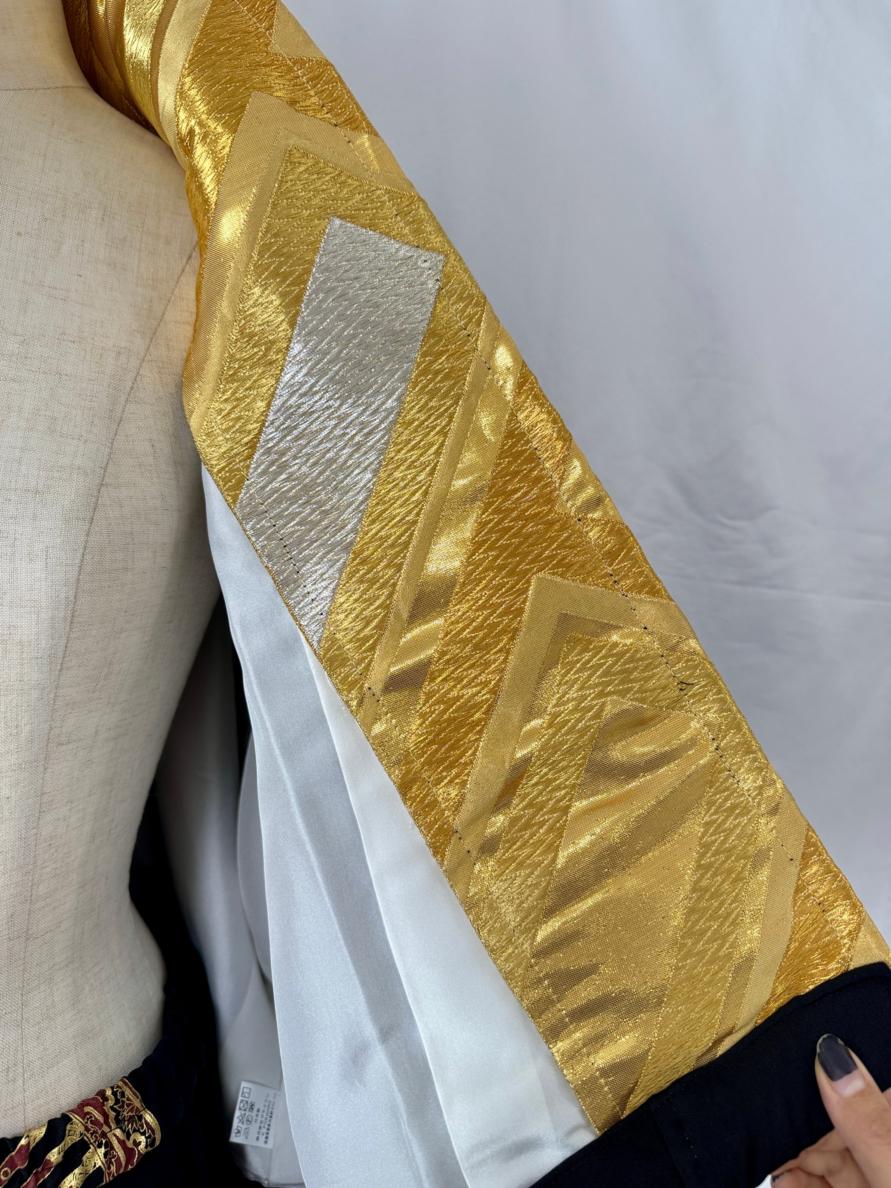 またジャケットの襟の内側には、全体のイメージに合わせた帯を縫い合わせており、羽織った時に帯がアクセントとして見えるのがポイント。