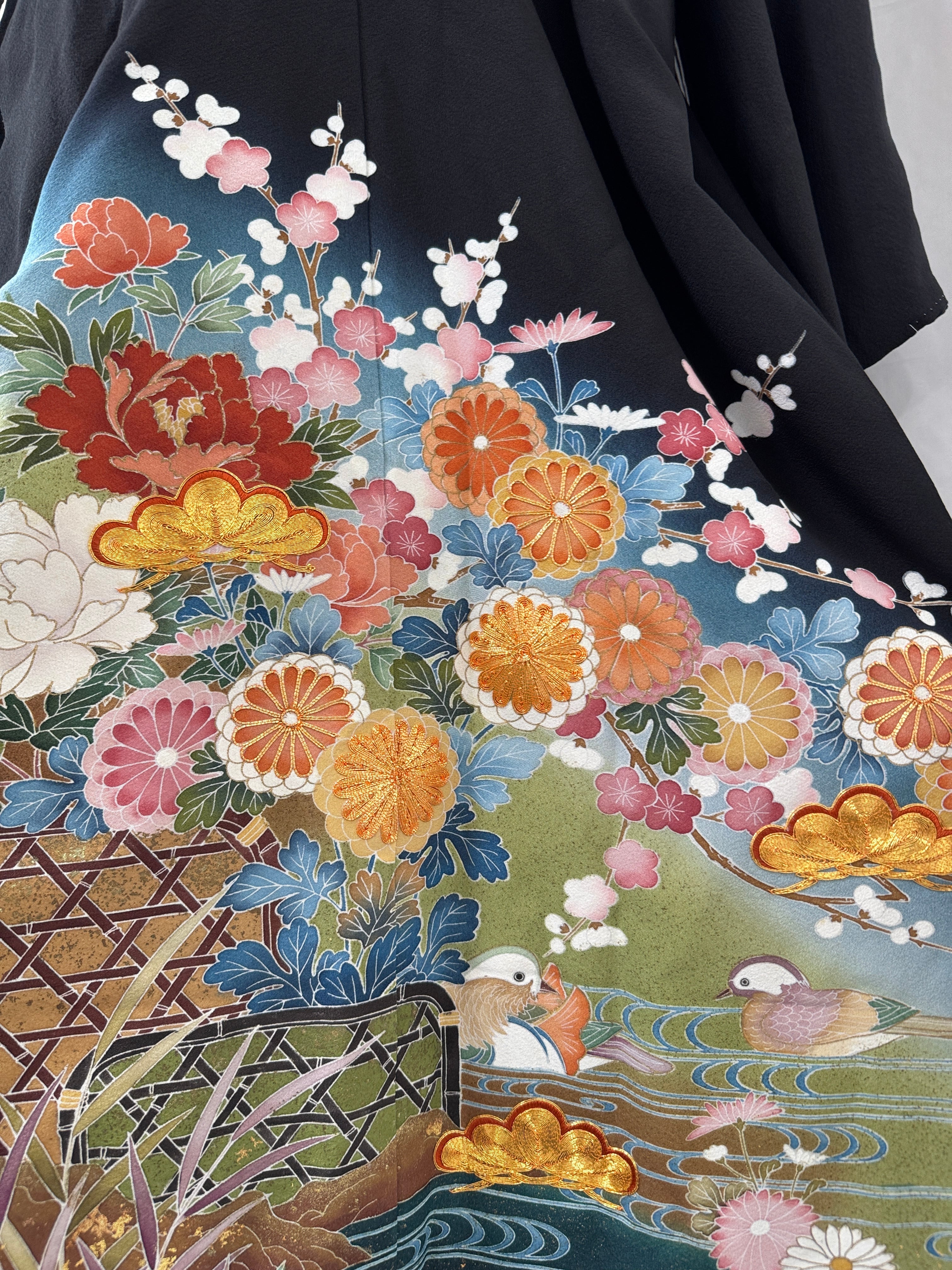 牡丹や菊、梅を思わせる花々、流れる水の意匠、垣根のモチーフ。