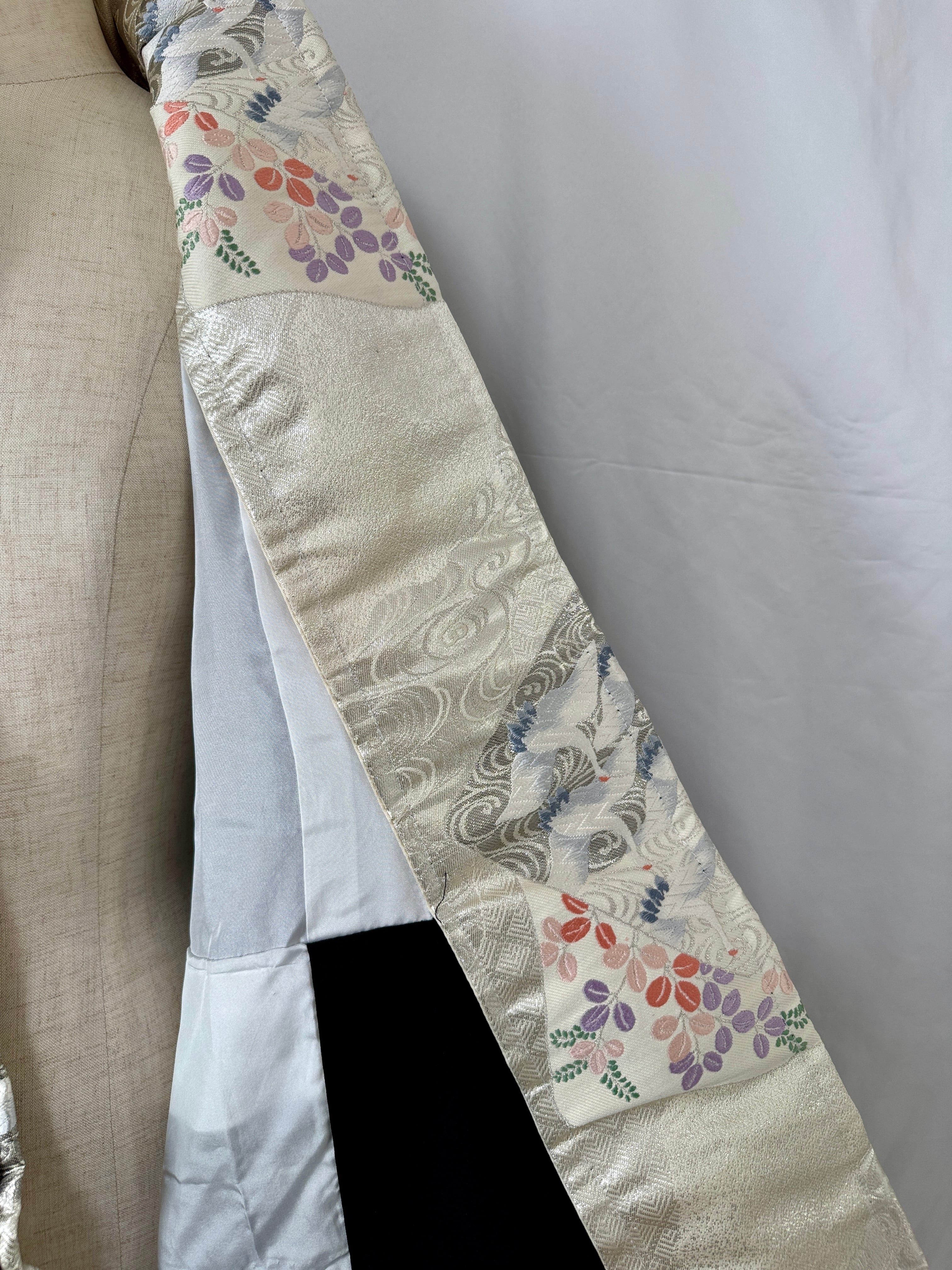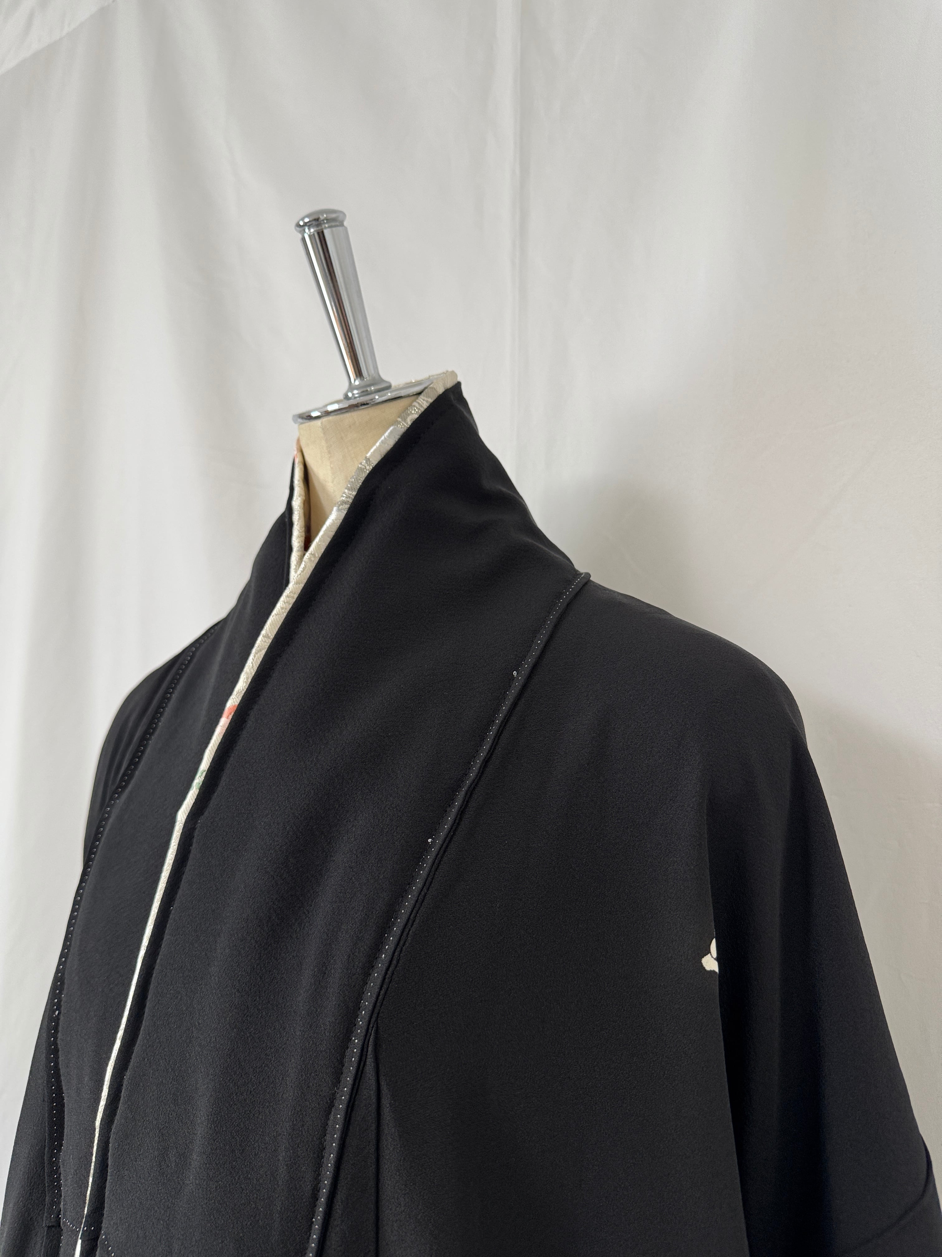 The inside of the collar features a matching obi sash, harmonizing with the coat's pattern for a unified look.