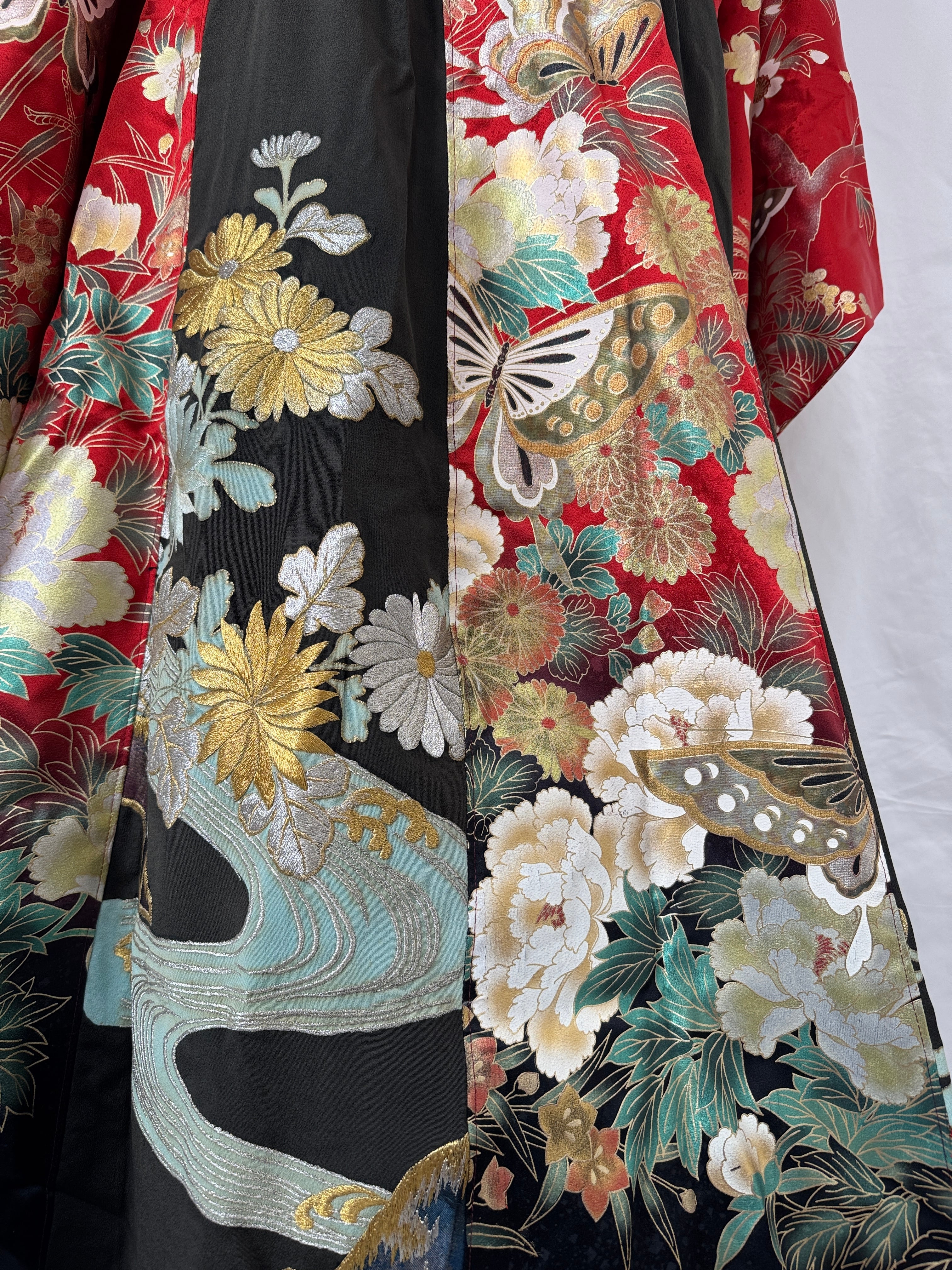 The skirt is crafted by lavishly combining the hem sections of both kimonos.