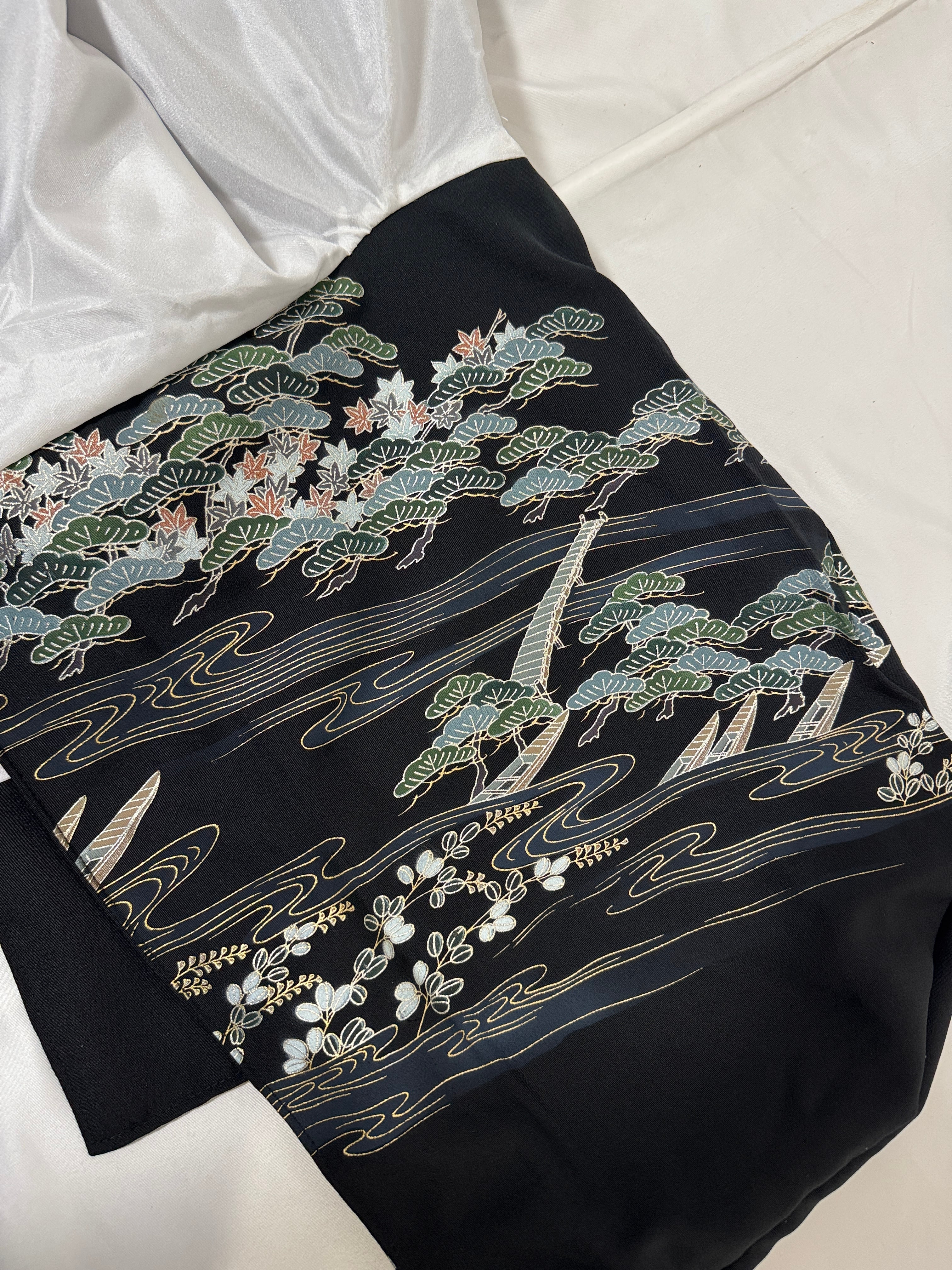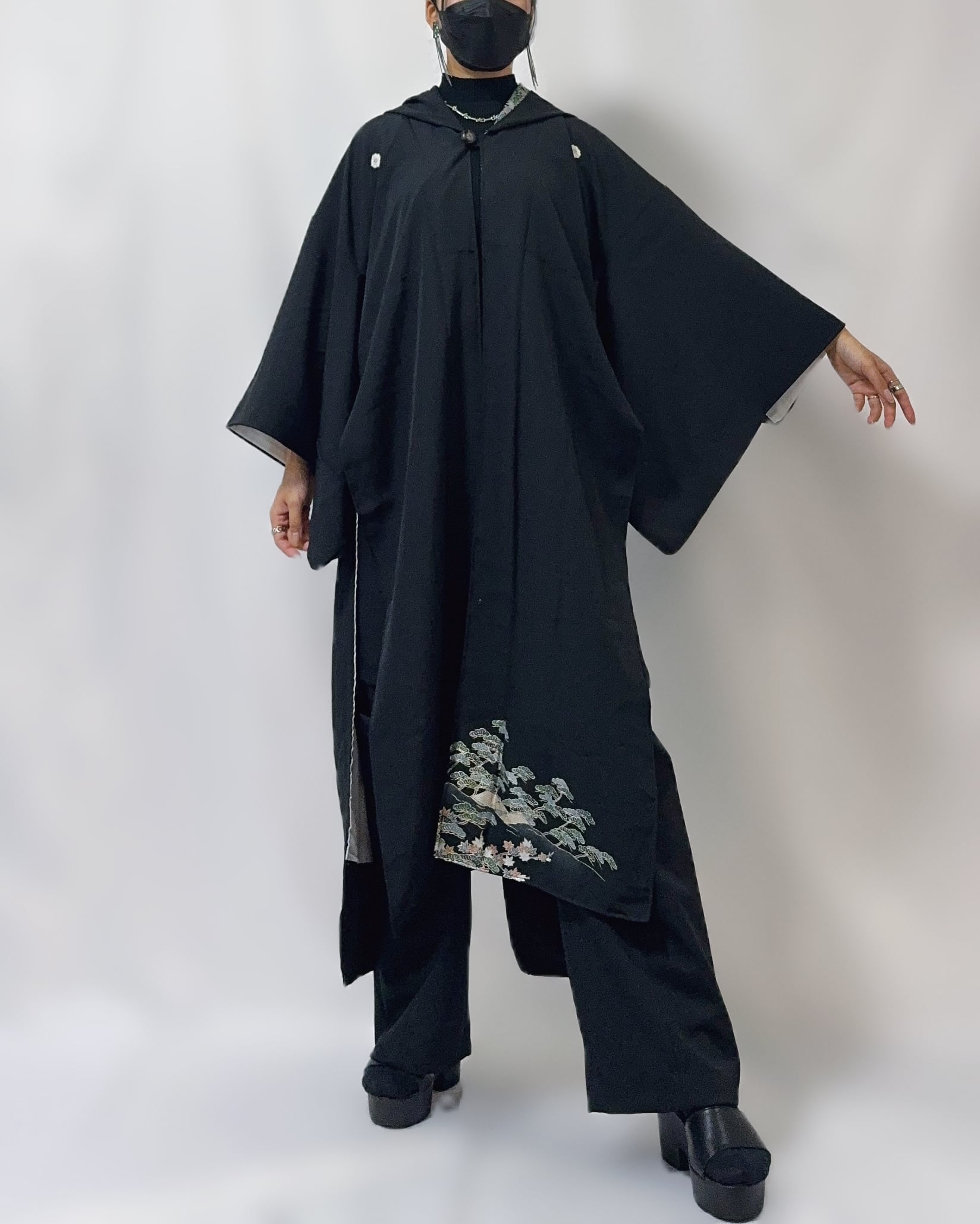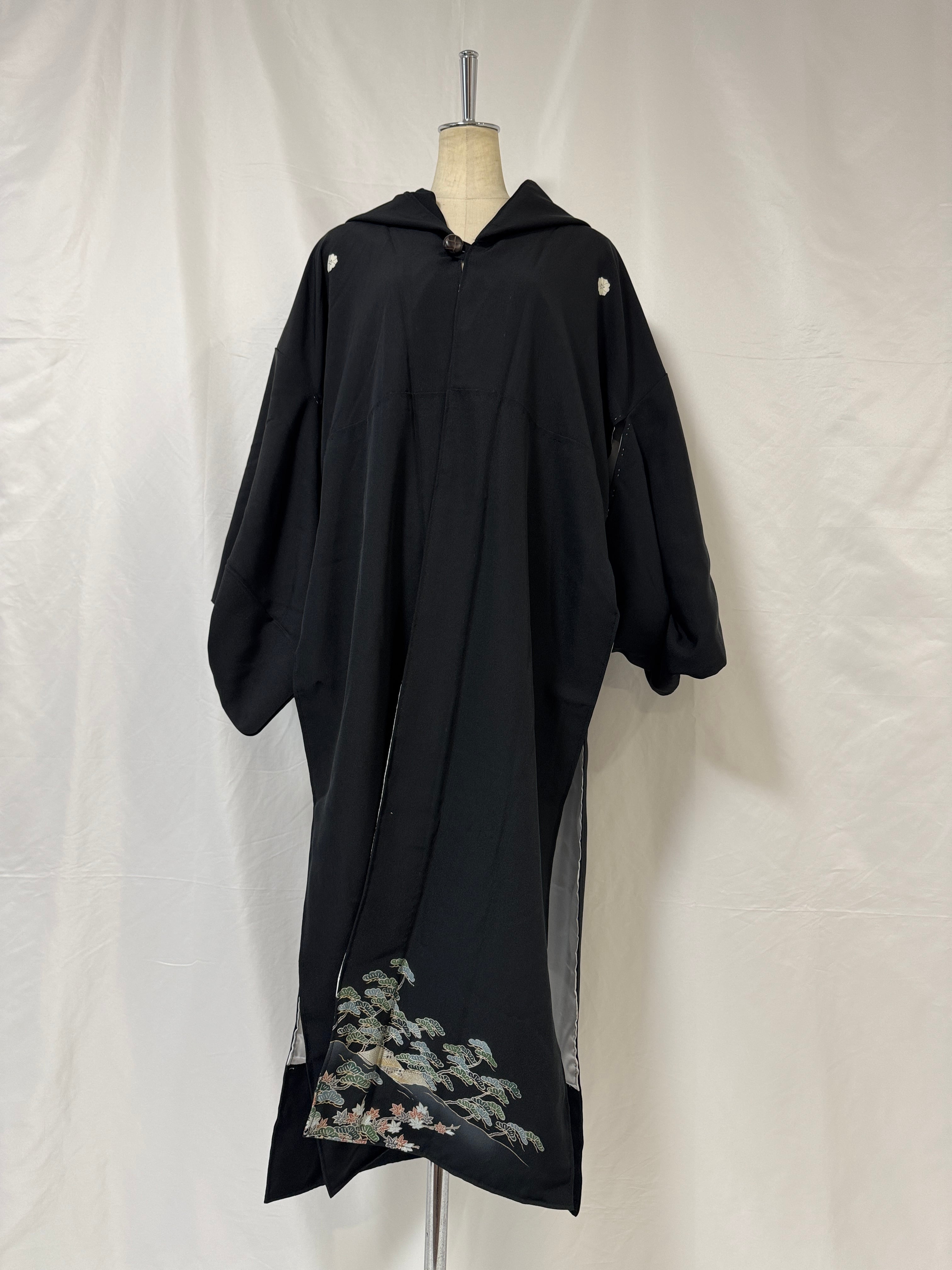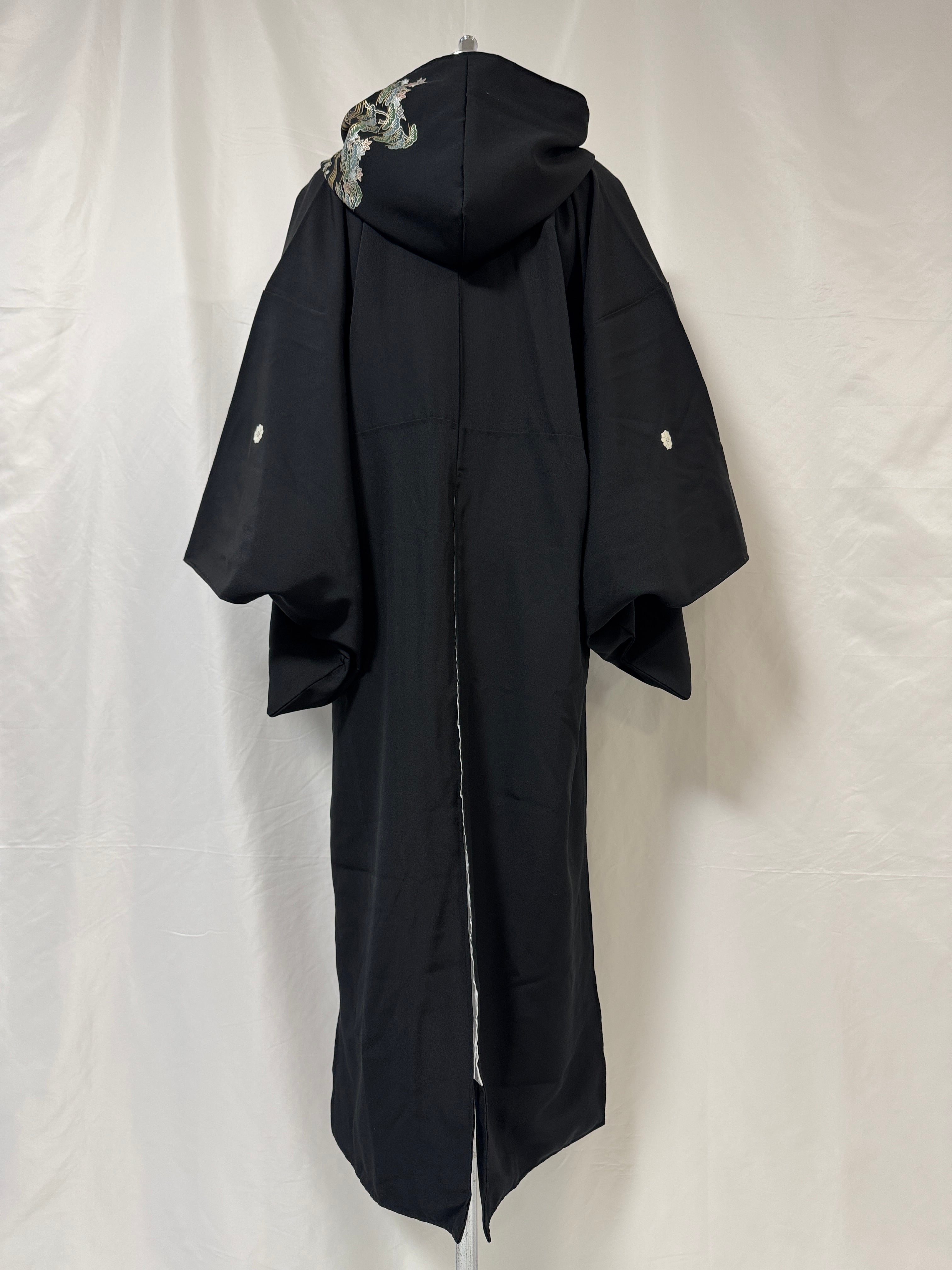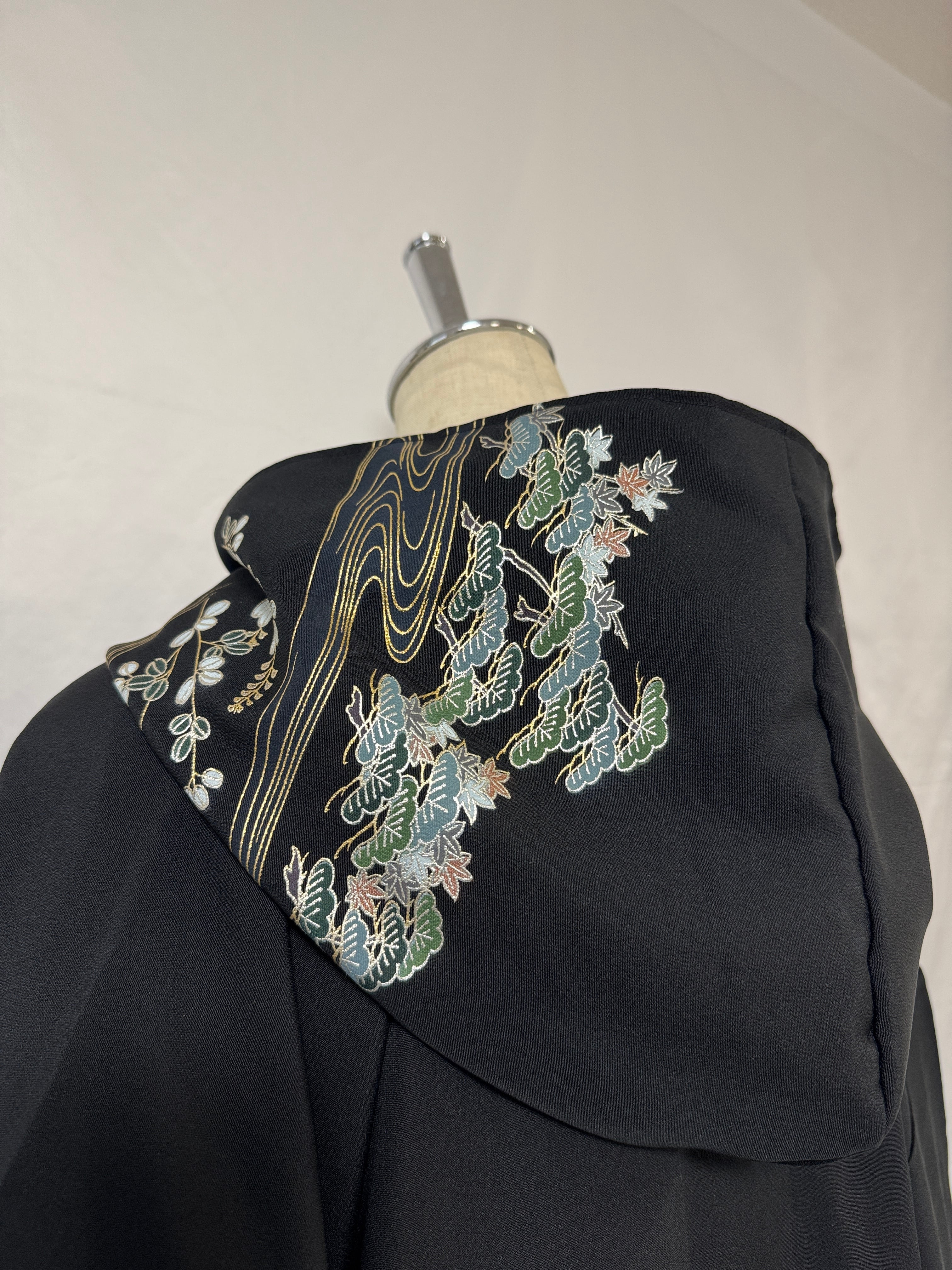 格式ある黒留袖を、現代の感性でリメイクしたフード付きコート。