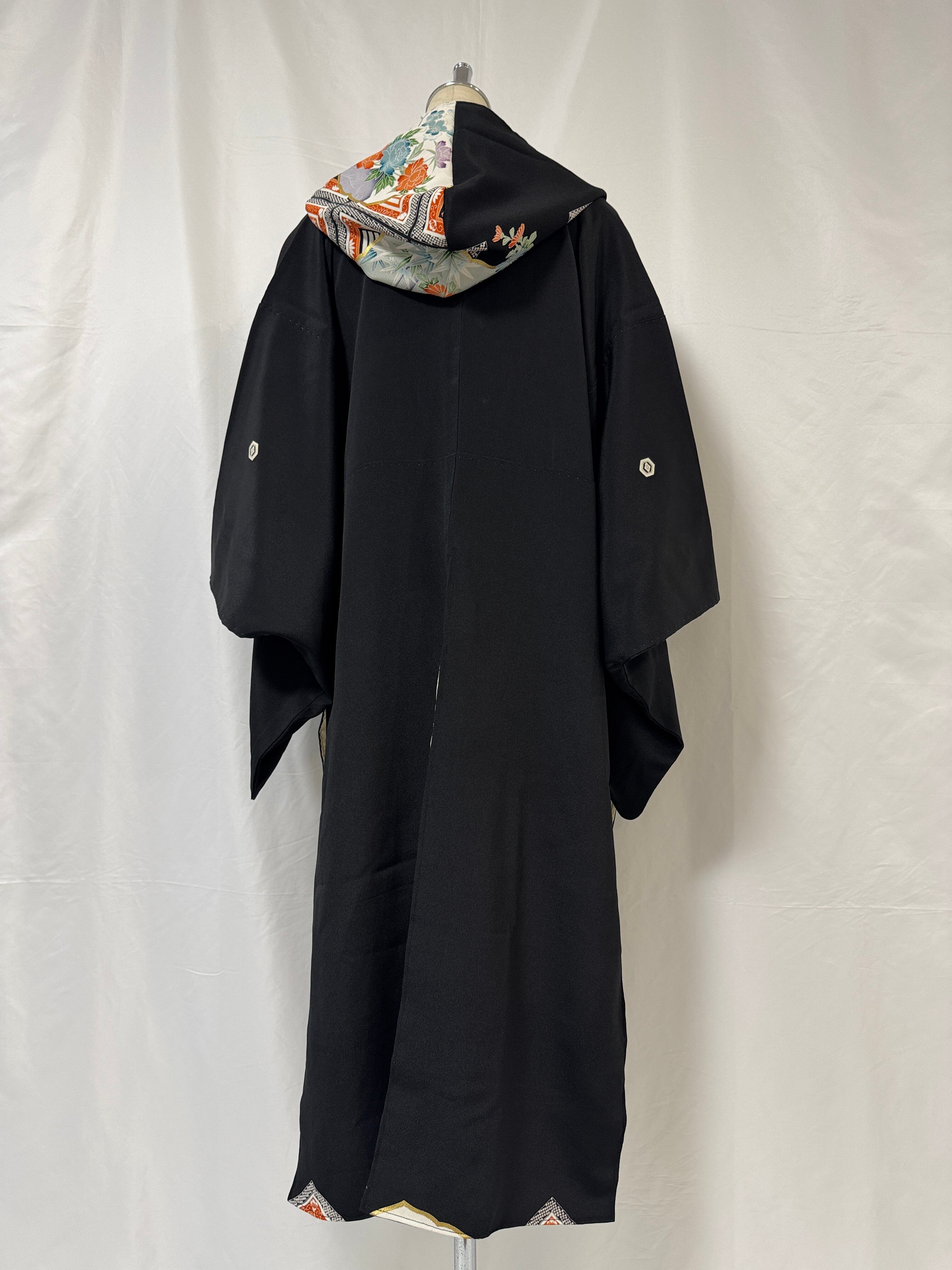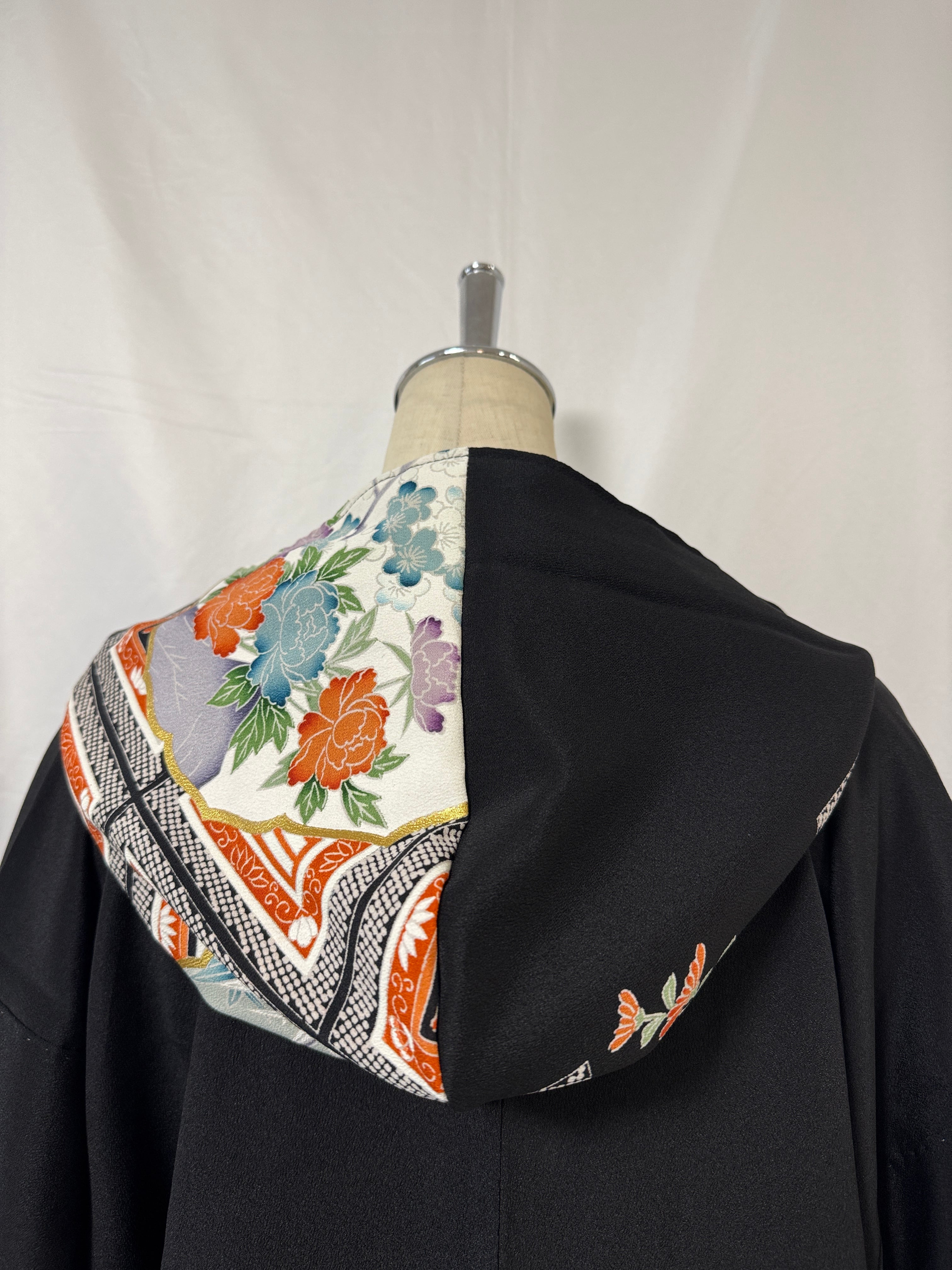 A hooded coat that upcycles traditional formal tomesode kimono fabric with a contemporary sensibility.