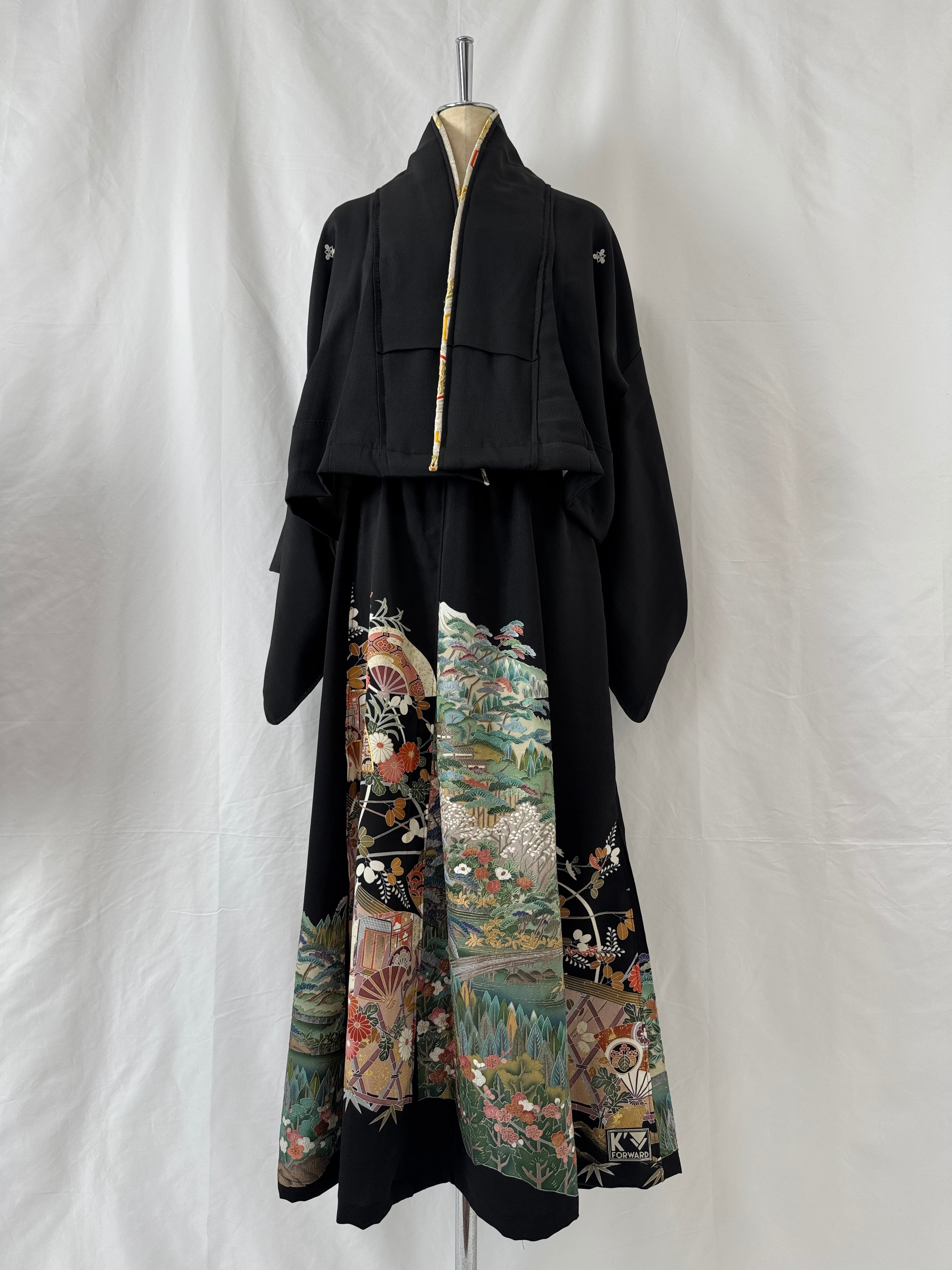 A two-piece set reimagined from vintage tomesode kimono that once graced celebratory occasions, infused with contemporary essence.