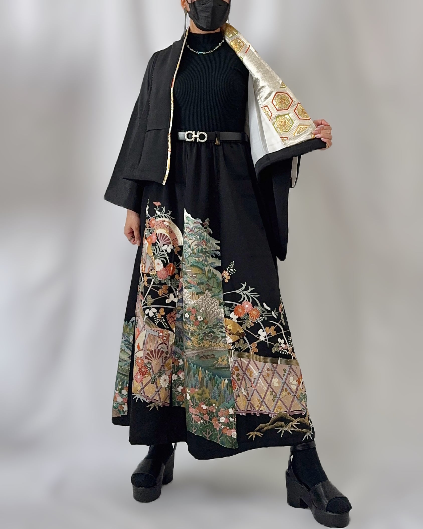 The skirt is crafted by lavishly combining two tomesode kimono.