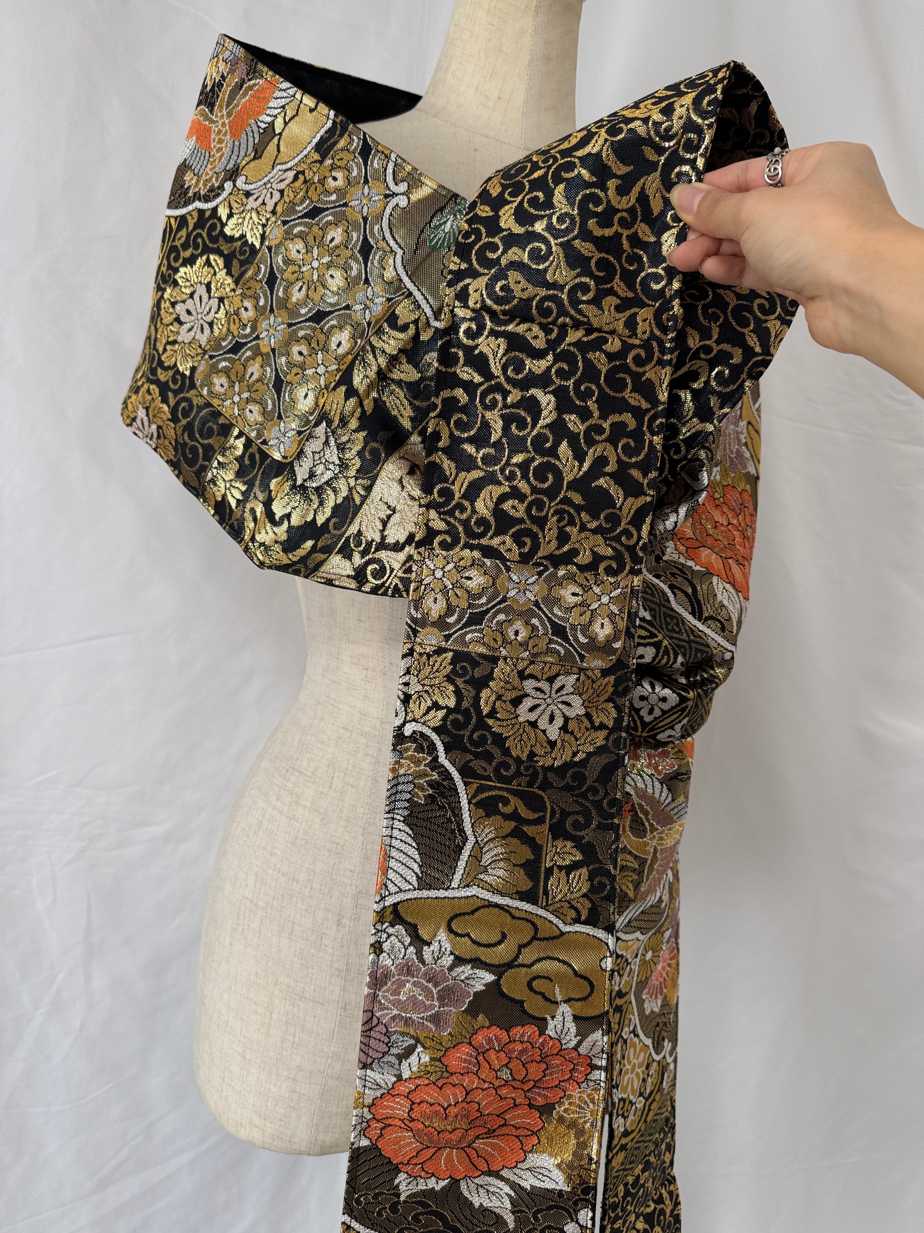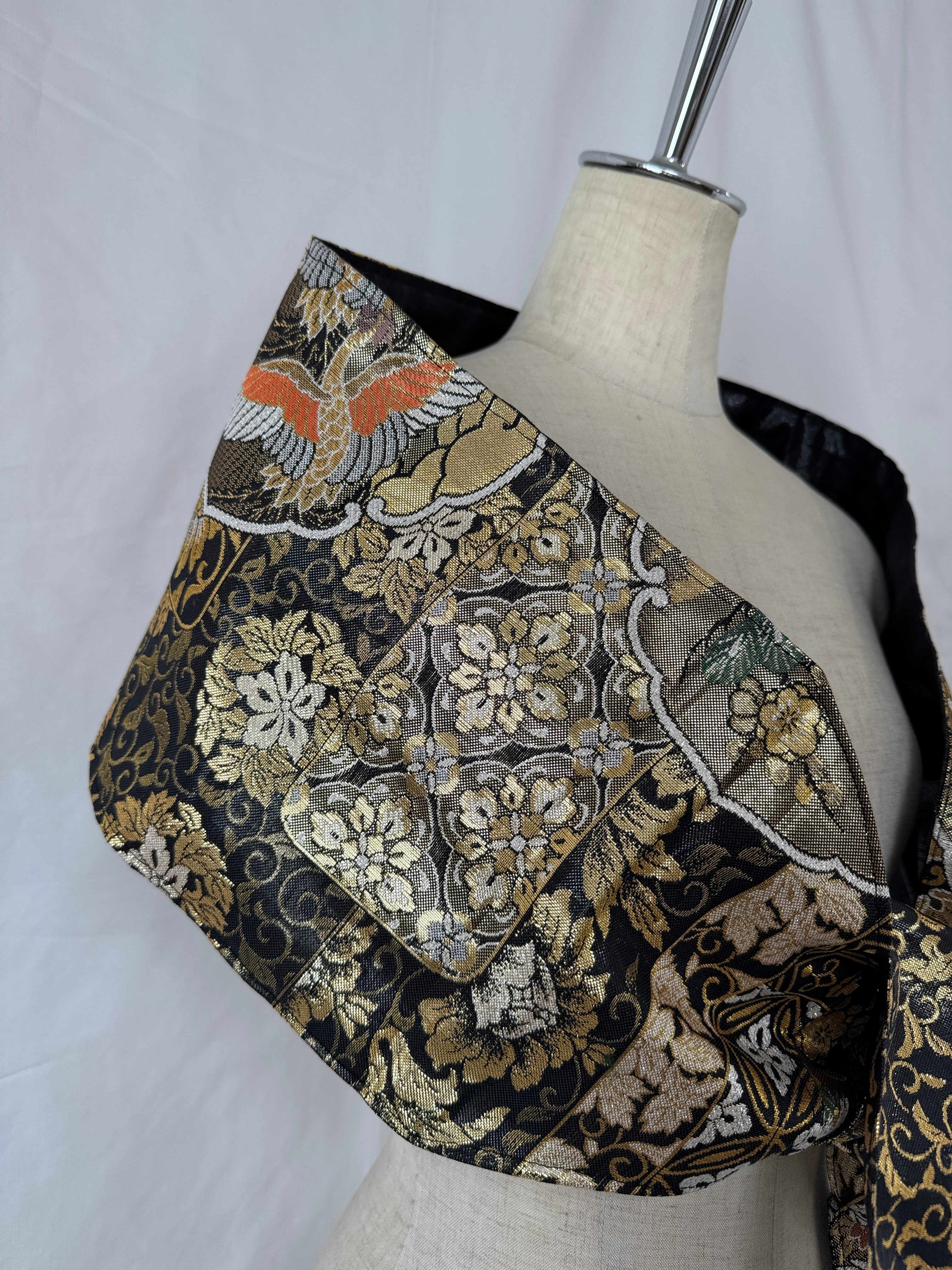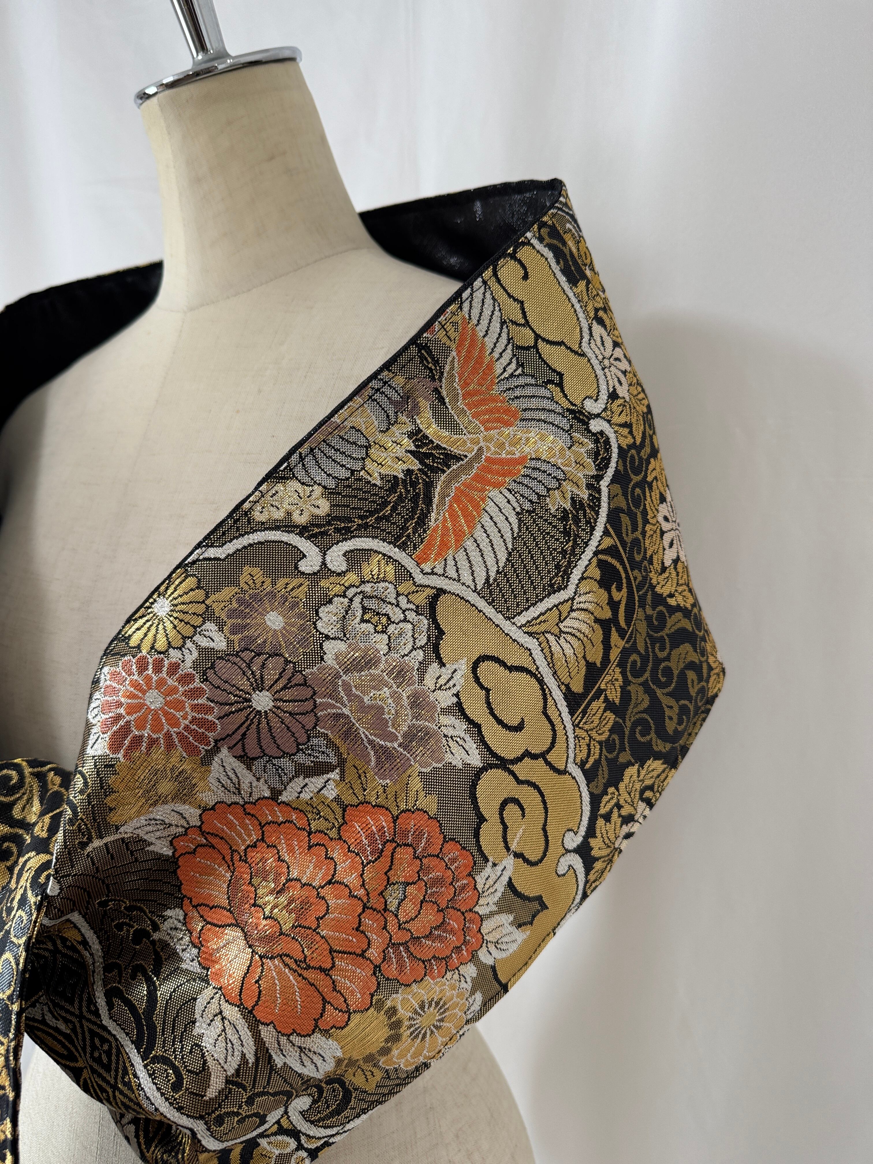 ヴィンテージの帯に新たな命を吹き込み、ショールとしてリメイクした特別な一点物。