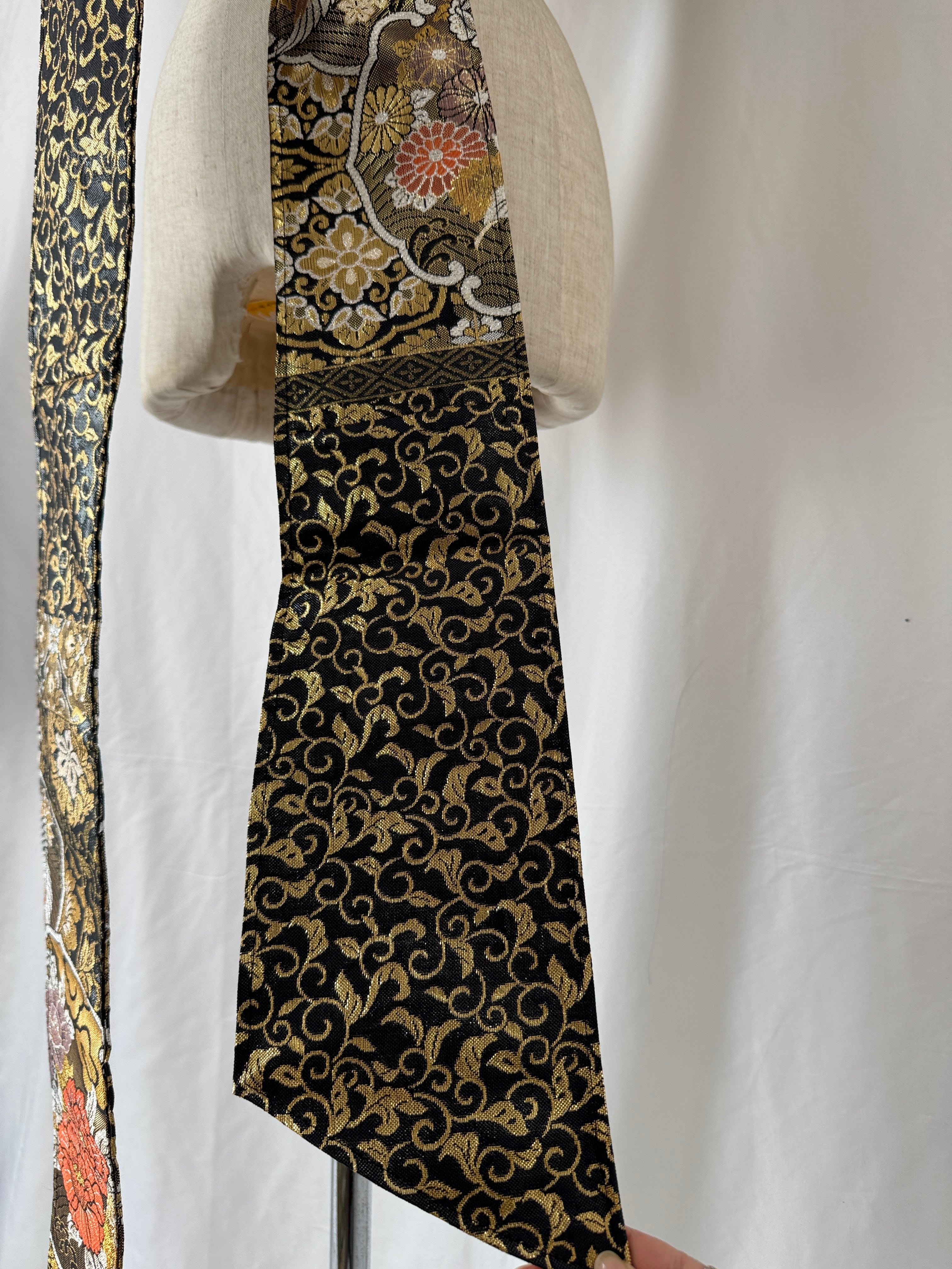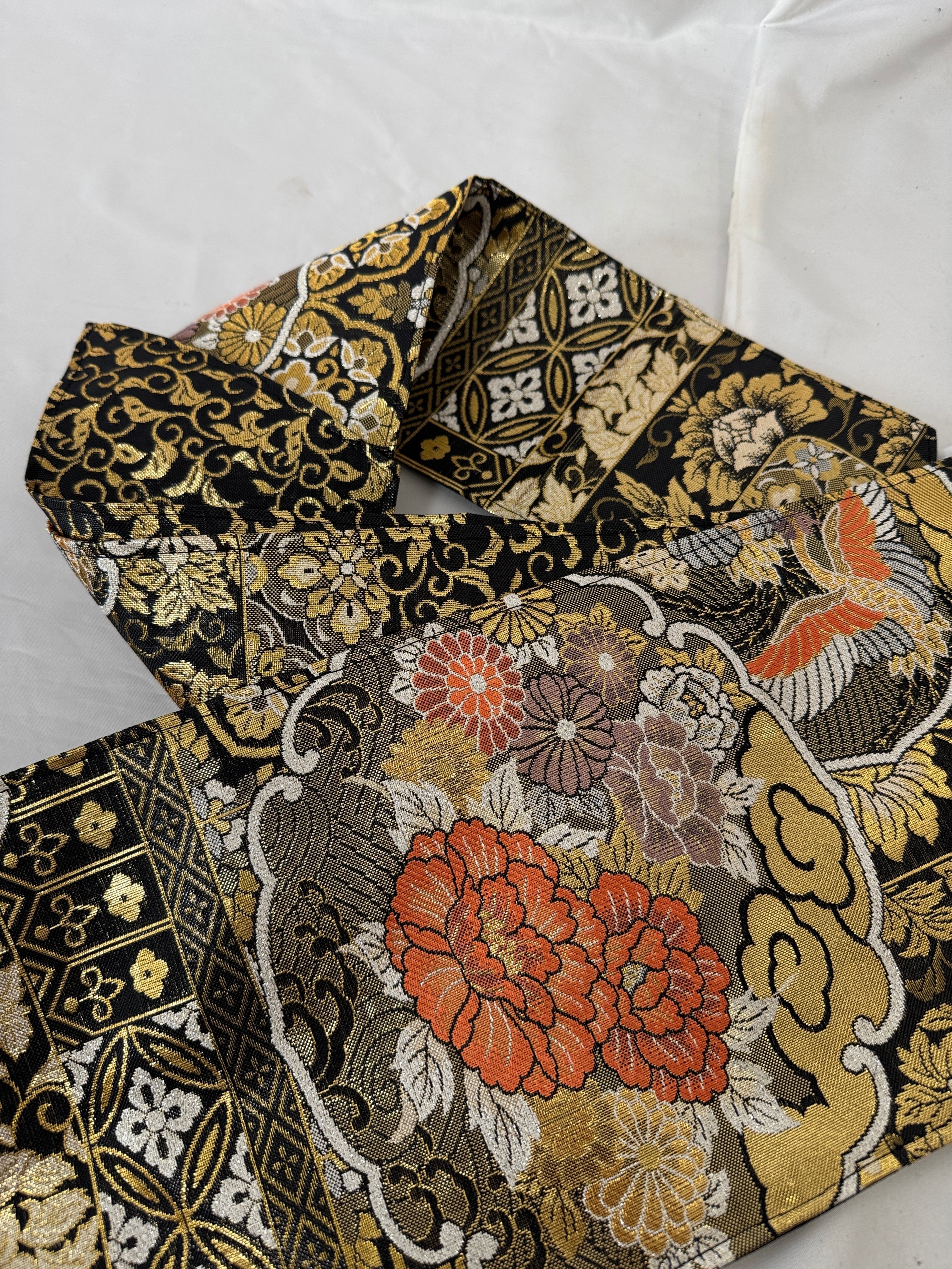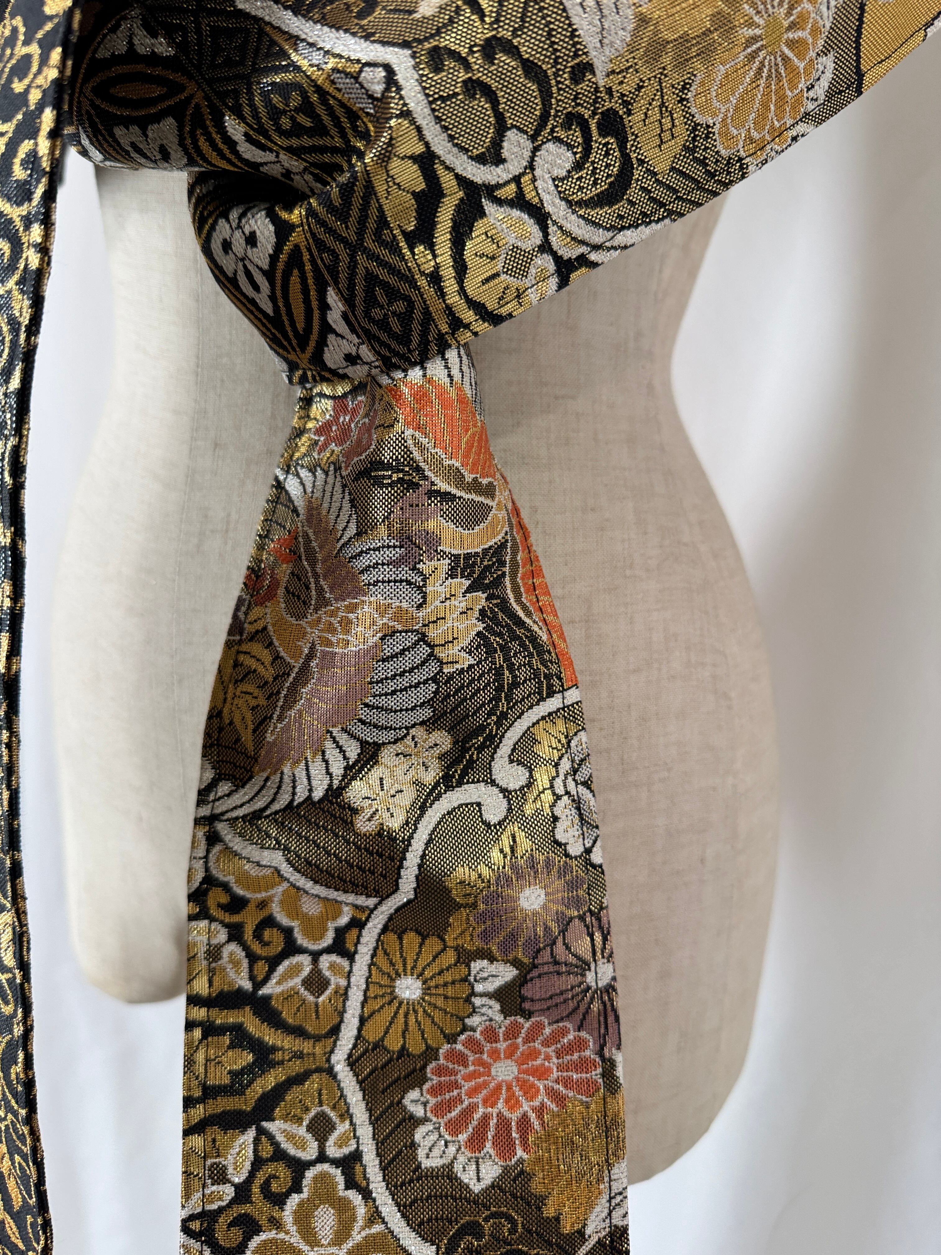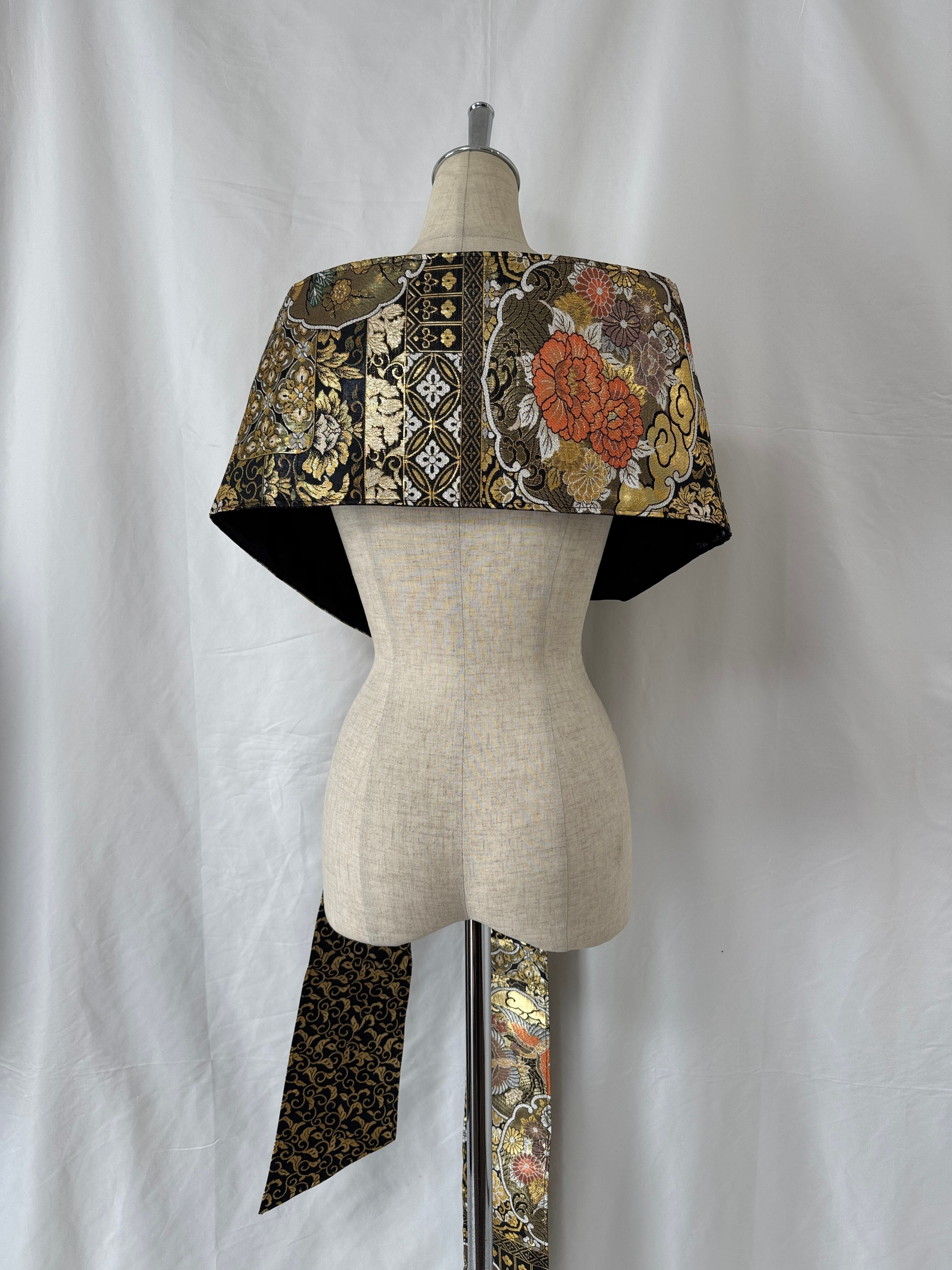 ヴィンテージの帯に新たな命を吹き込み、ショールとしてリメイクした特別な一点物。