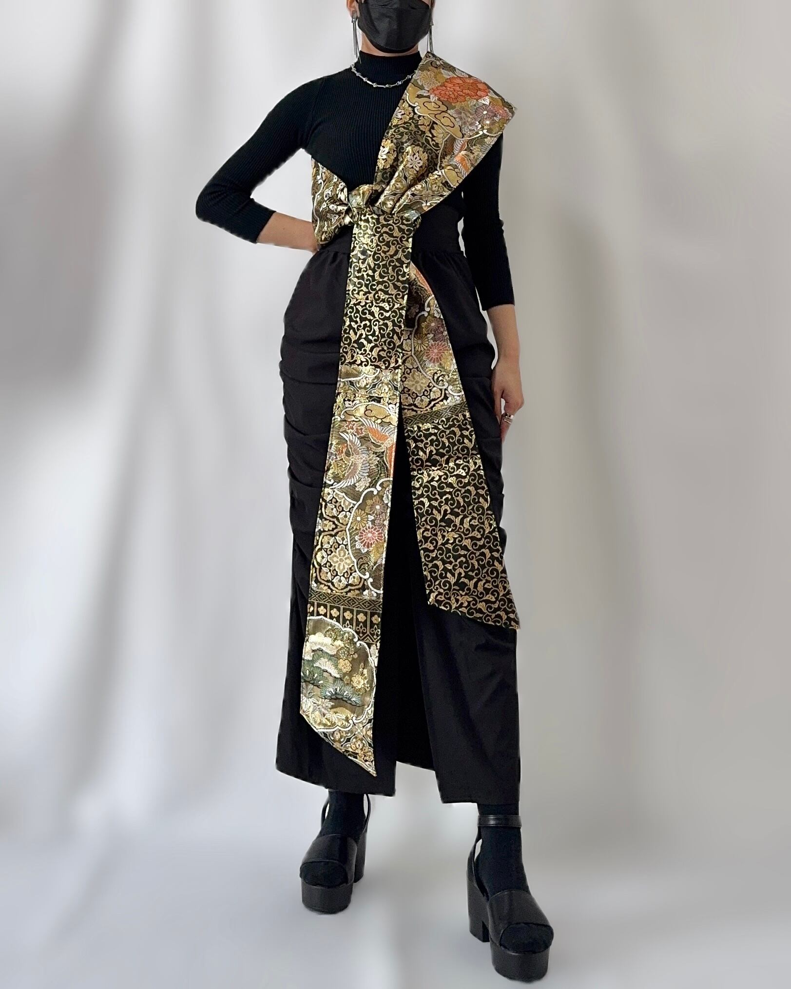 伝統的な帯の豪華な織柄をそのまま活かしつつ、肩にかけたり、ウエストに結んだりと、自由なアレンジが楽しめる新感覚のファッションアイテムです。