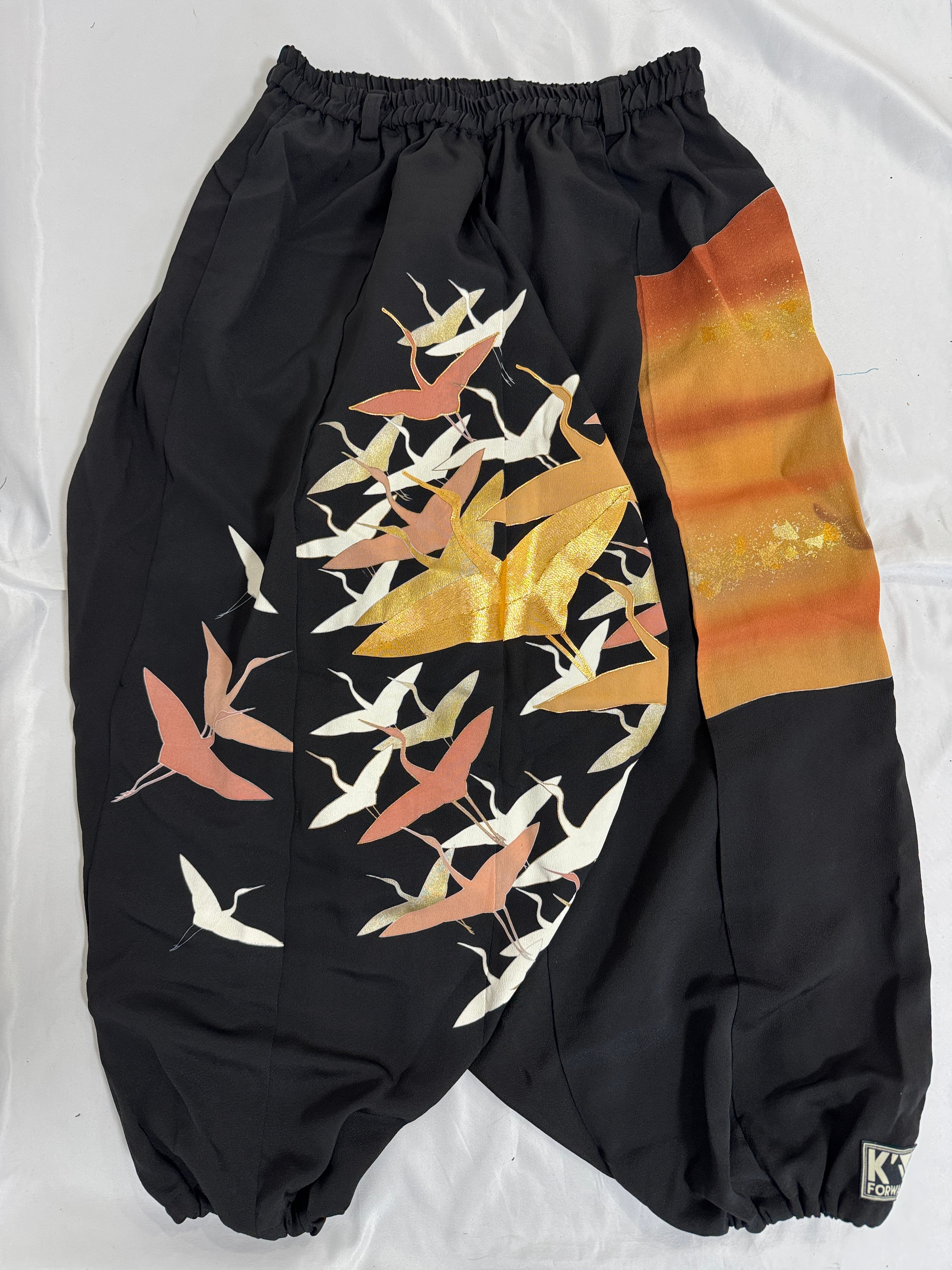 The prestigious tomesode is luxuriously used and upcycled into pants with a loose sarouel silhouette.