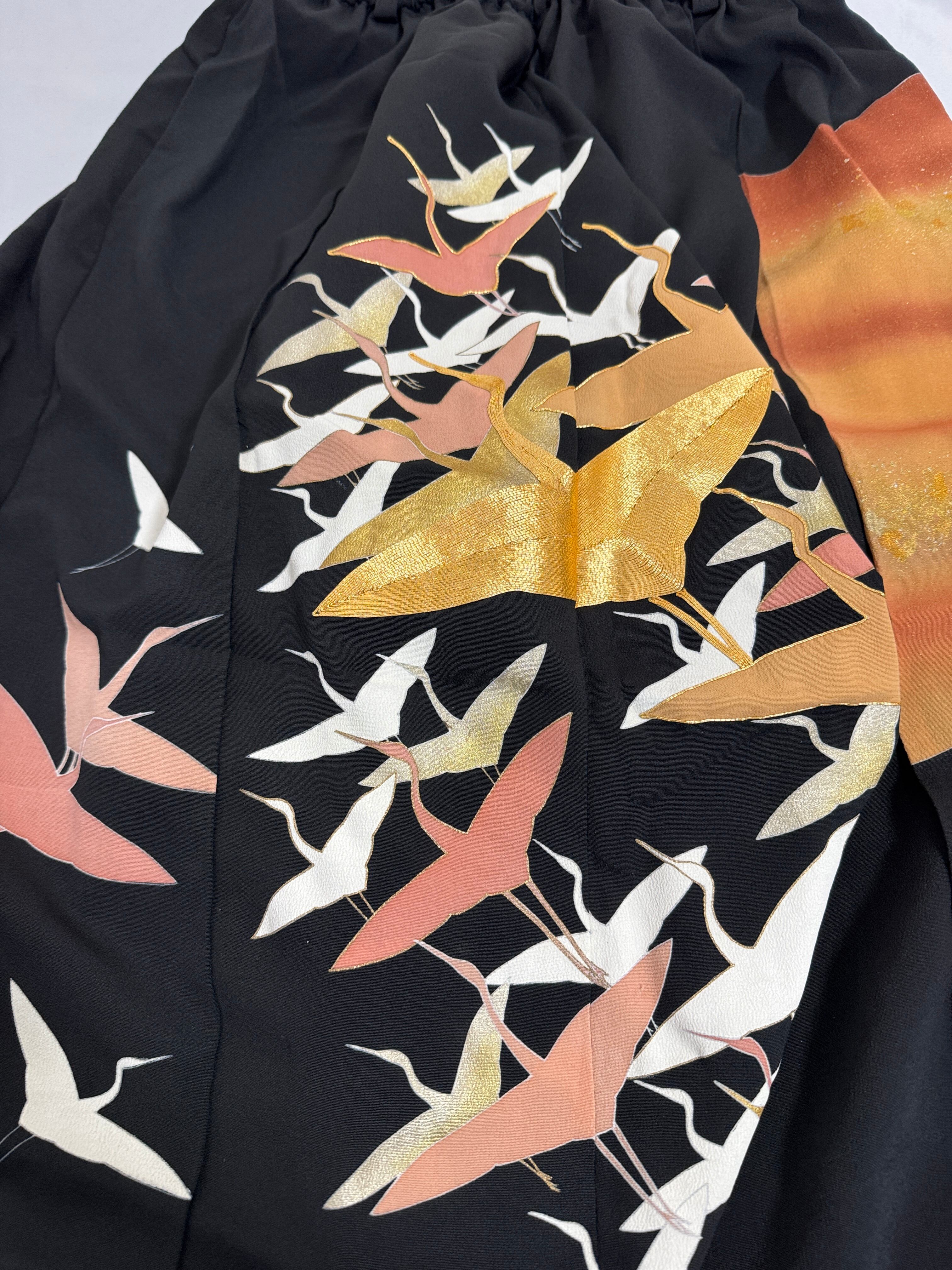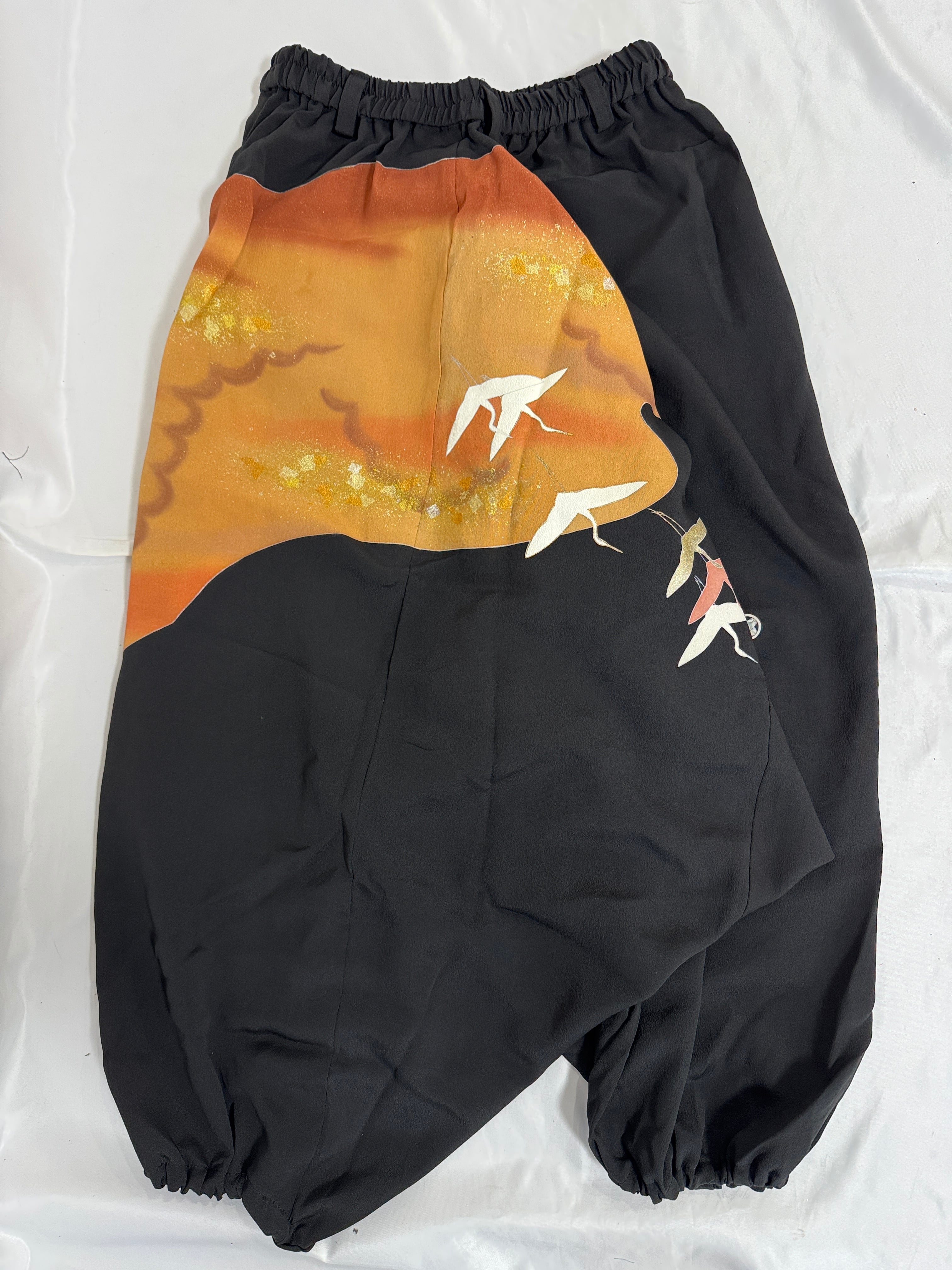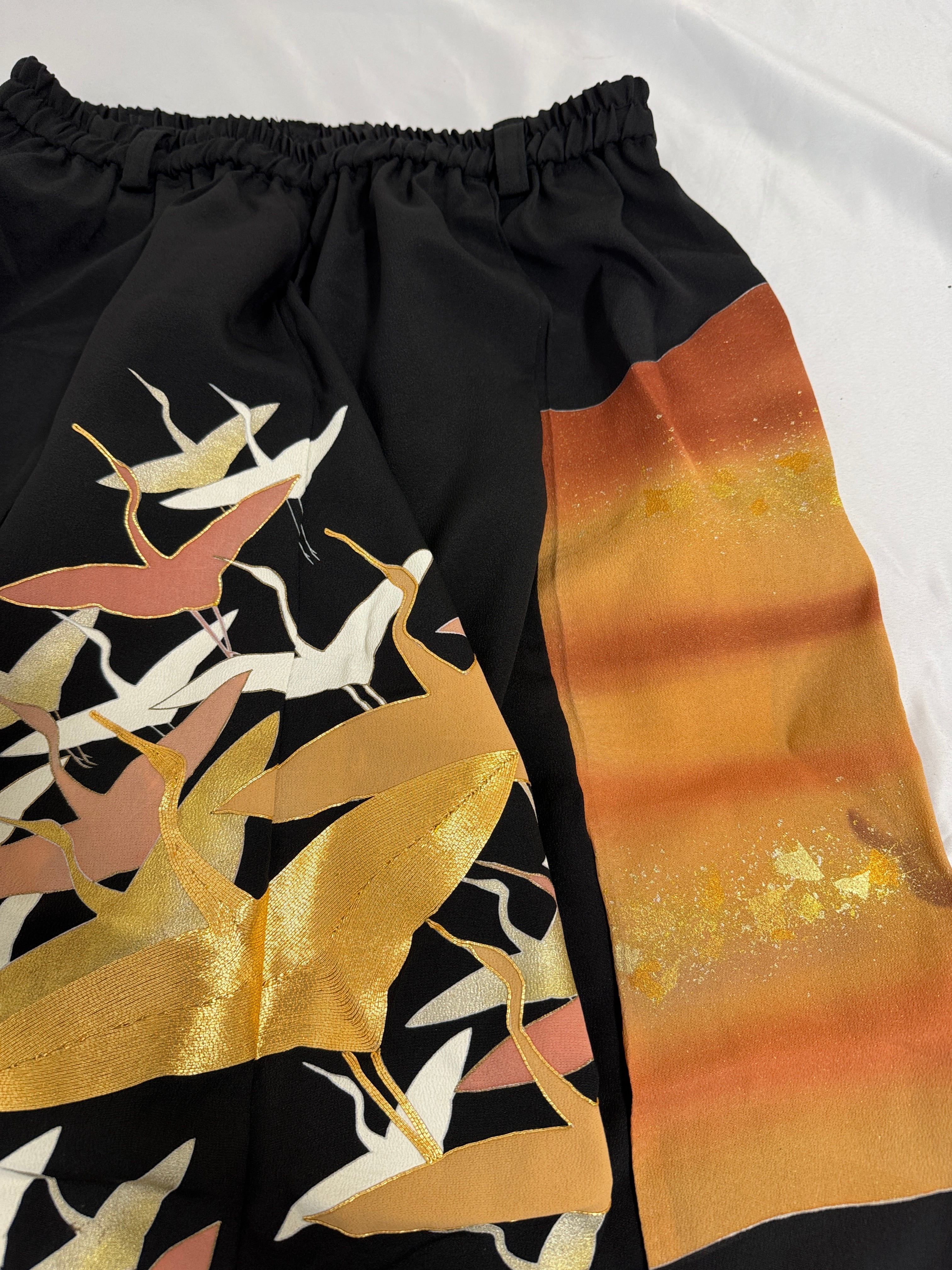 格式ある黒留袖を贅沢に使用し、ゆったりとしたサルエルシルエットのパンツにリメイク。