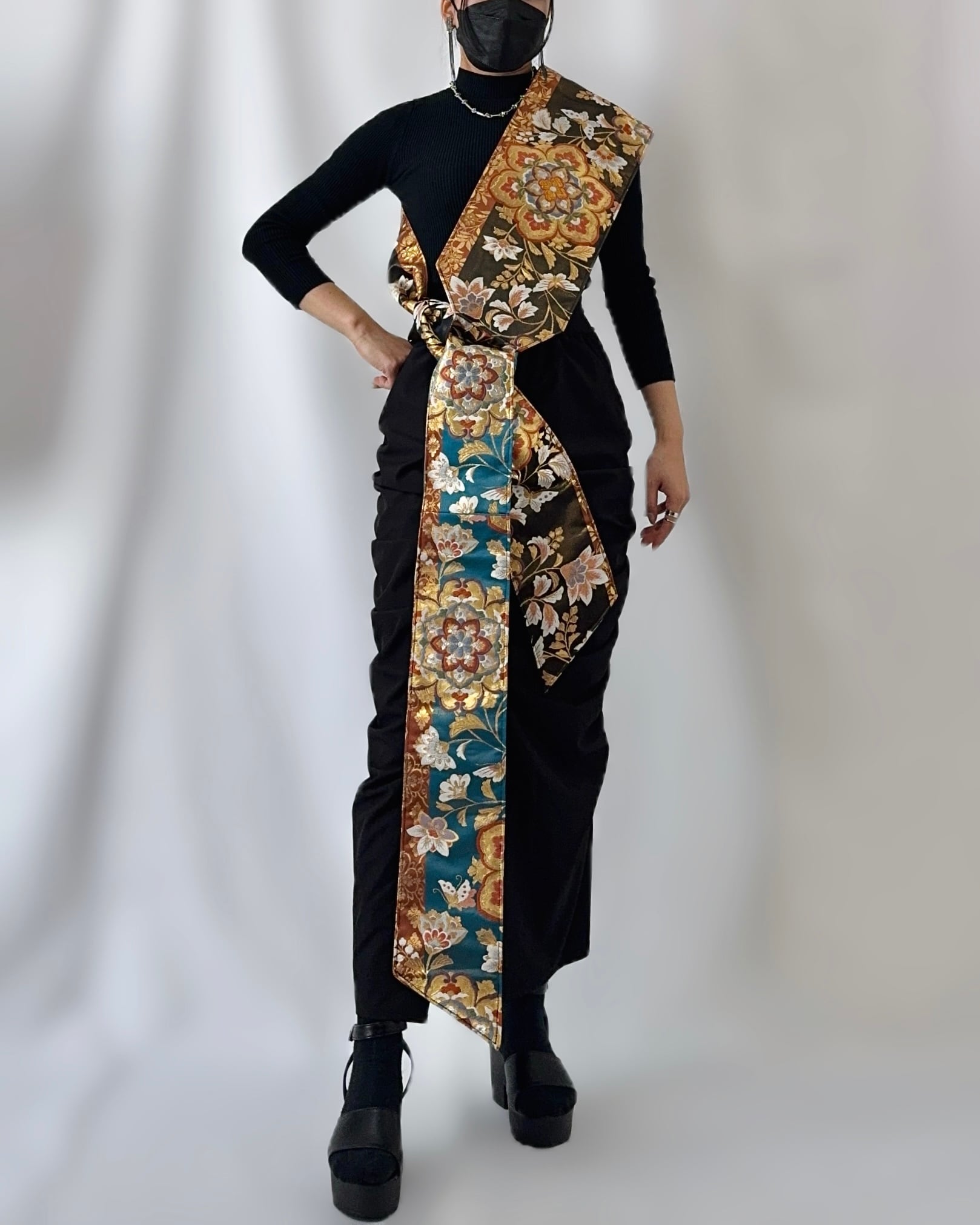 This innovative fashion piece preserves the luxurious woven patterns of traditional obi while offering versatile styling—draped over the shoulders or tied at the waist.