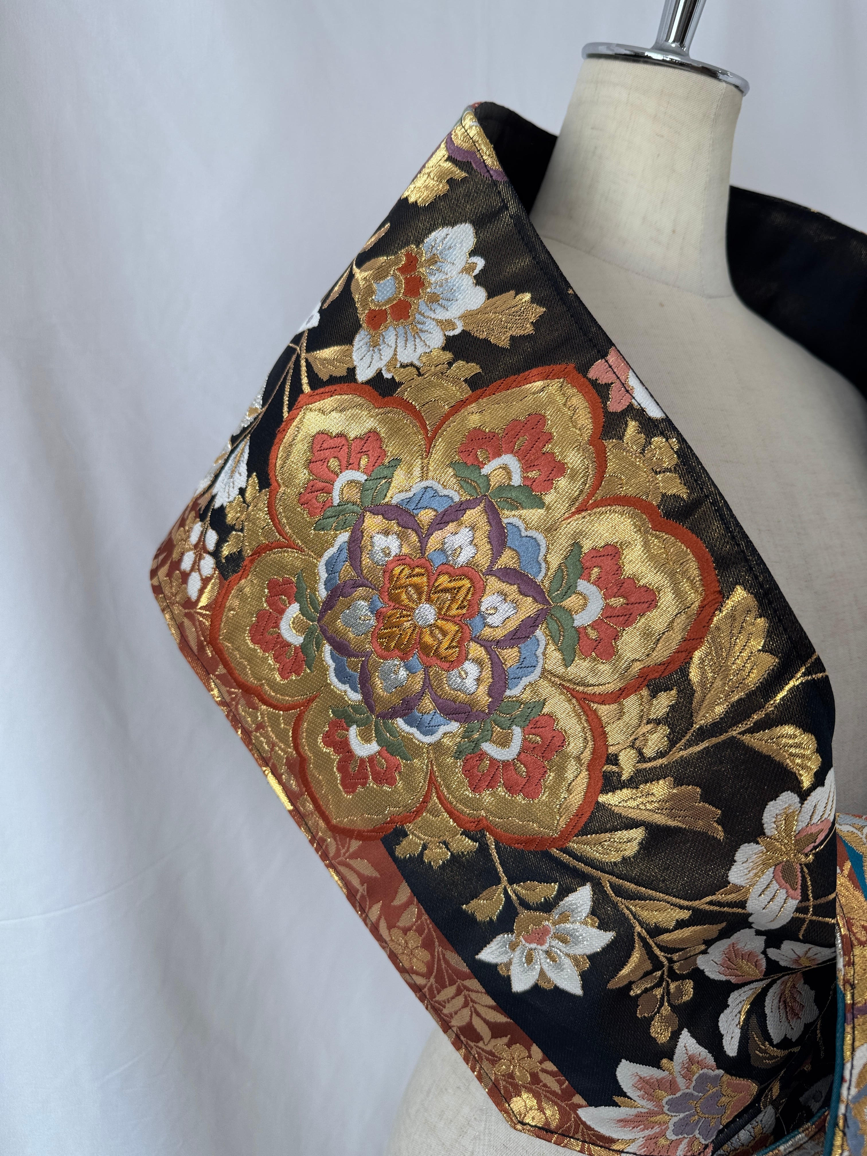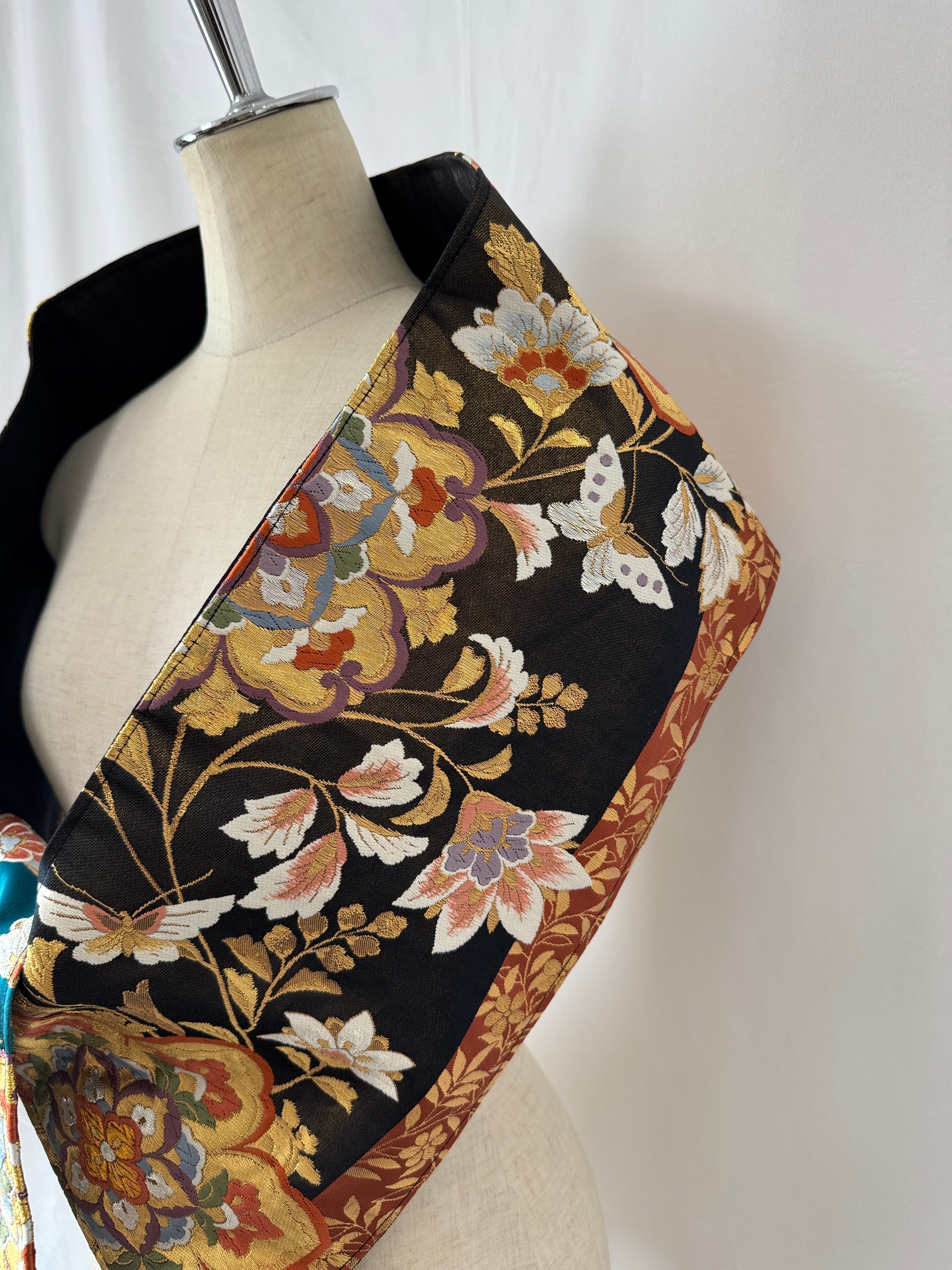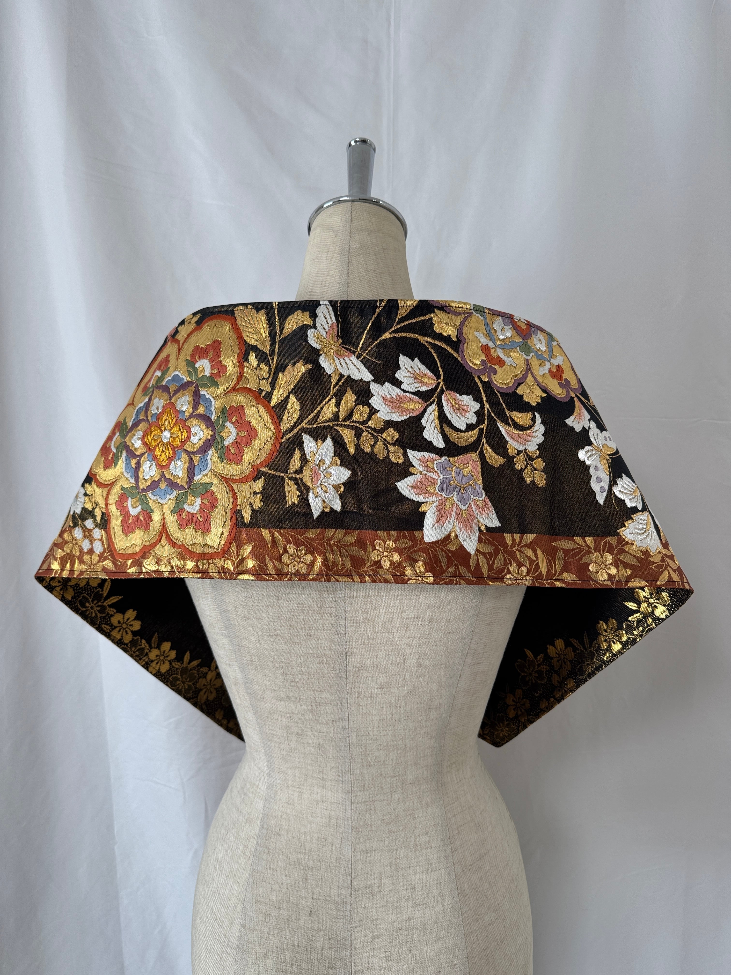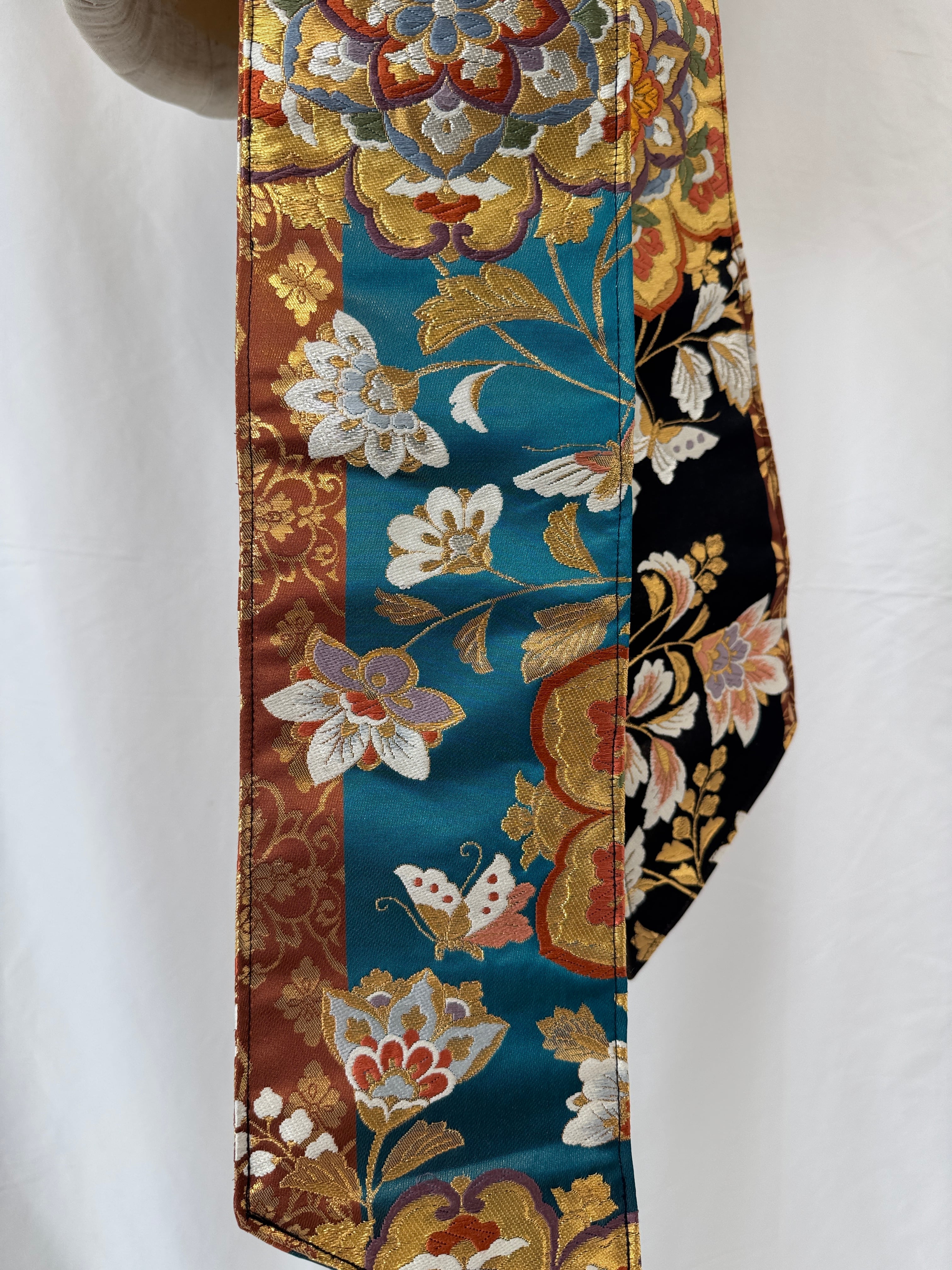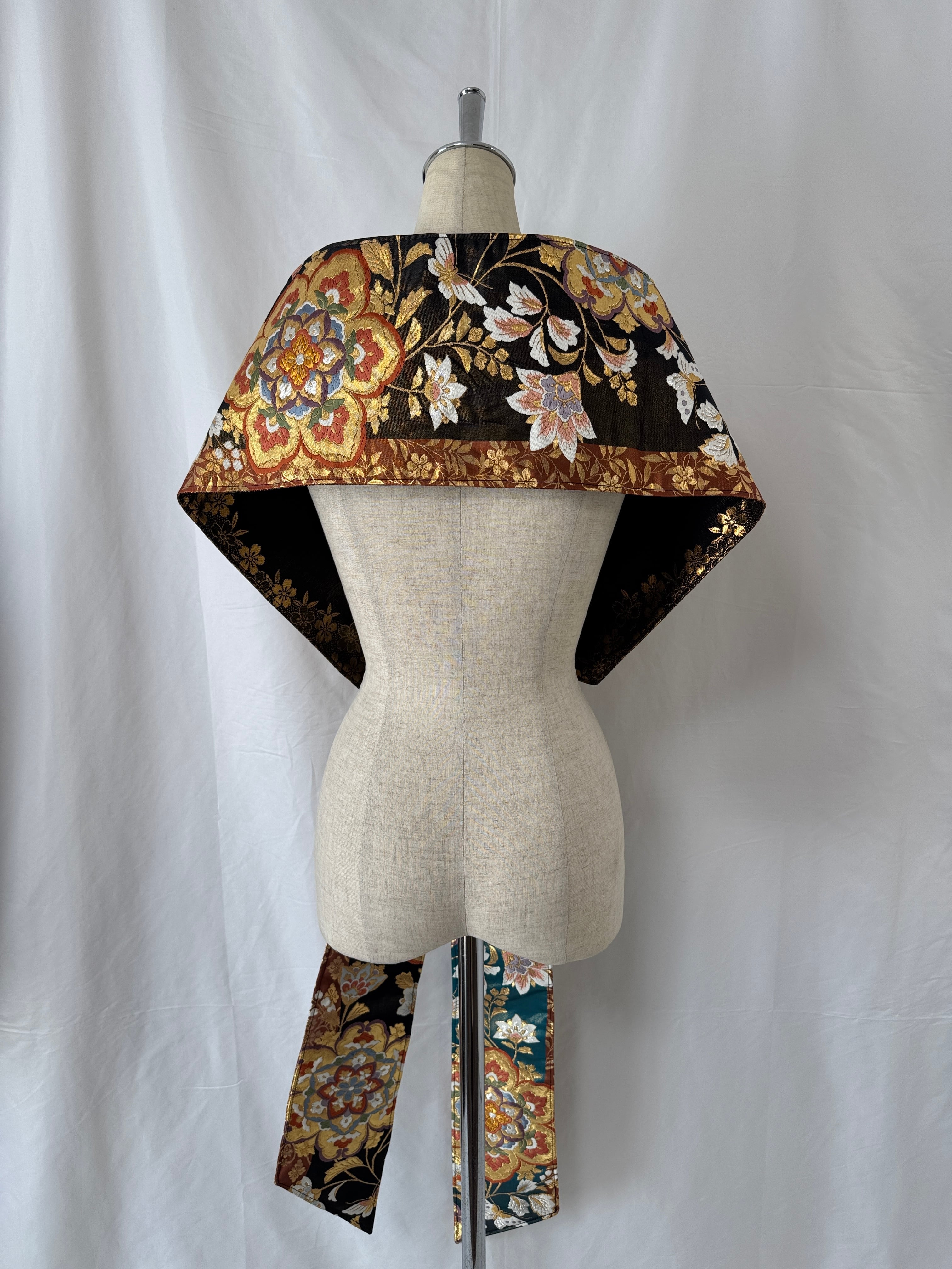 ヴィンテージの帯に新たな命を吹き込み、ショールとしてリメイクした特別な一点物。