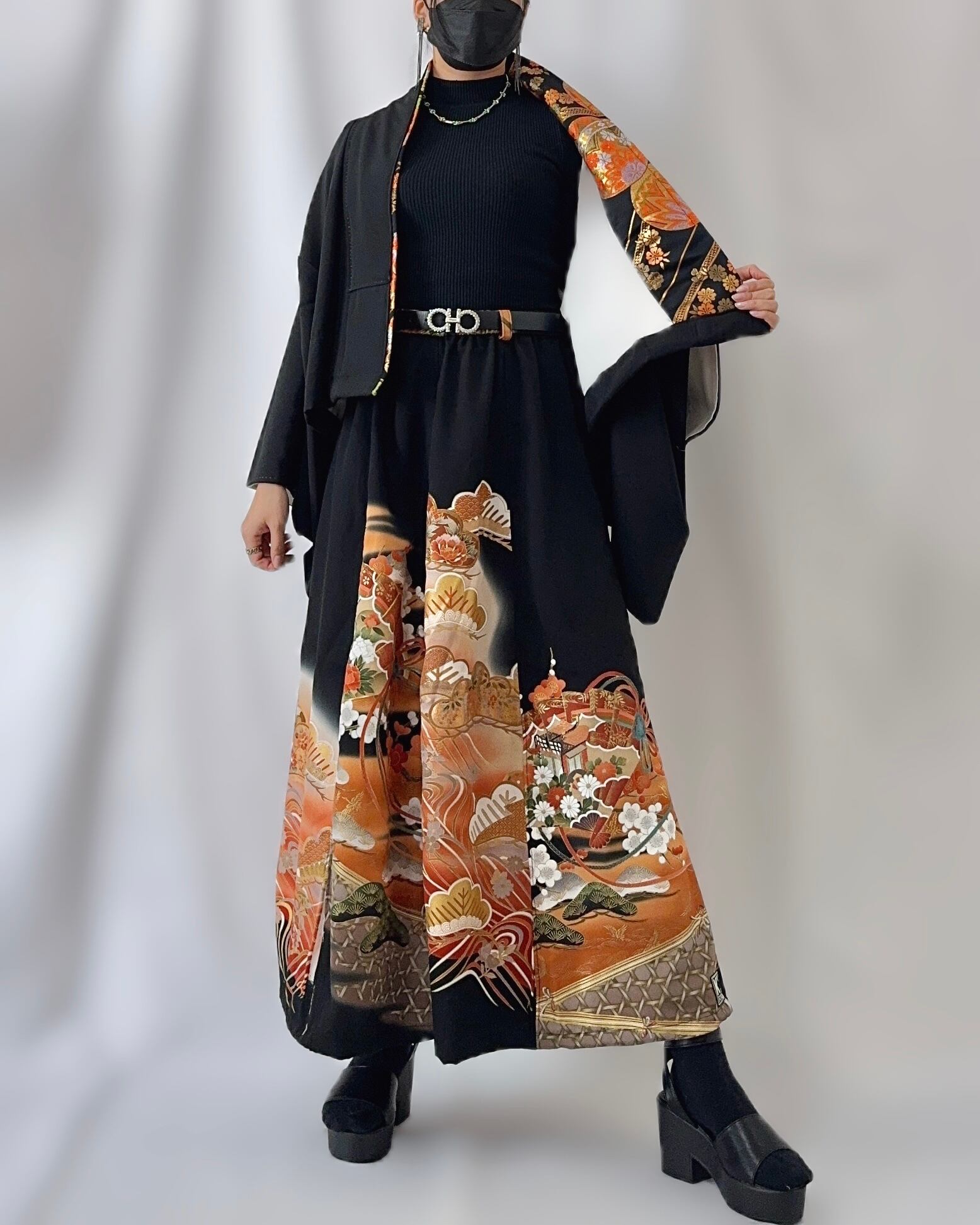 The skirt is crafted by lavishly combining two tomesode kimono.