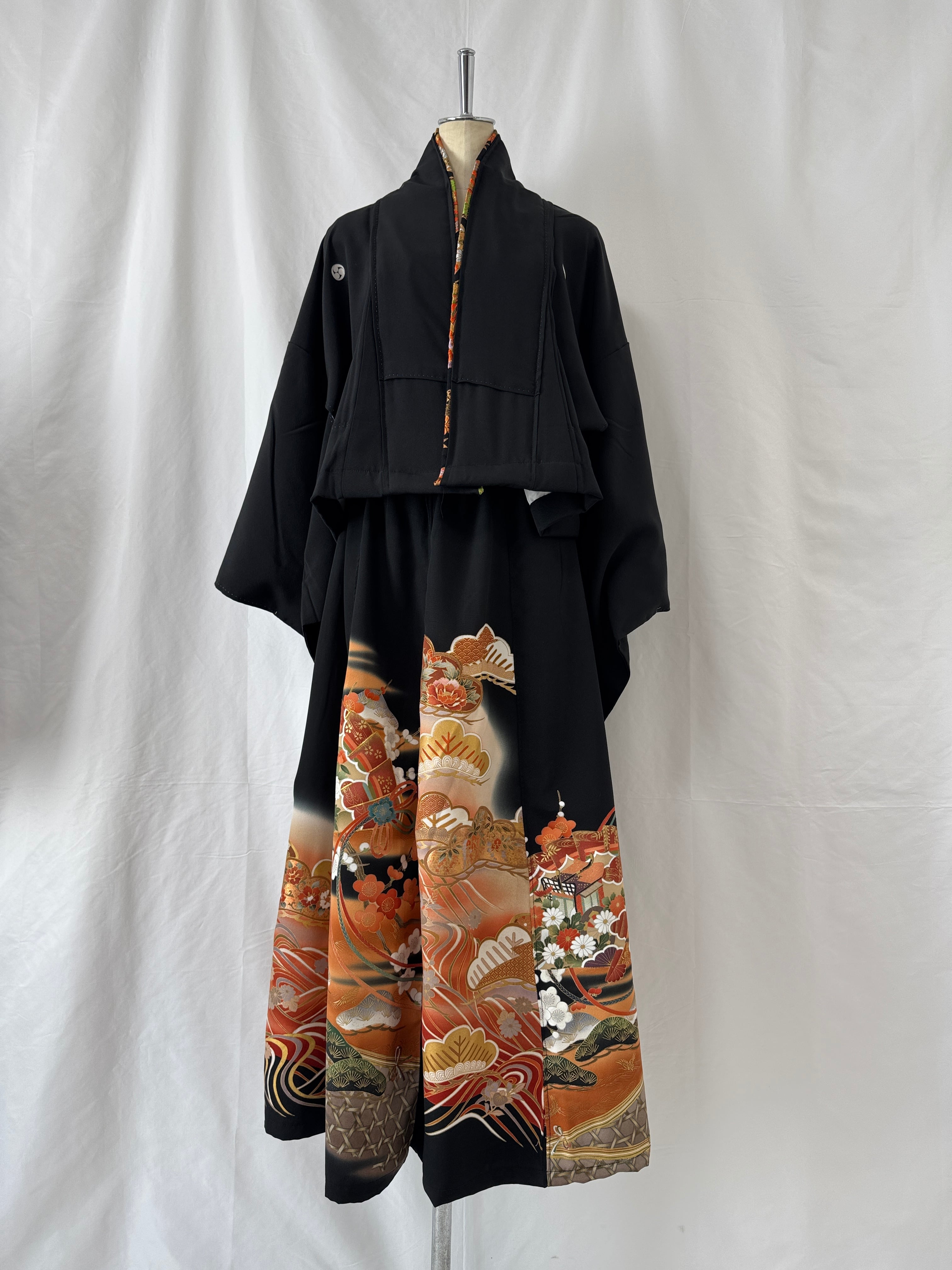 A two-piece set reimagined from vintage tomesode kimono that once graced celebratory occasions, infused with contemporary essence.