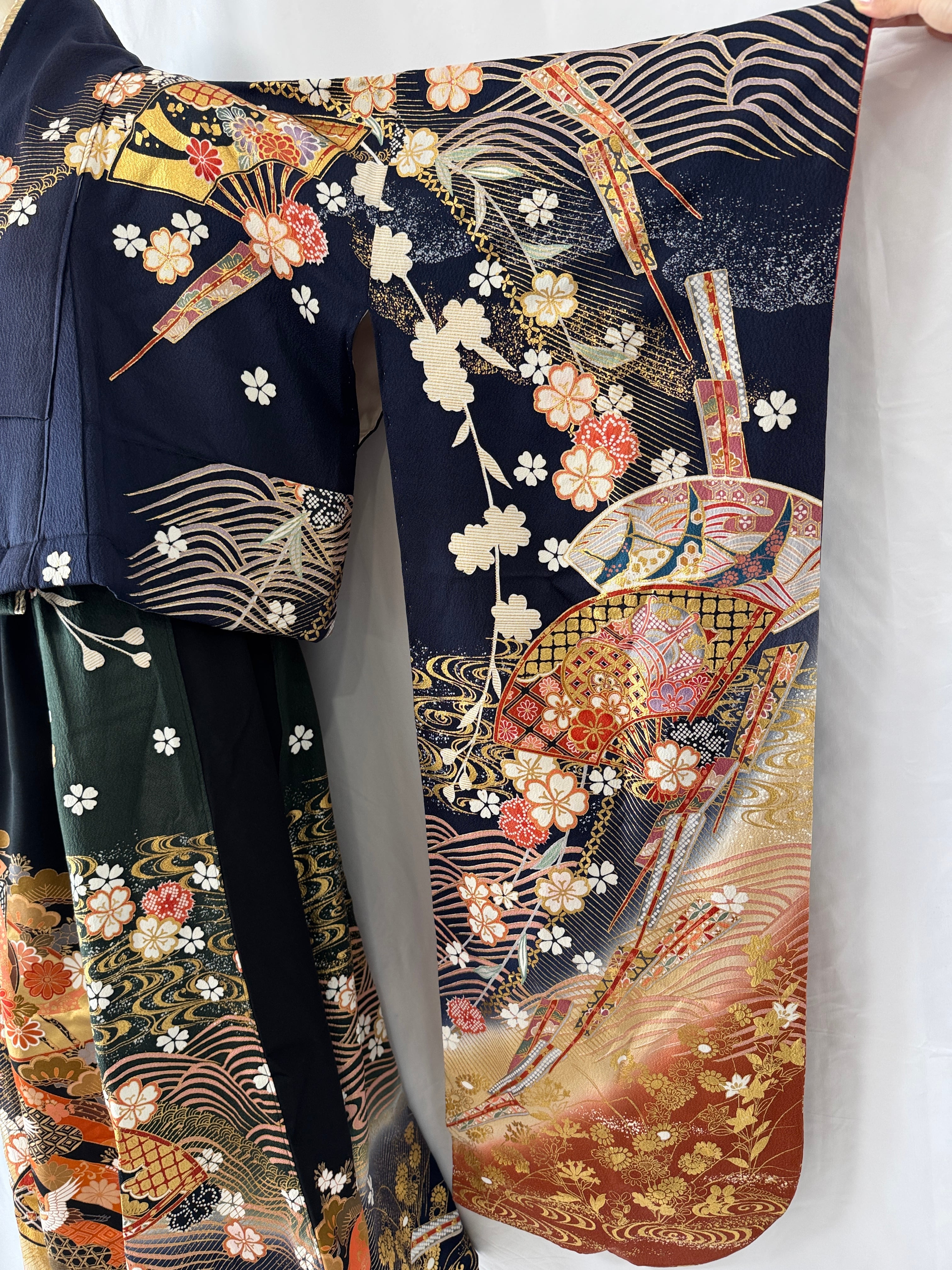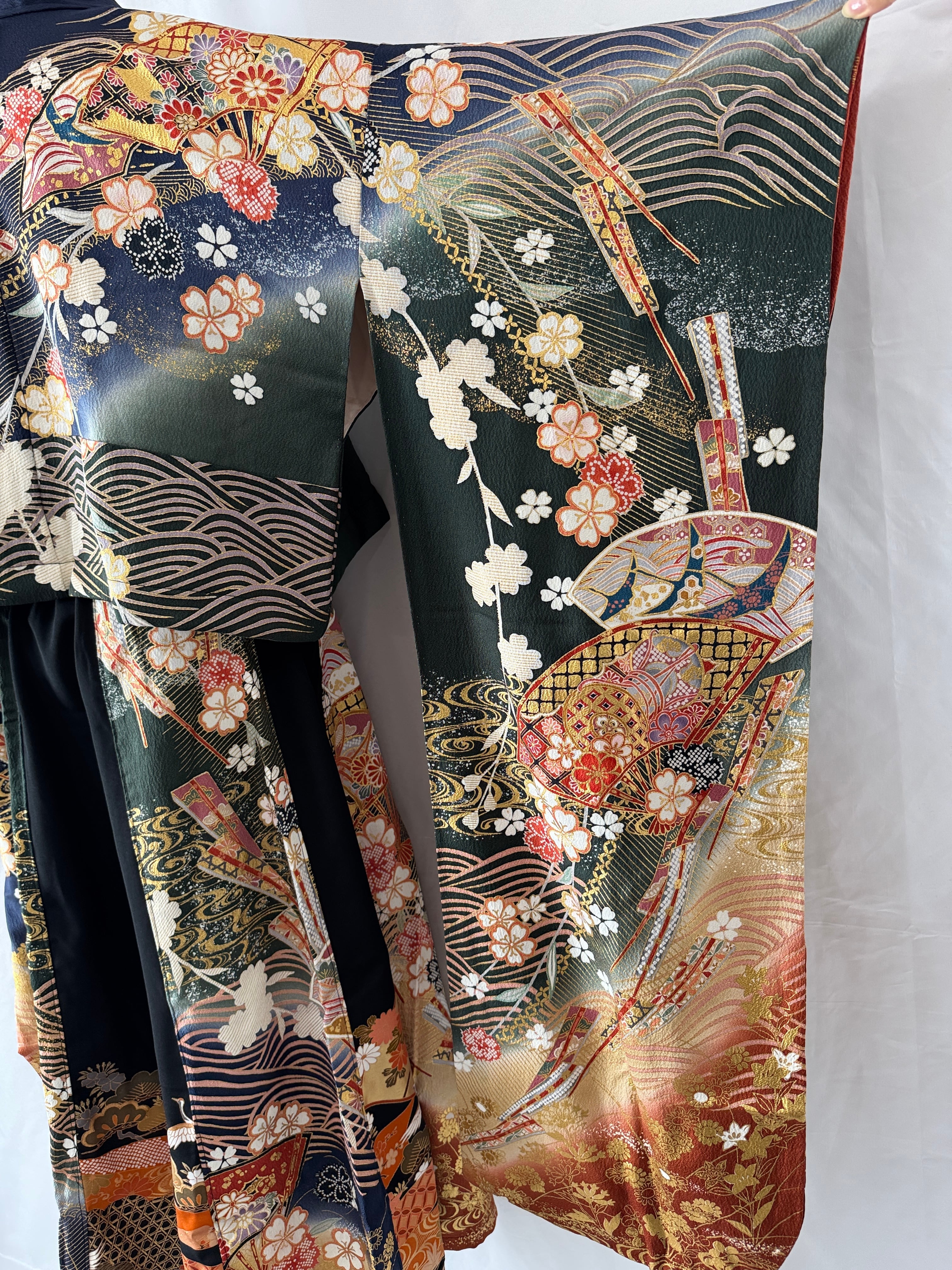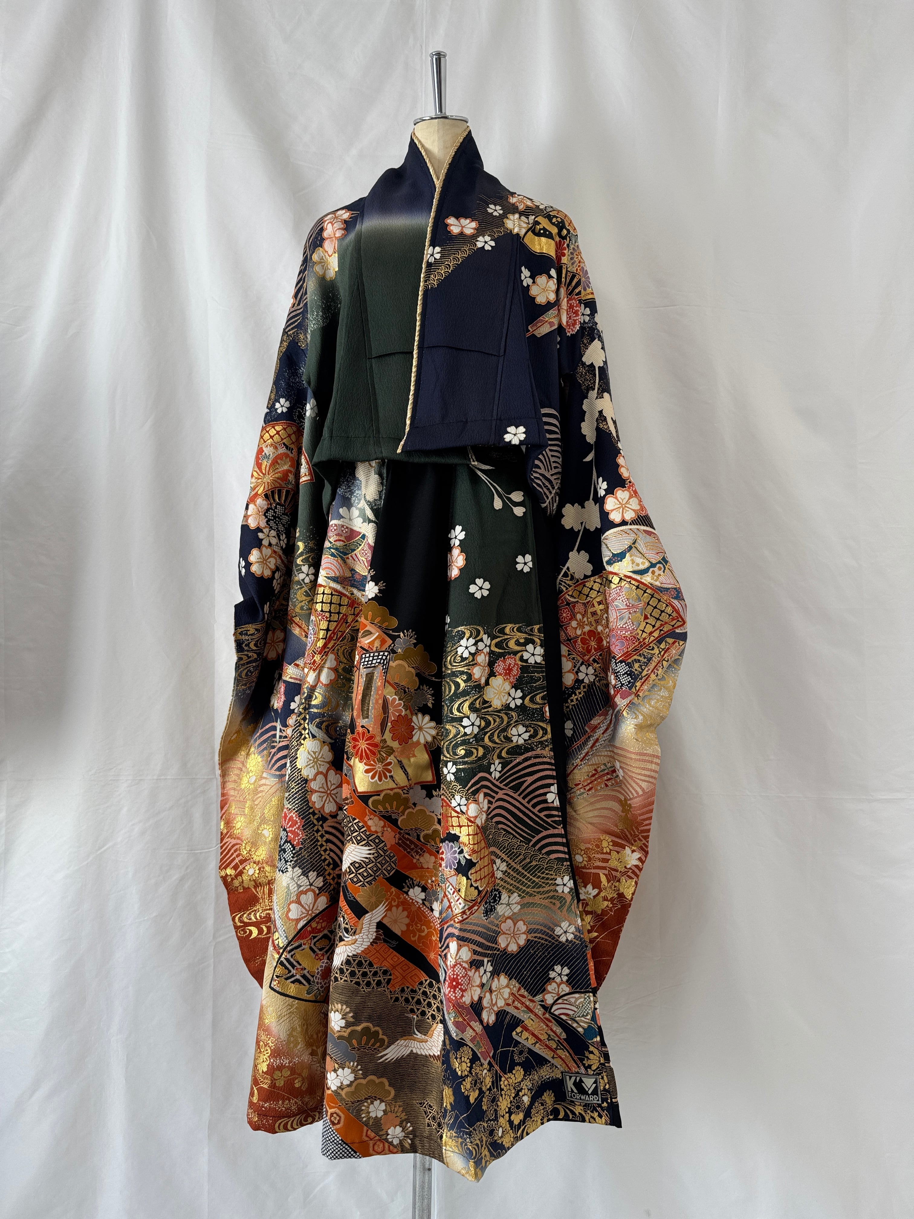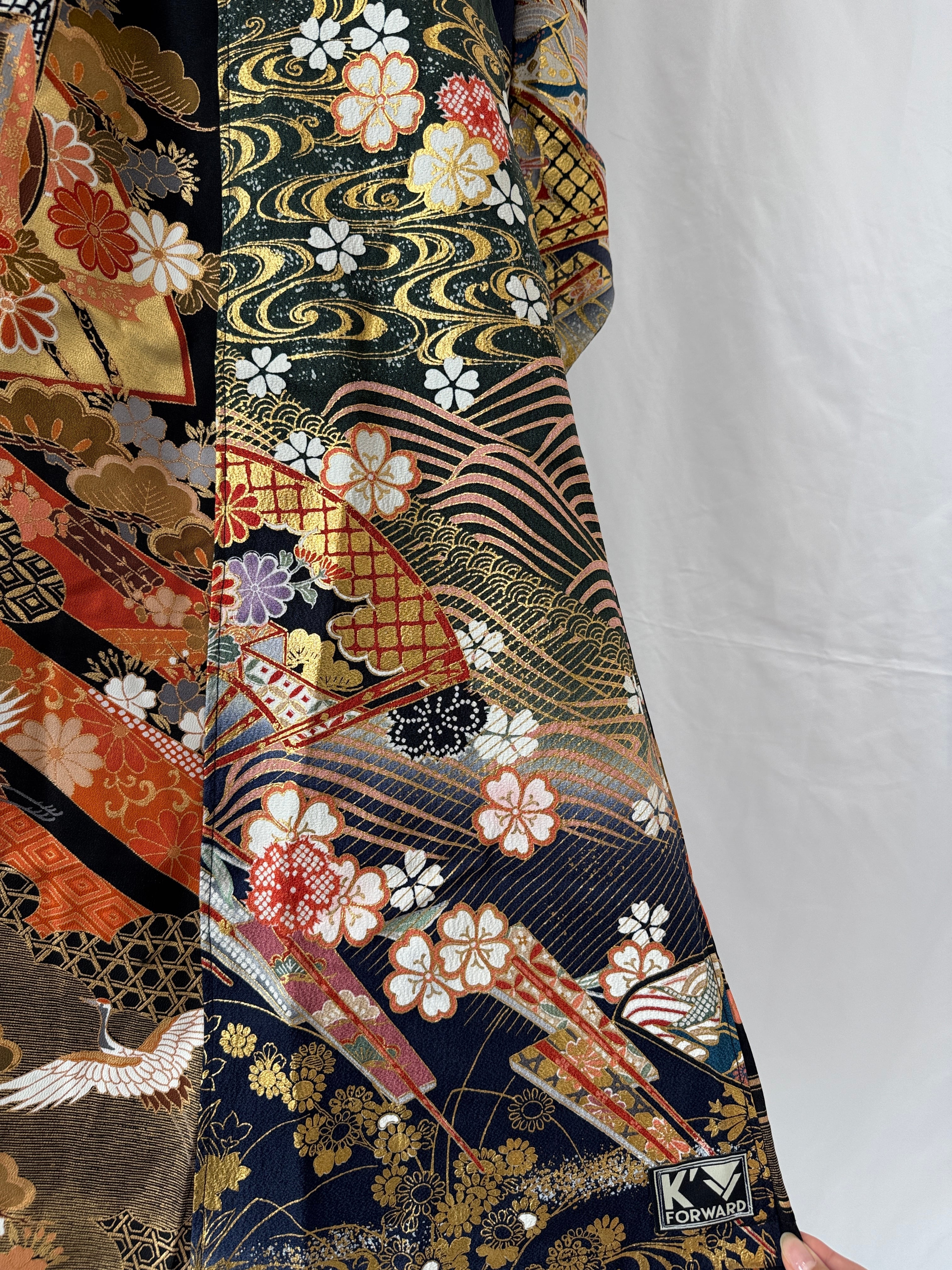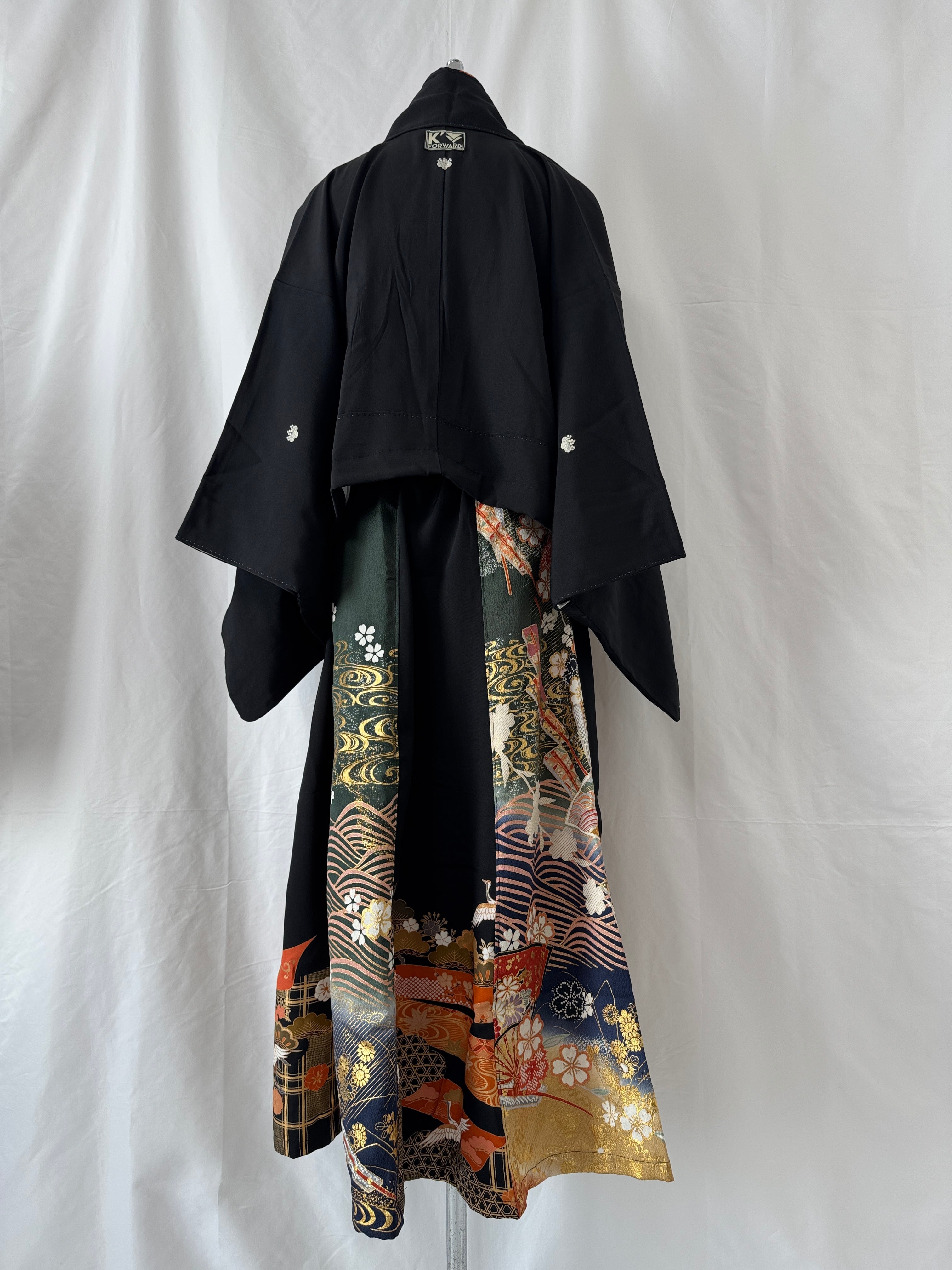 格式高い『振袖』と『黒留袖』を贅沢に掛け合わせ、現代の装いとして再構築したK´FORWARD プレミアムラインの一点物セットアップ。