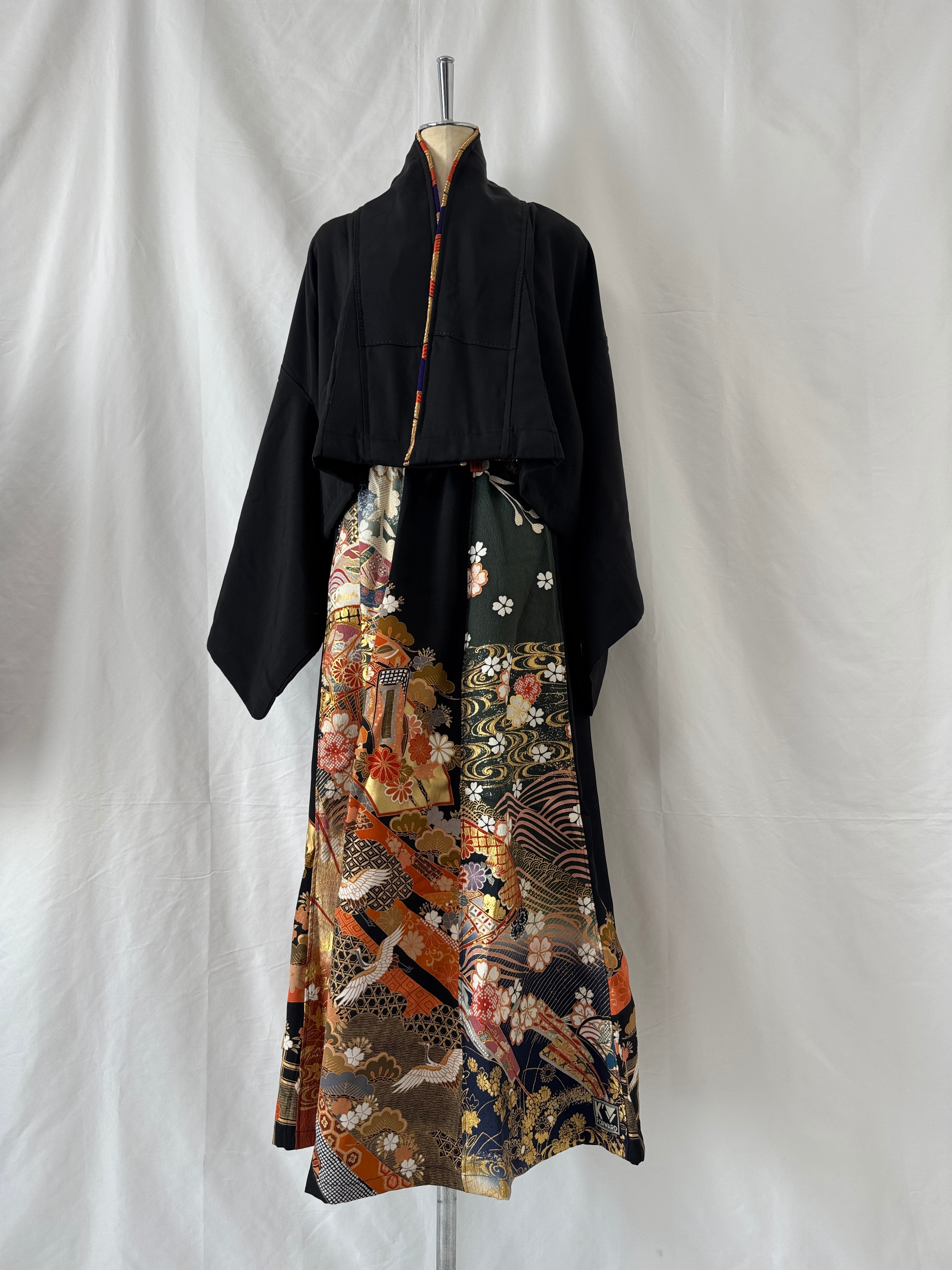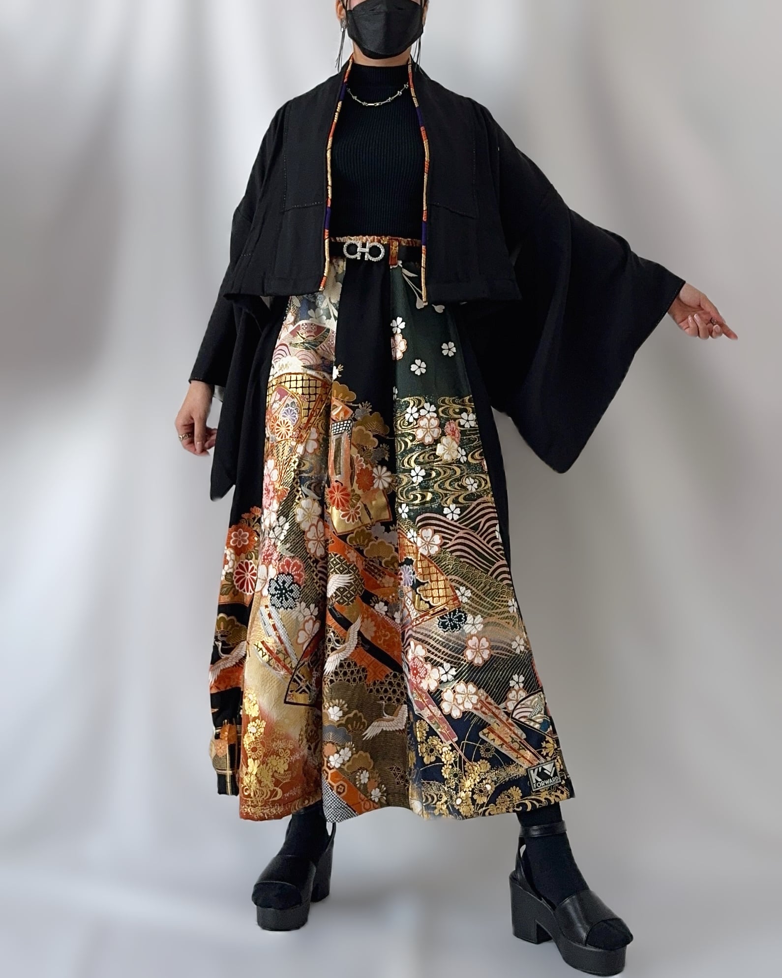 The skirt is crafted by lavishly combining the hem sections of two kimonos, preserving the continuity of the pattern while achieving a beautiful flared silhouette.
