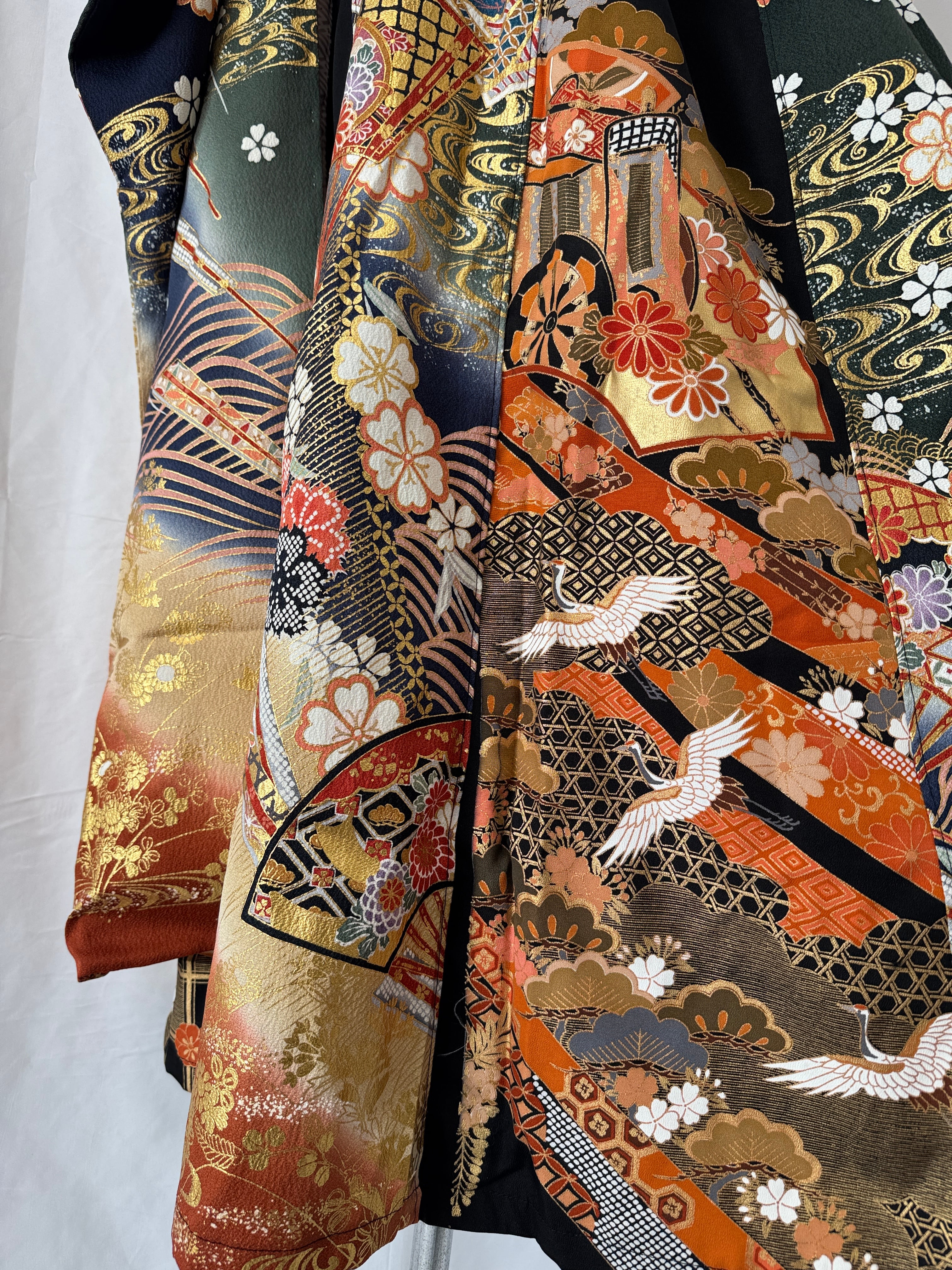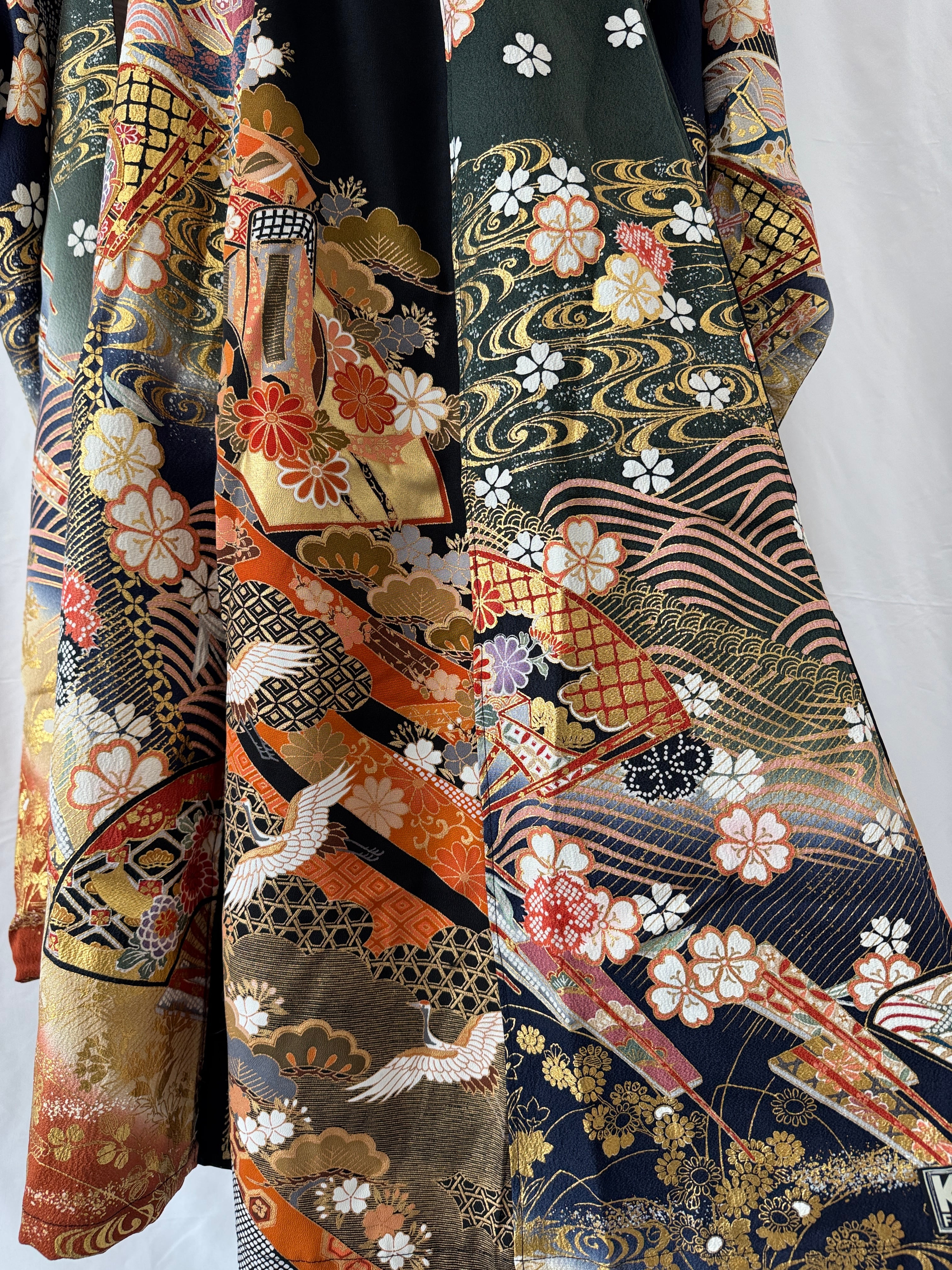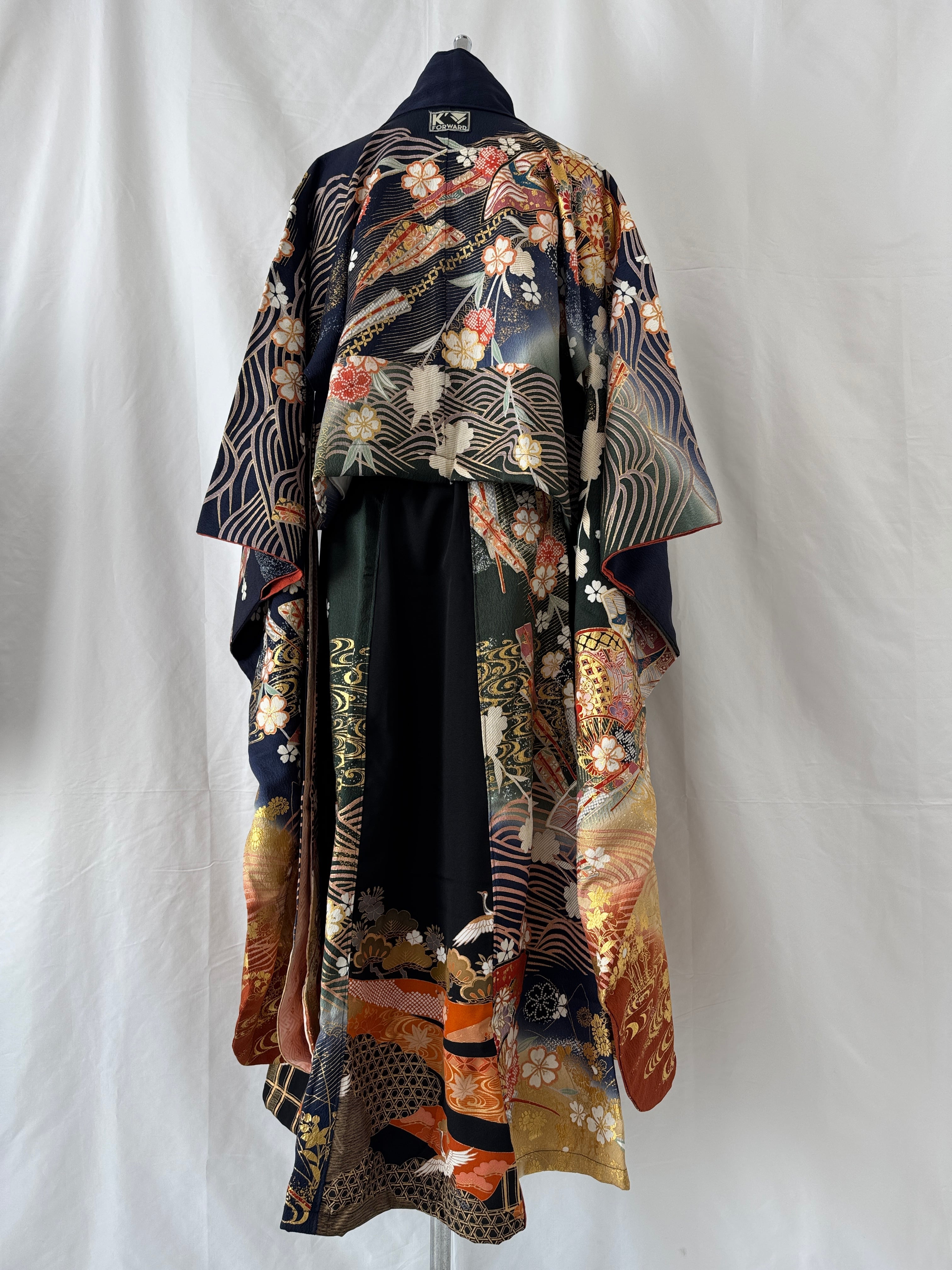 スカートは、2着の着物の裾部分を贅沢に組み合わせて制作することで、柄のつながりを活かしつつ、美しいフレアシルエットが実現しています。