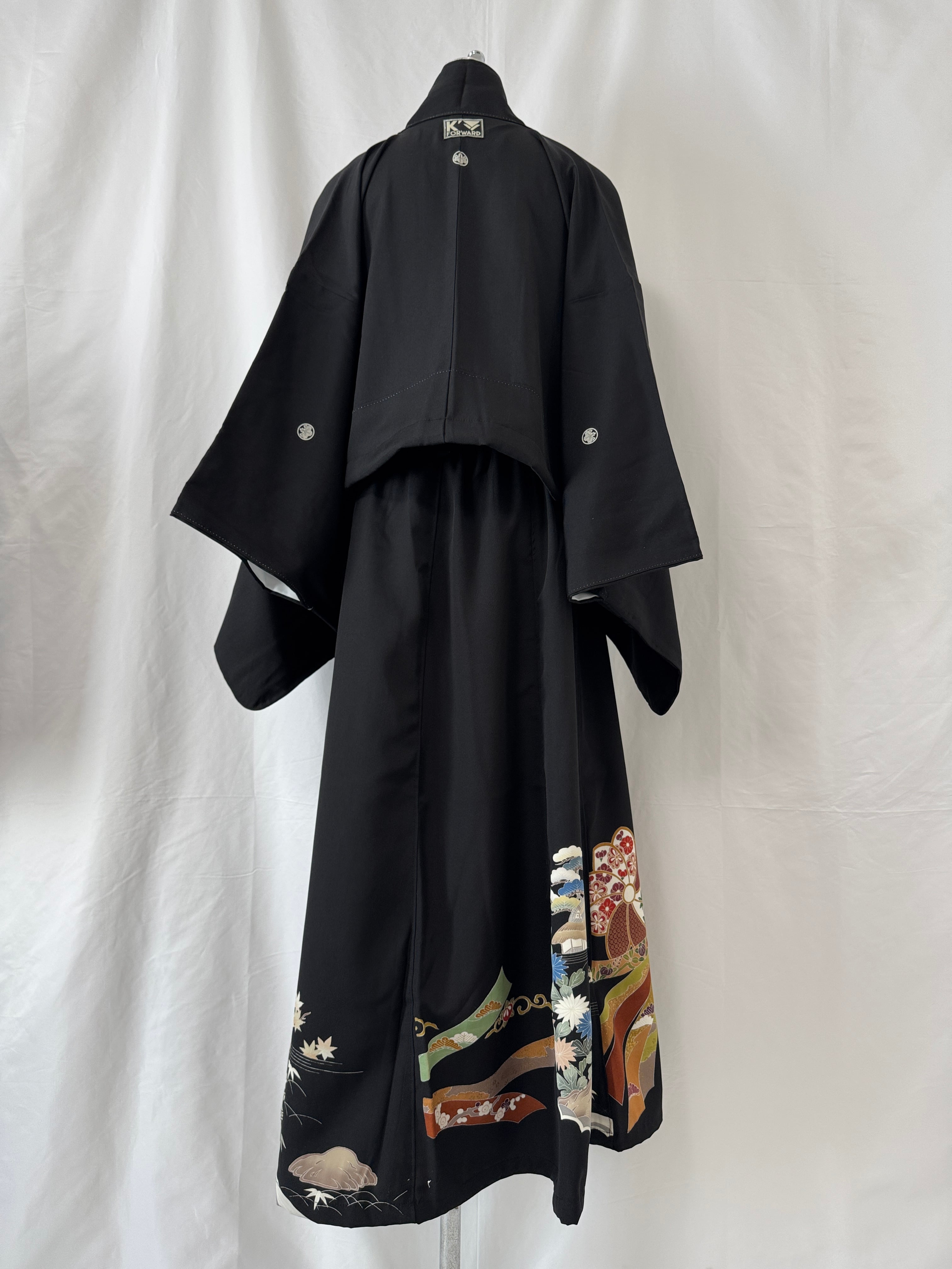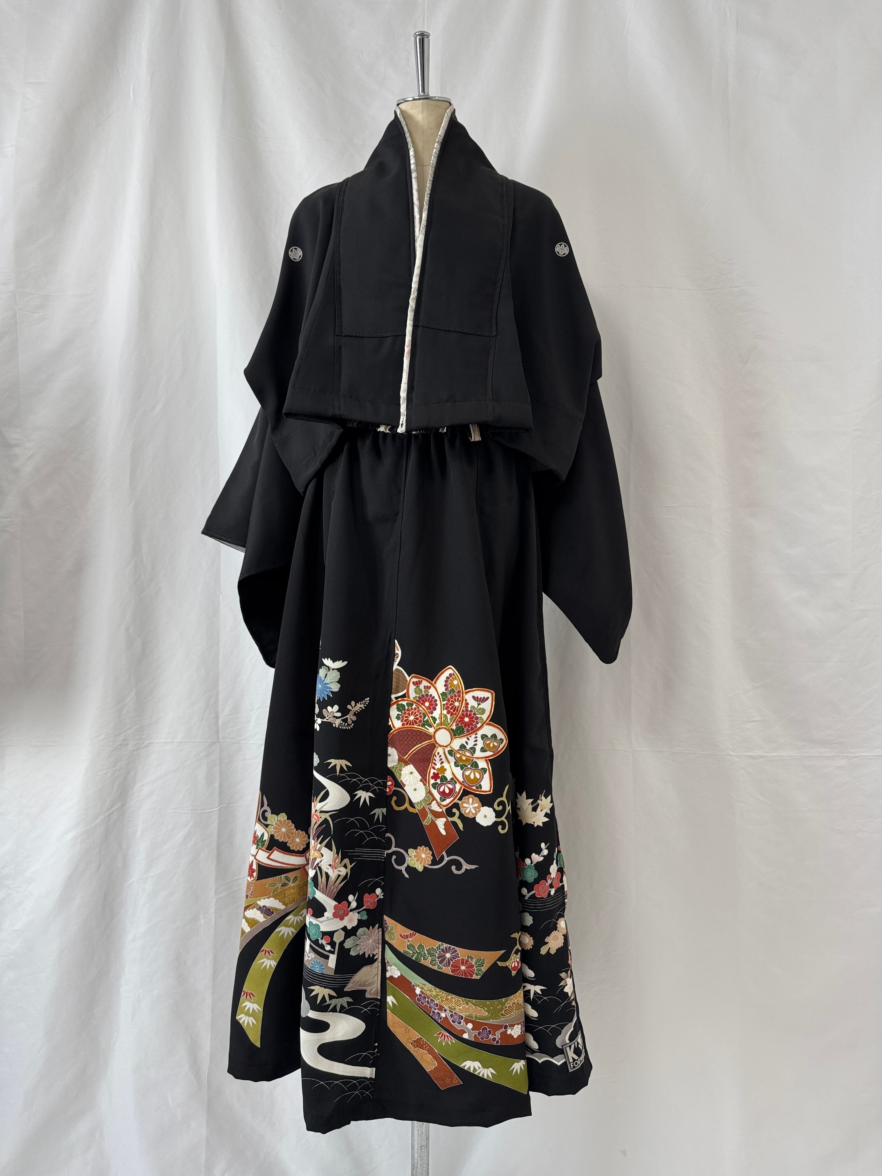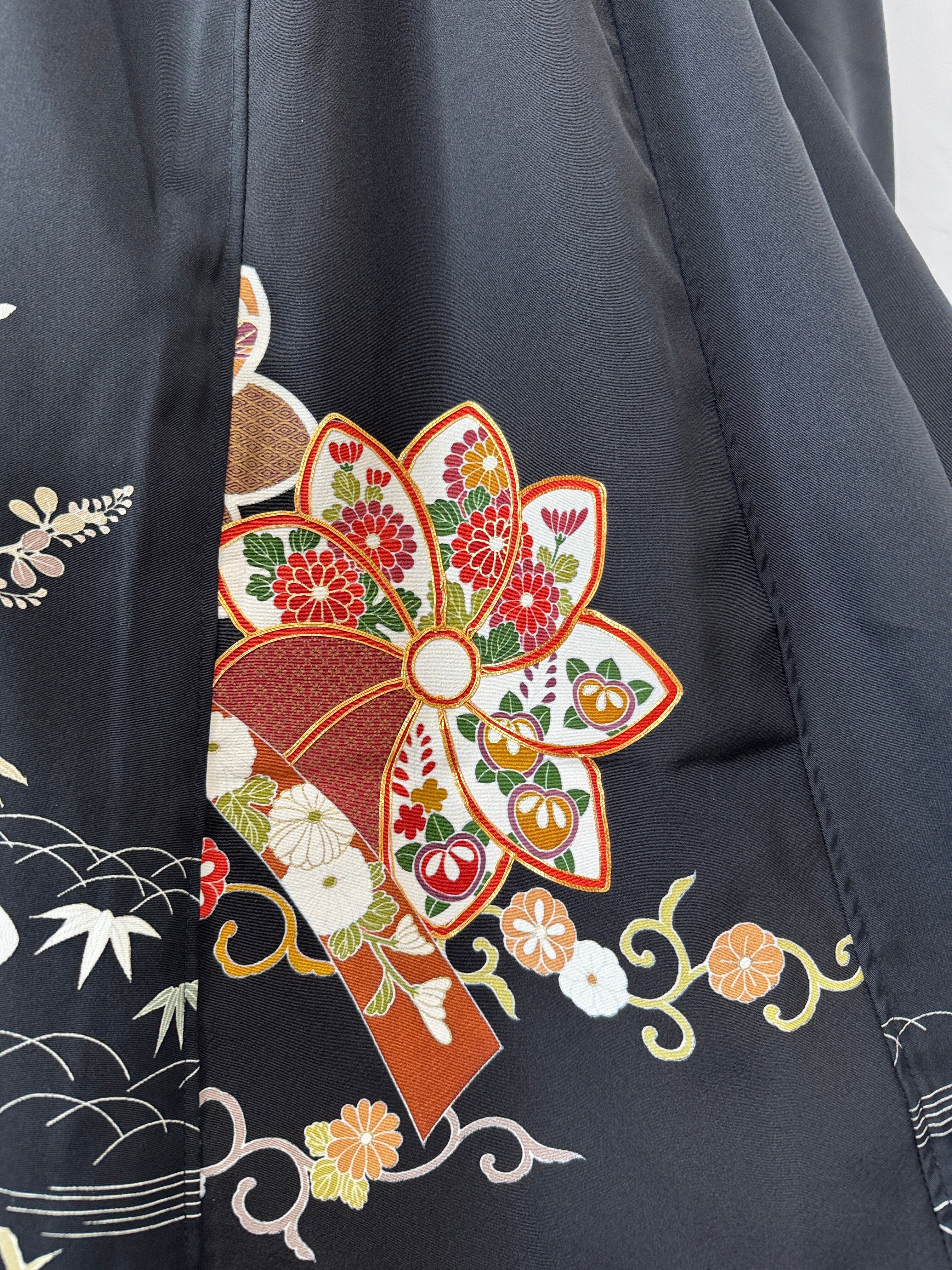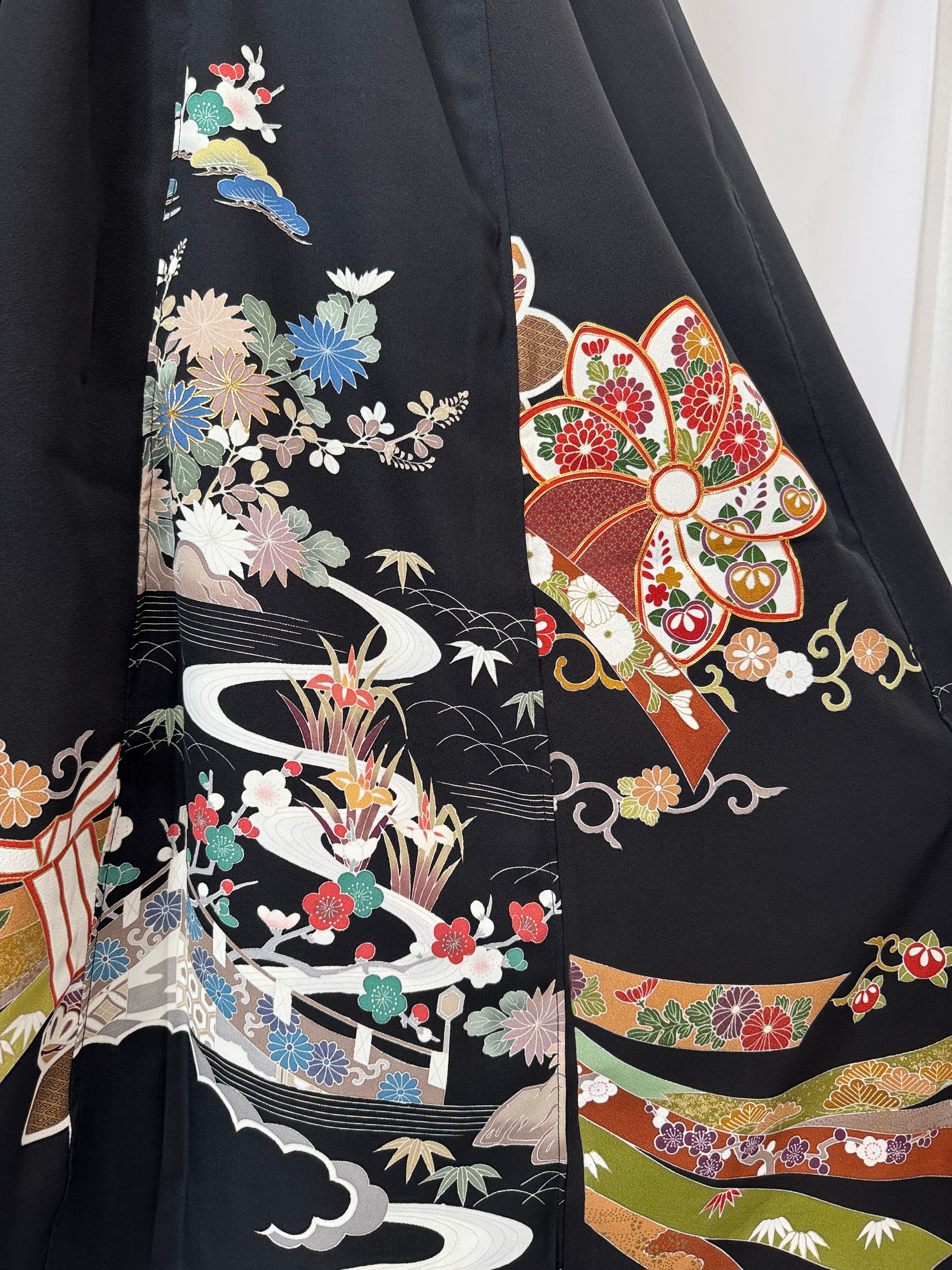 スカートは、2着の黒留袖を贅沢に組み合わせて制作することで、柄のつながりを活かしつつ、美しいフレアシルエットが実現しています。