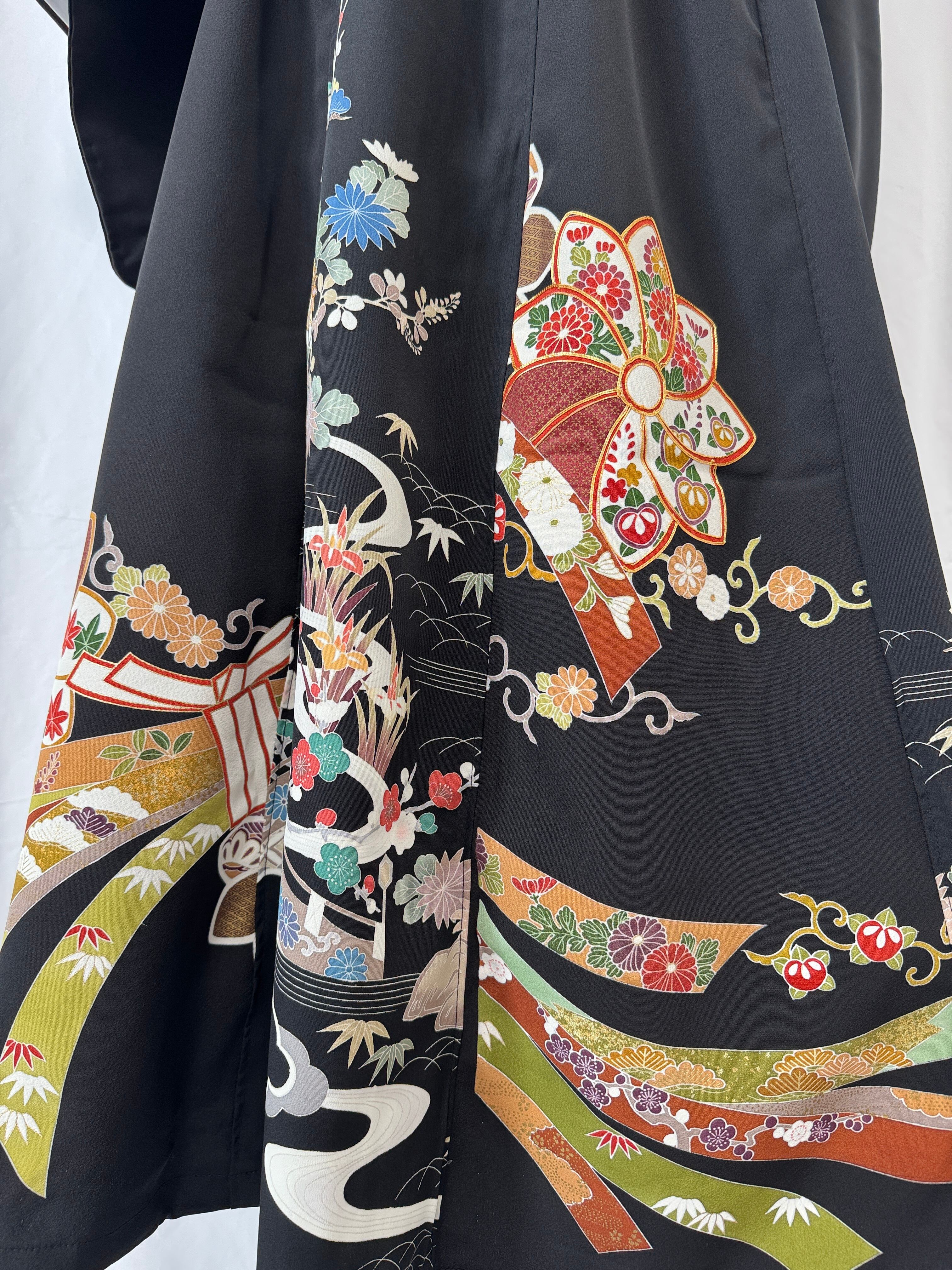 This kimono features striking auspicious motifs unique to tomesode kimonos, including cranes, imperial carriages, pine trees, and flowers.