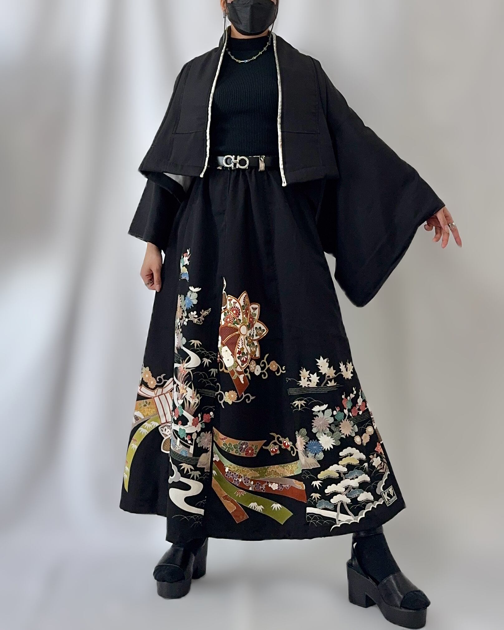 The skirt is crafted by lavishly combining two kimonos, preserving the continuity of the patterns while achieving a beautiful flared silhouette.