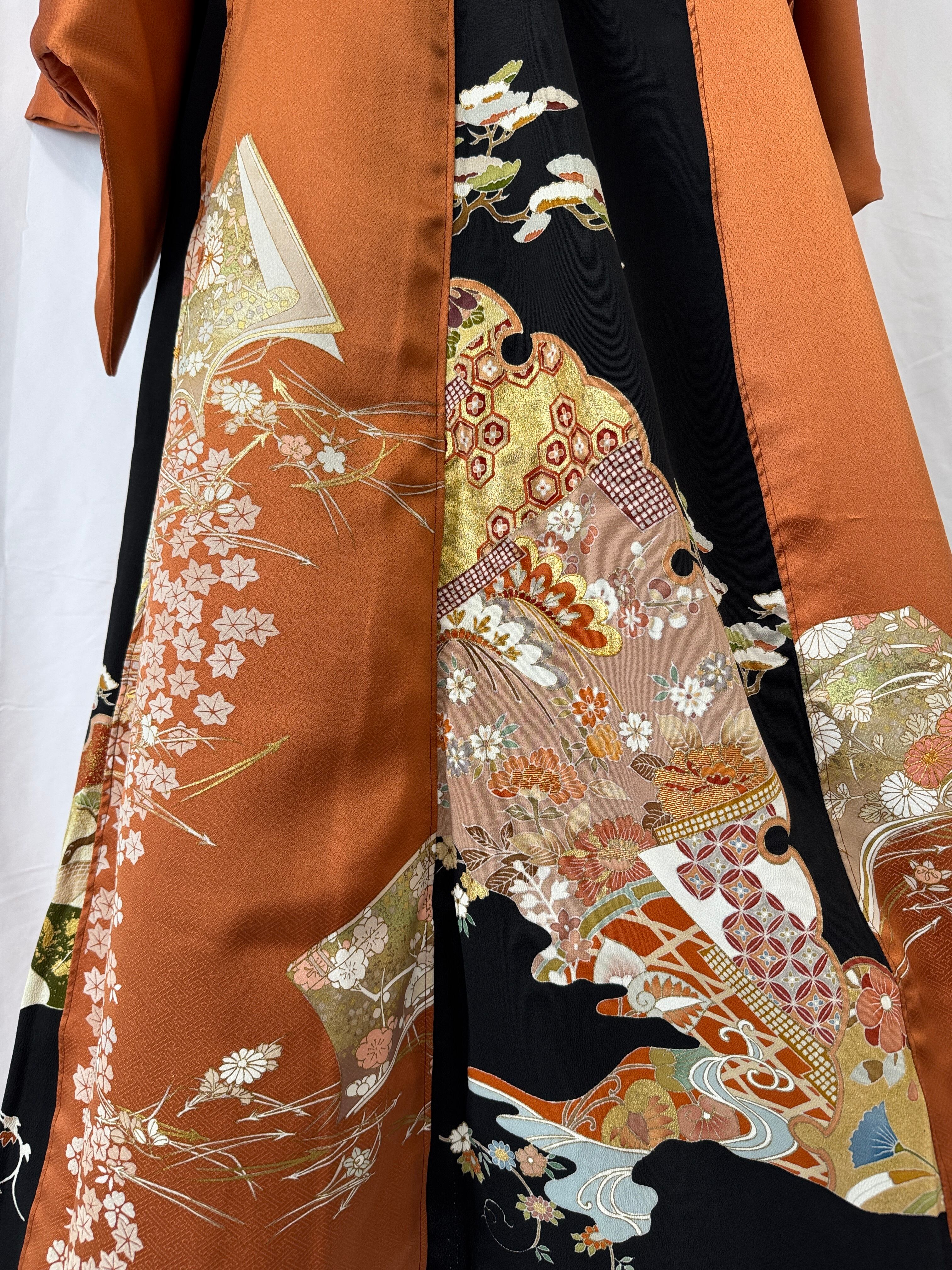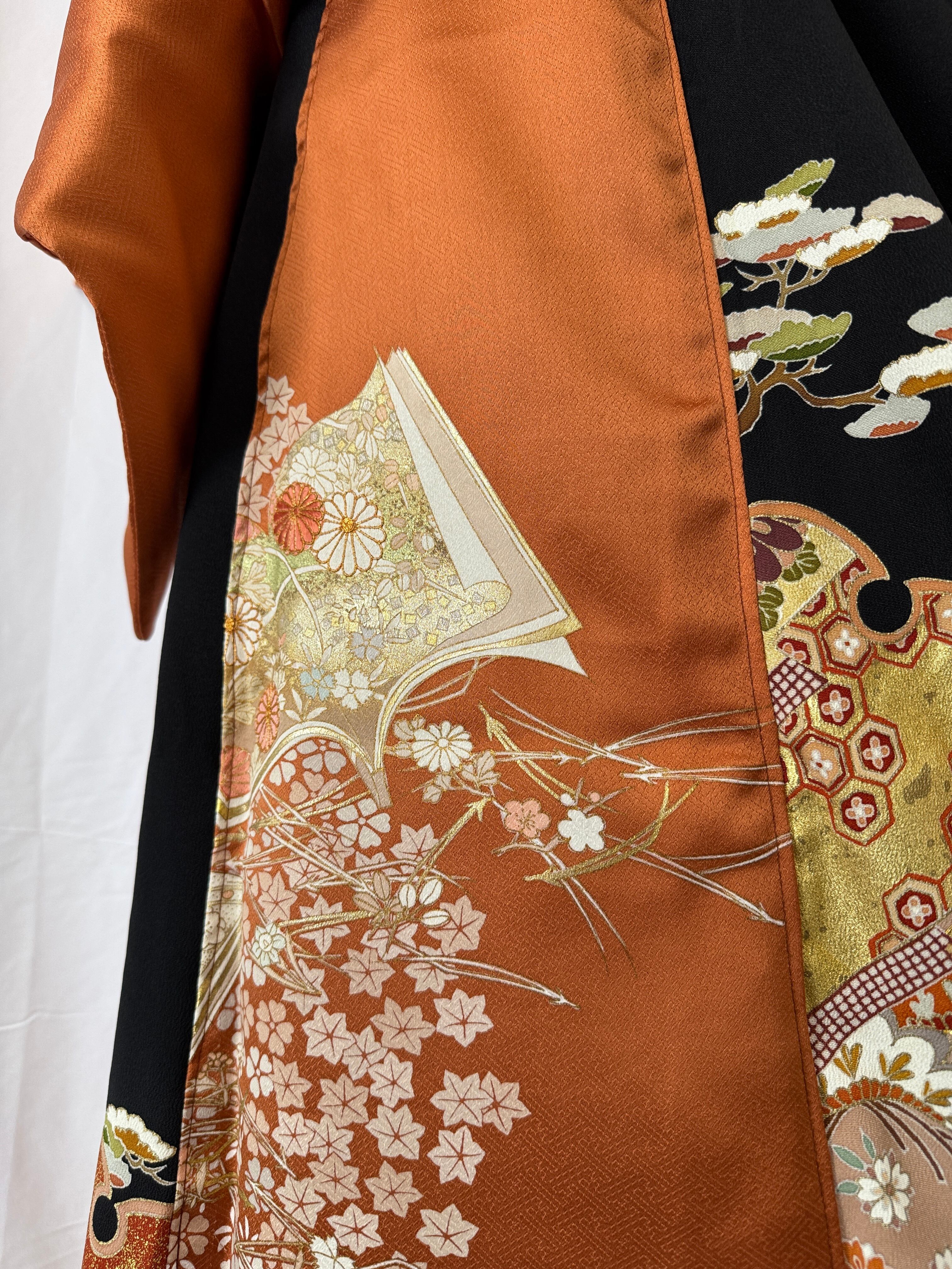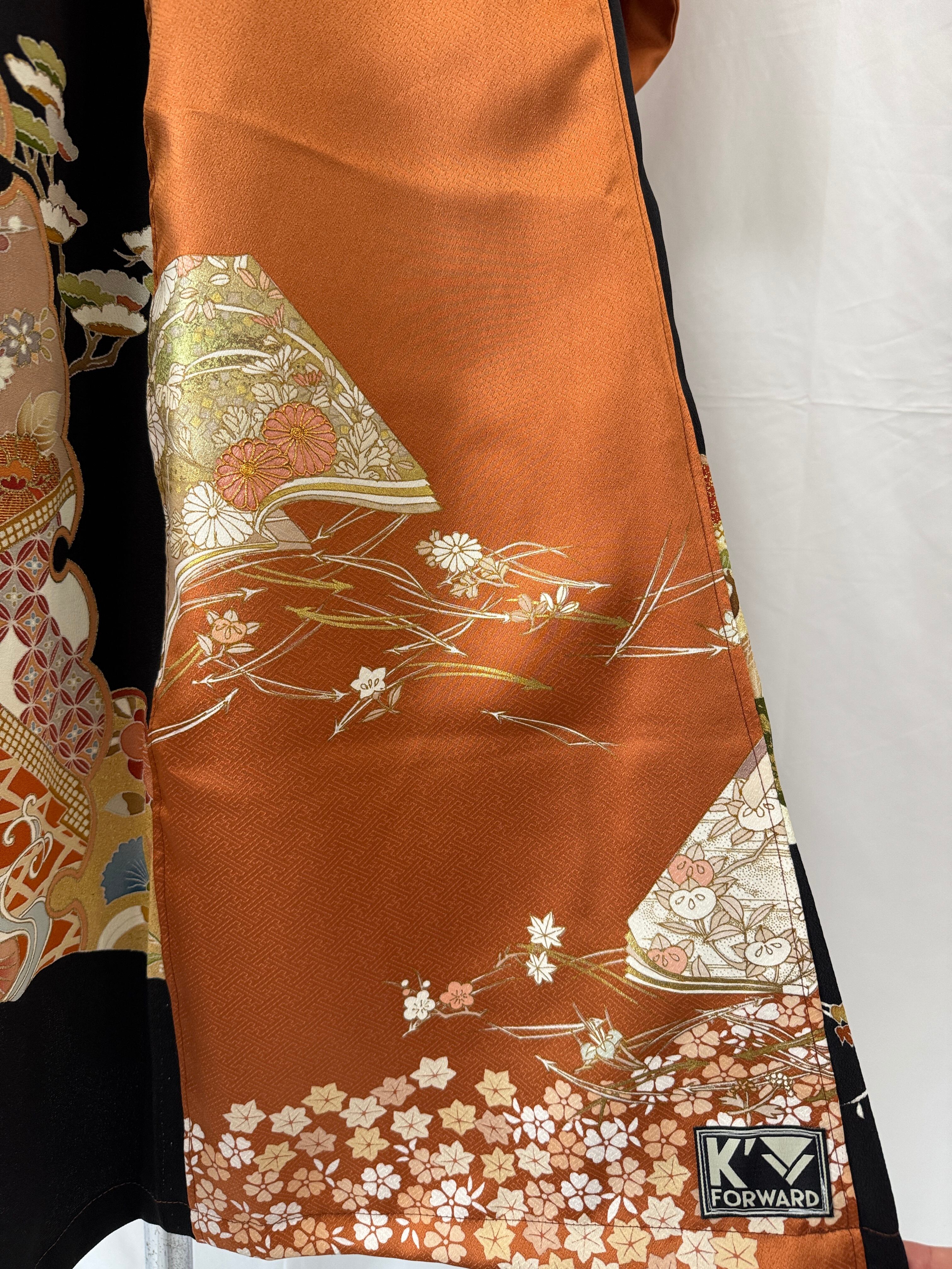 The warm orange houmongi kimono is enhanced with the deep, intricate patterns and refined structure unique to tomesode kimonos, creating a sophisticated contrast that avoids excessive sweetness.