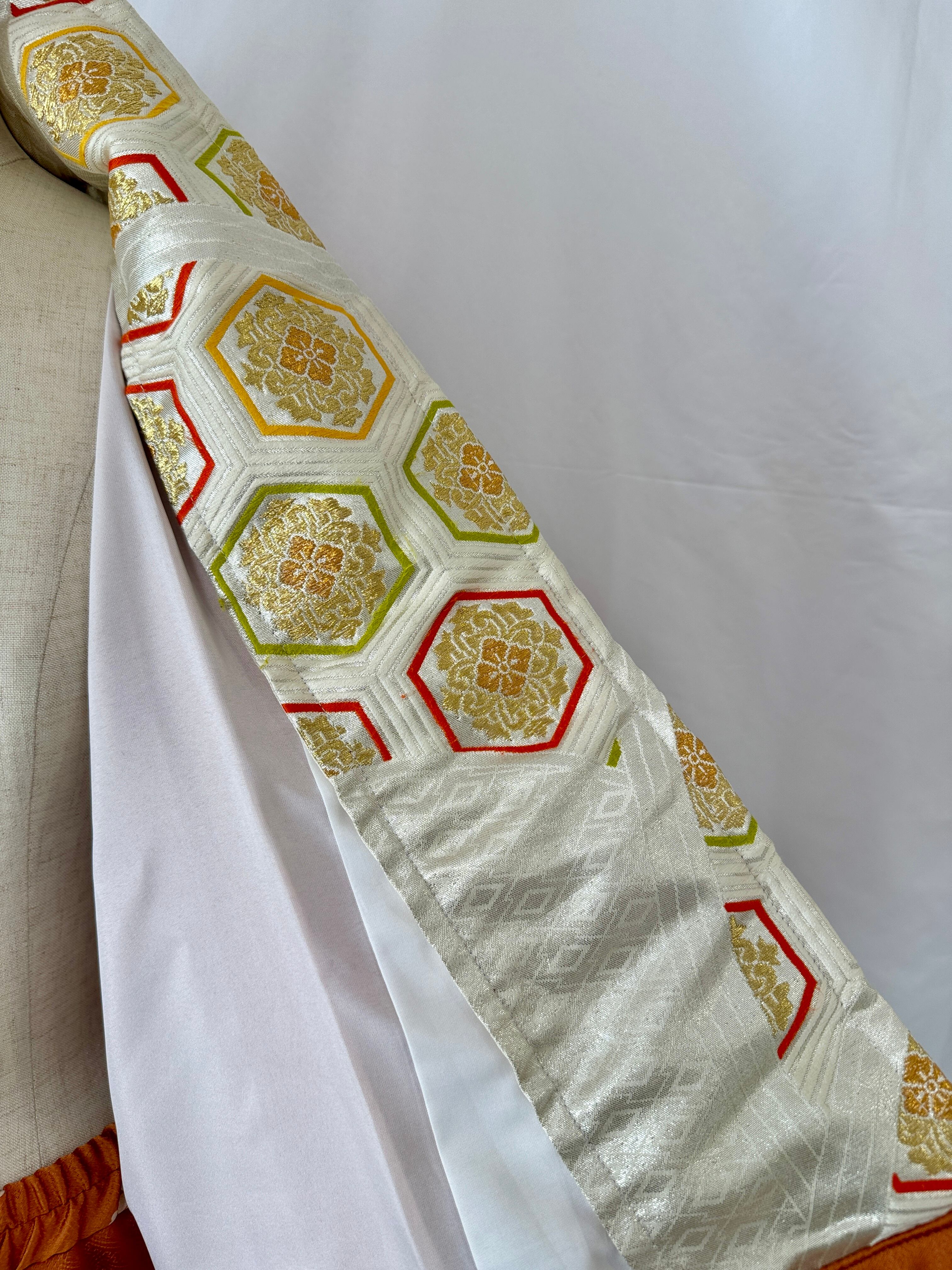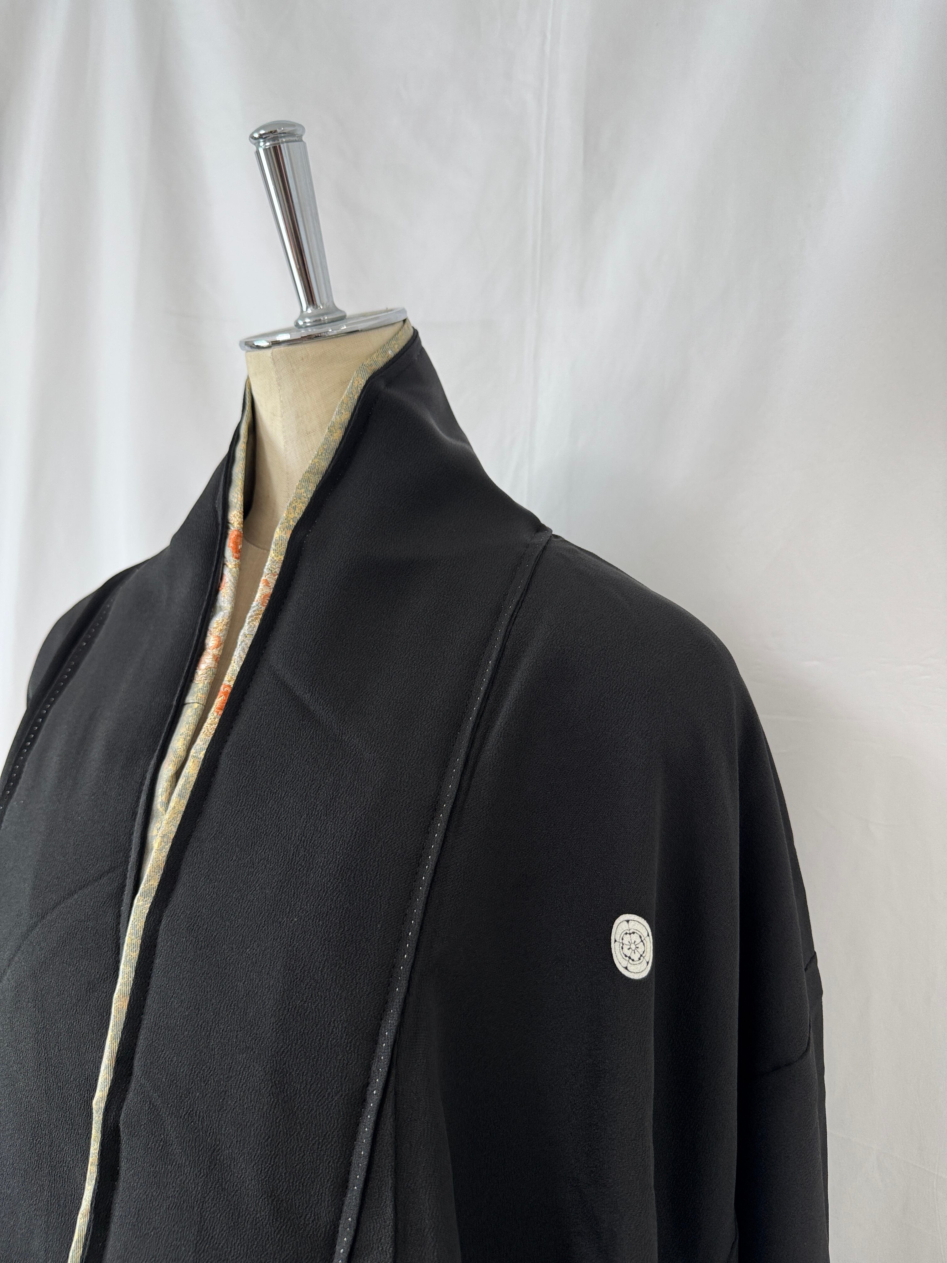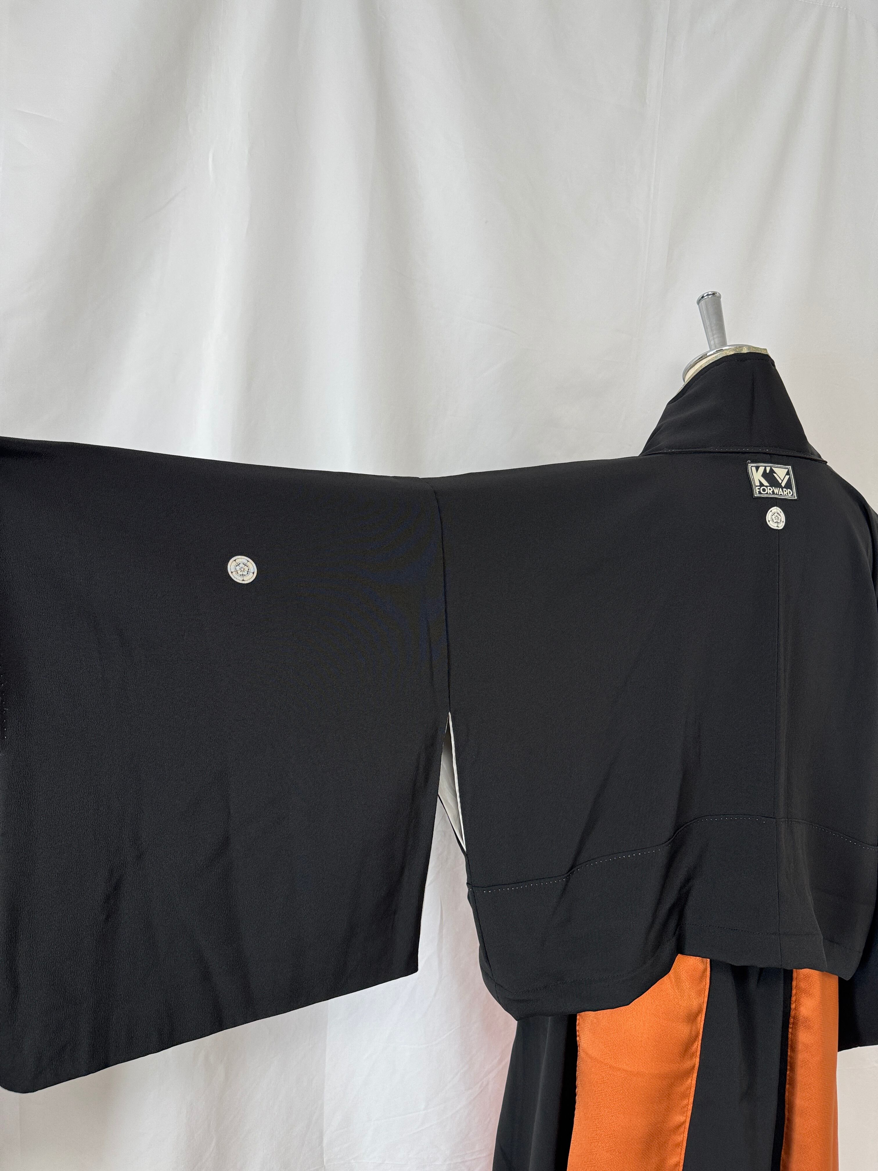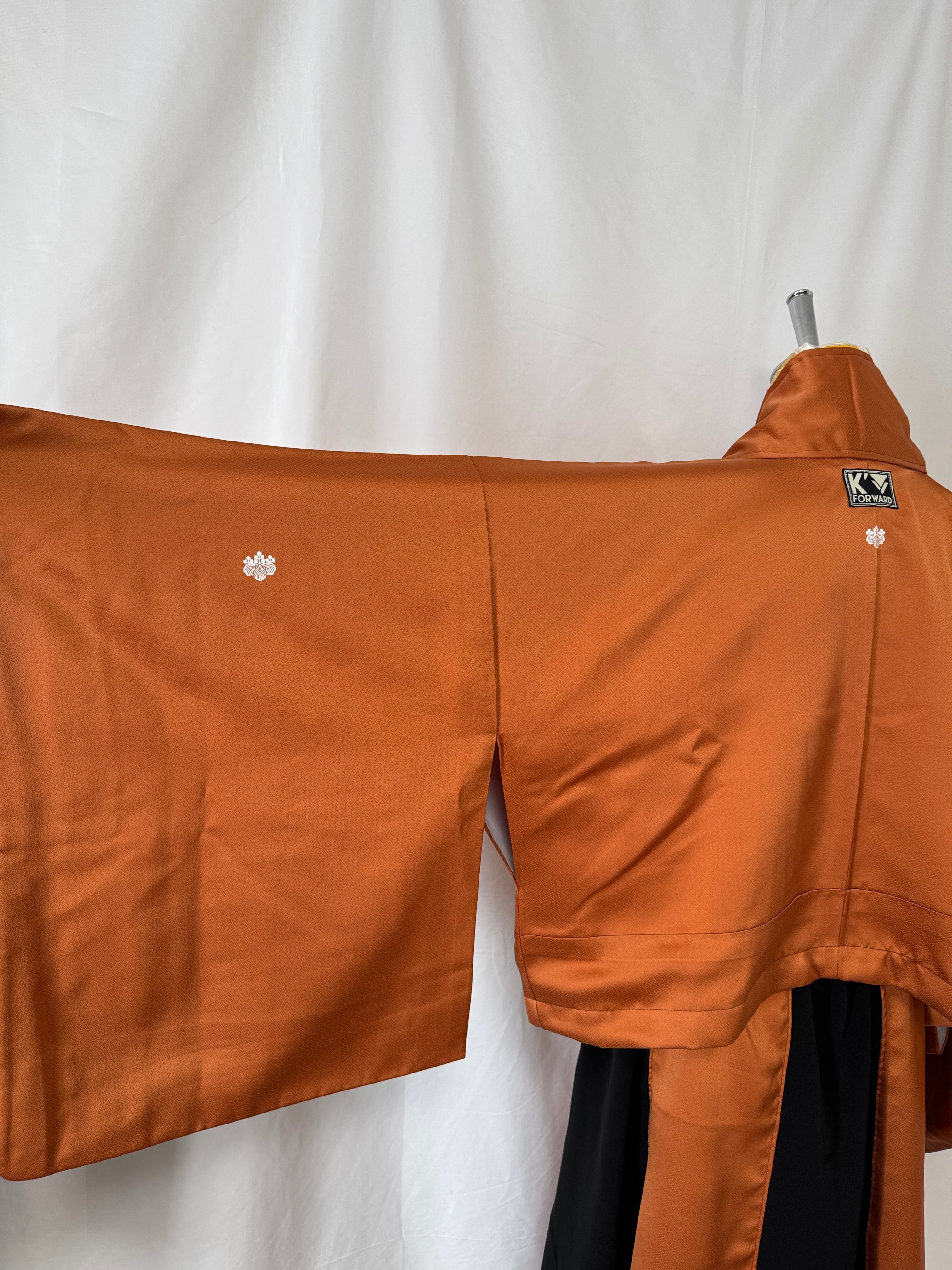 The warm orange houmongi kimono is enhanced with the deep, intricate patterns and refined structure unique to tomesode kimonos, creating a sophisticated contrast that avoids excessive sweetness.