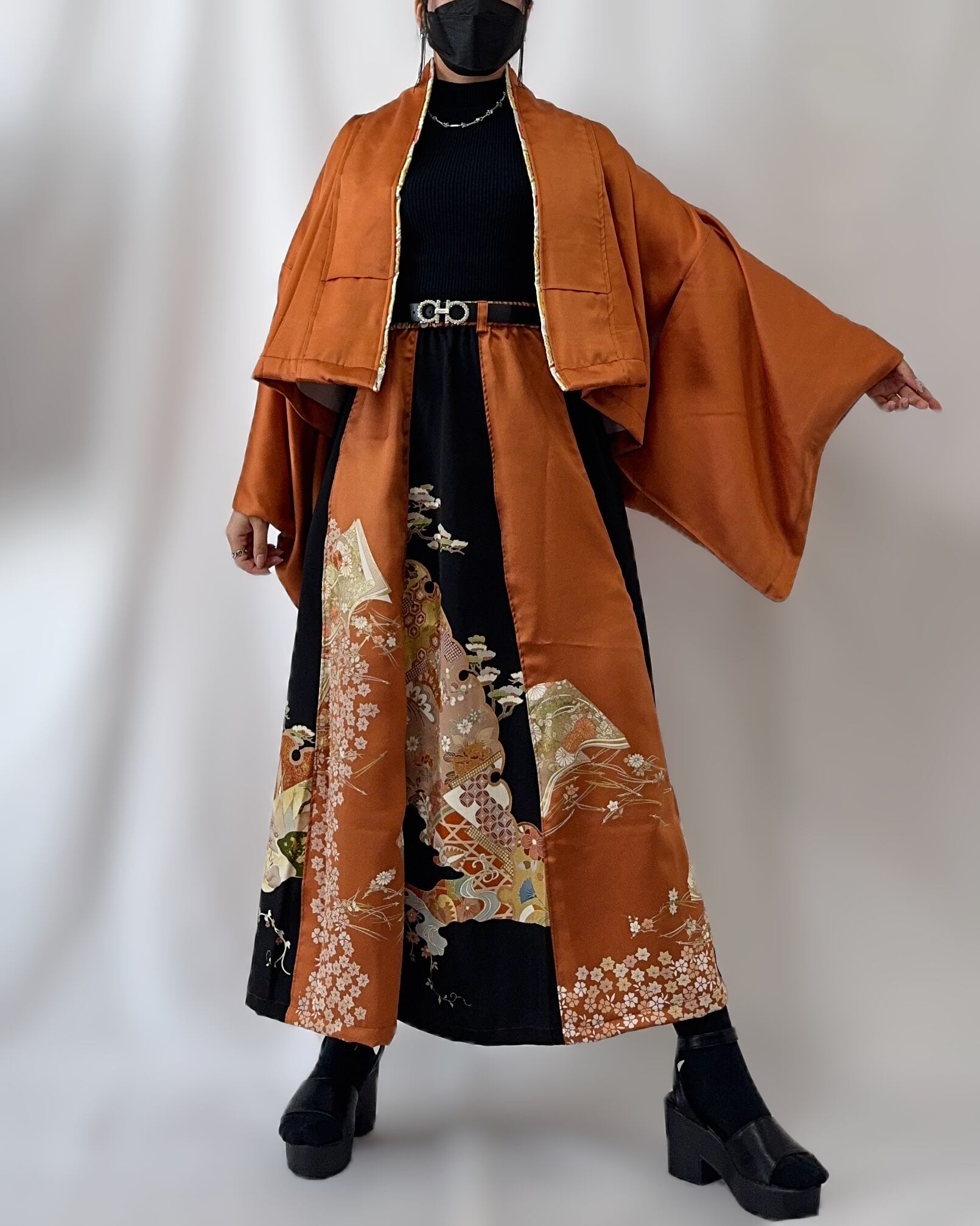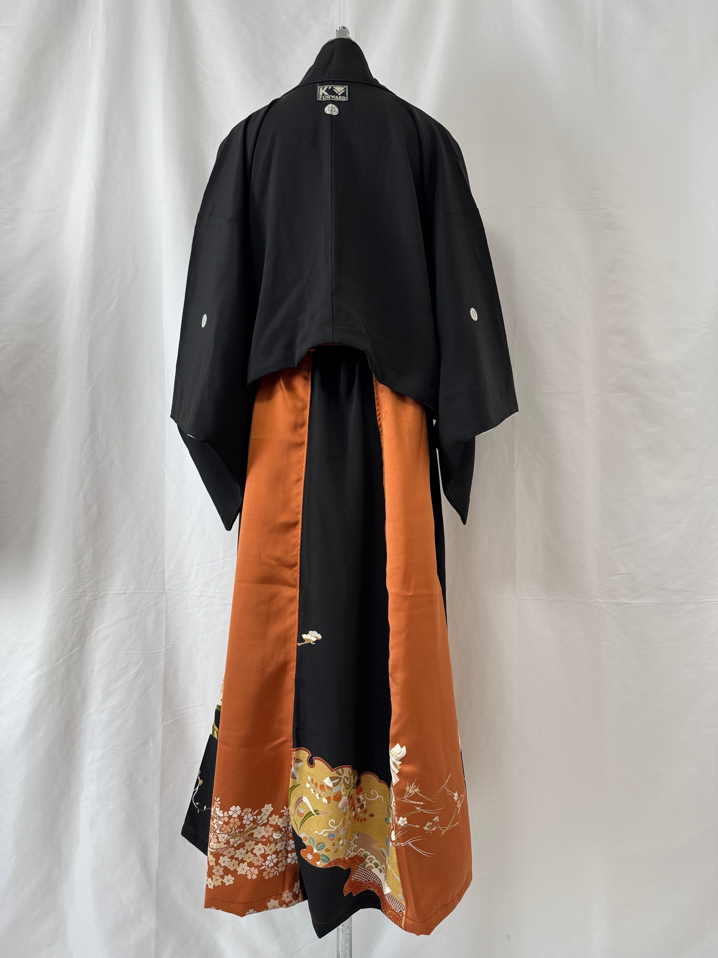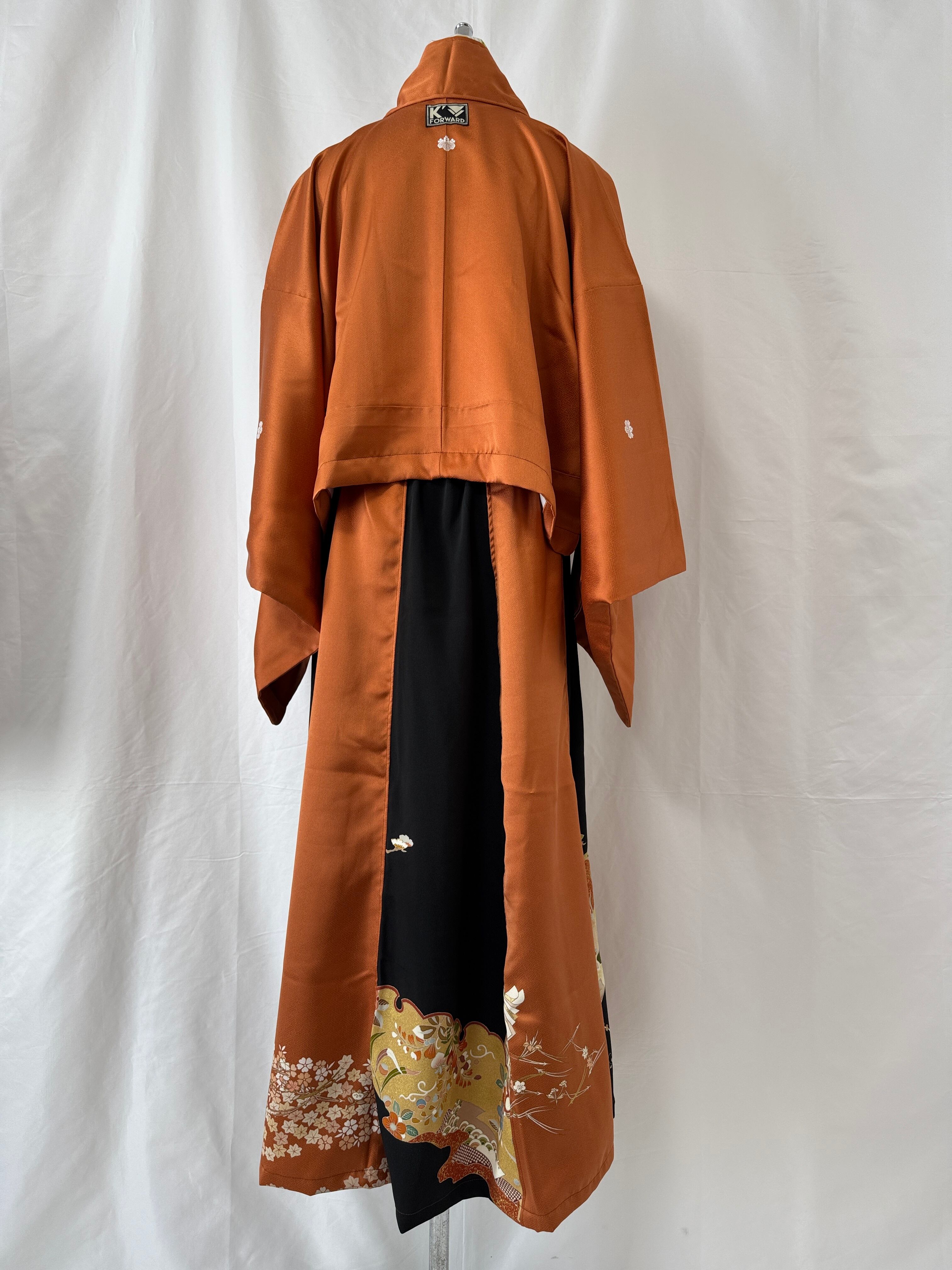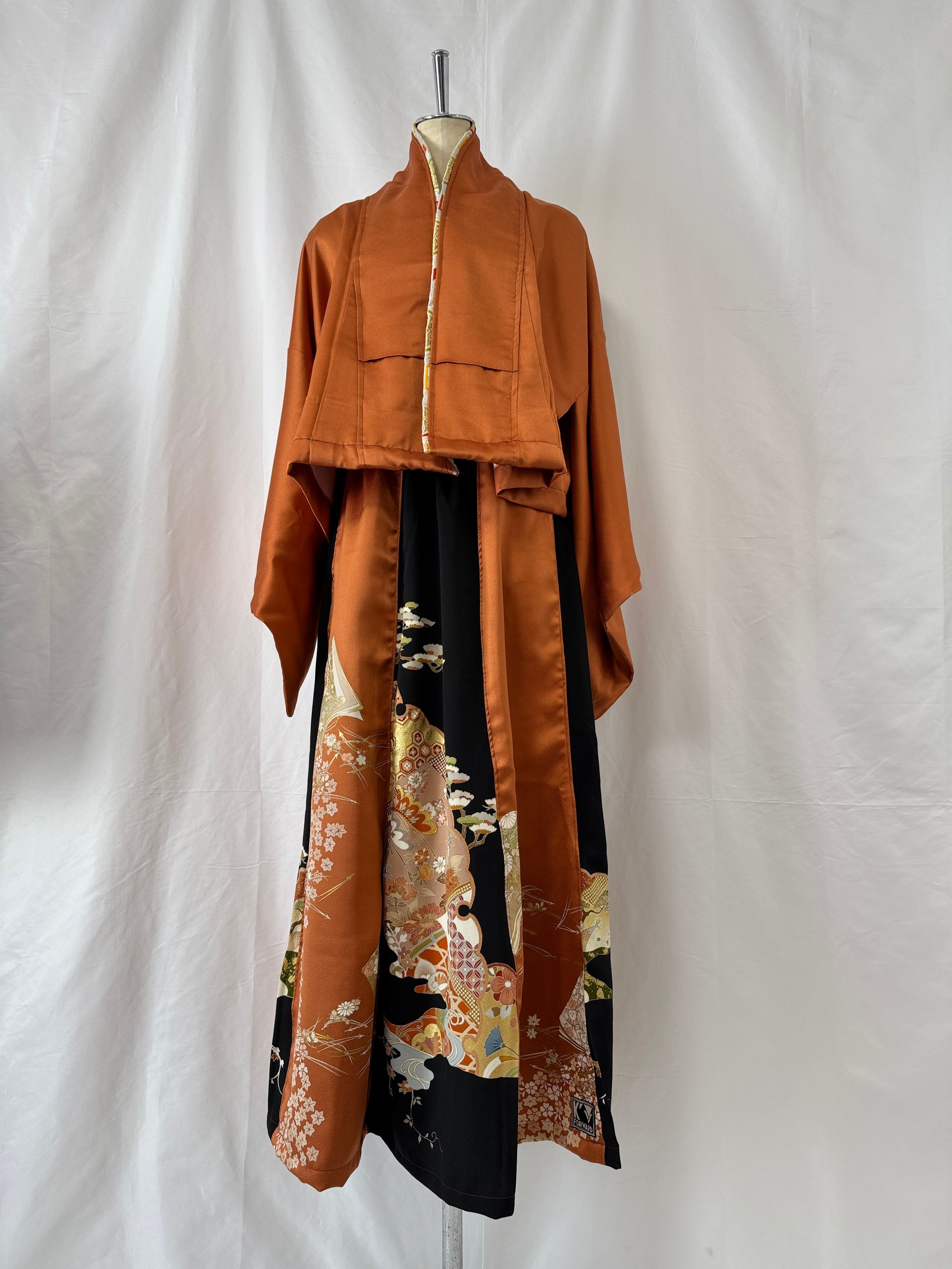 ヴィンテージの訪問着と黒留袖を用いて仕立てた、K´FORWARDの一点物セットアップ。