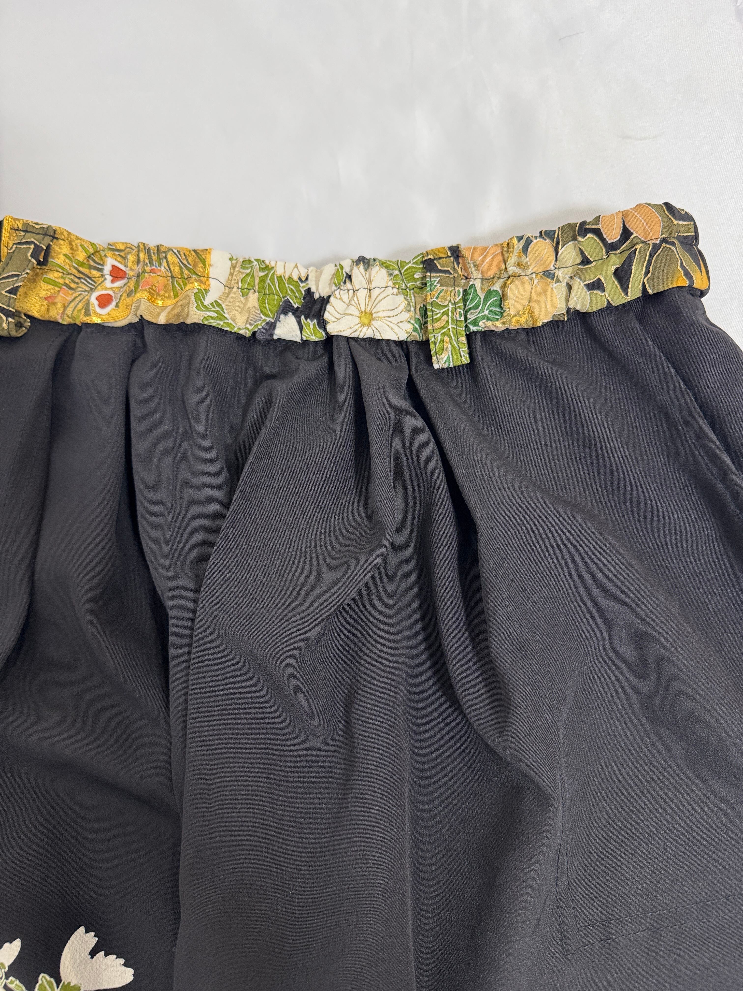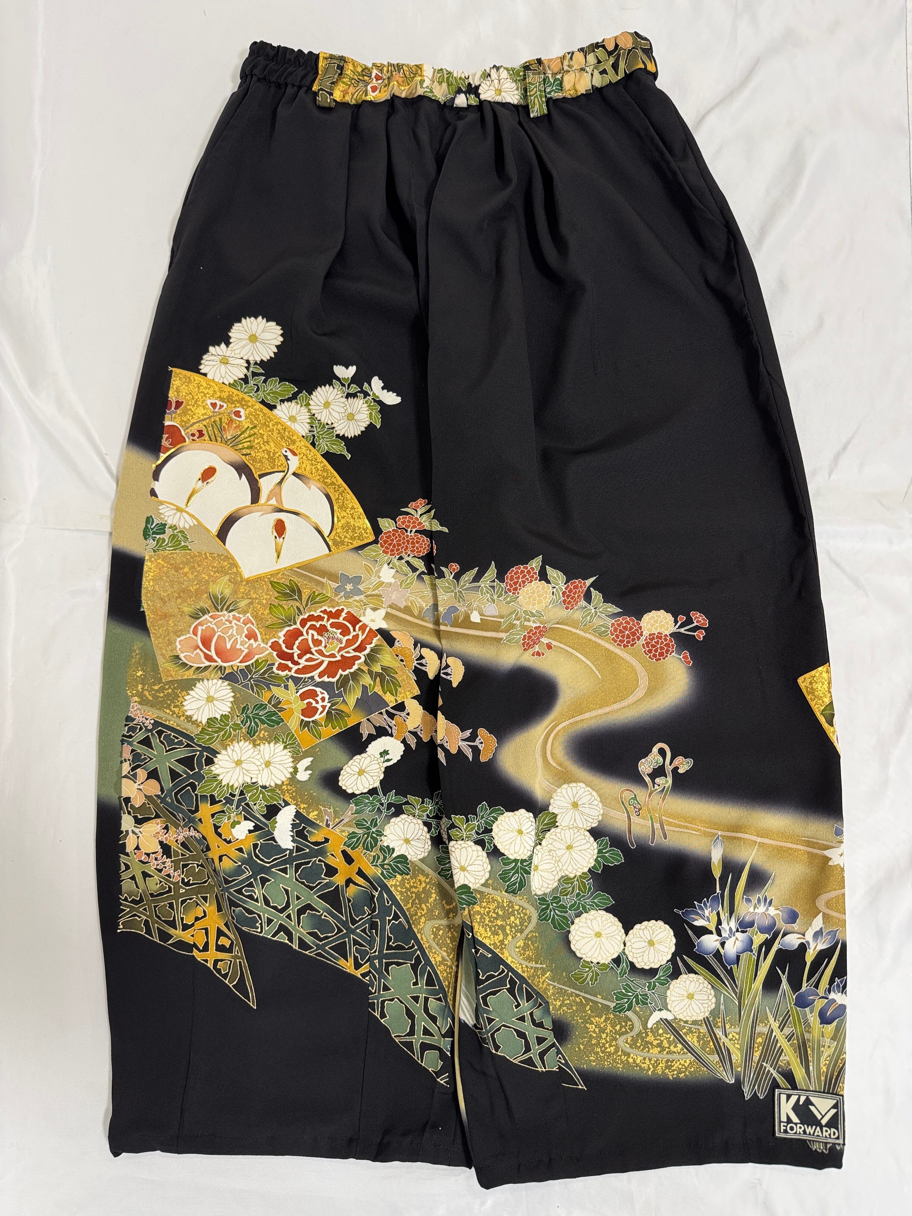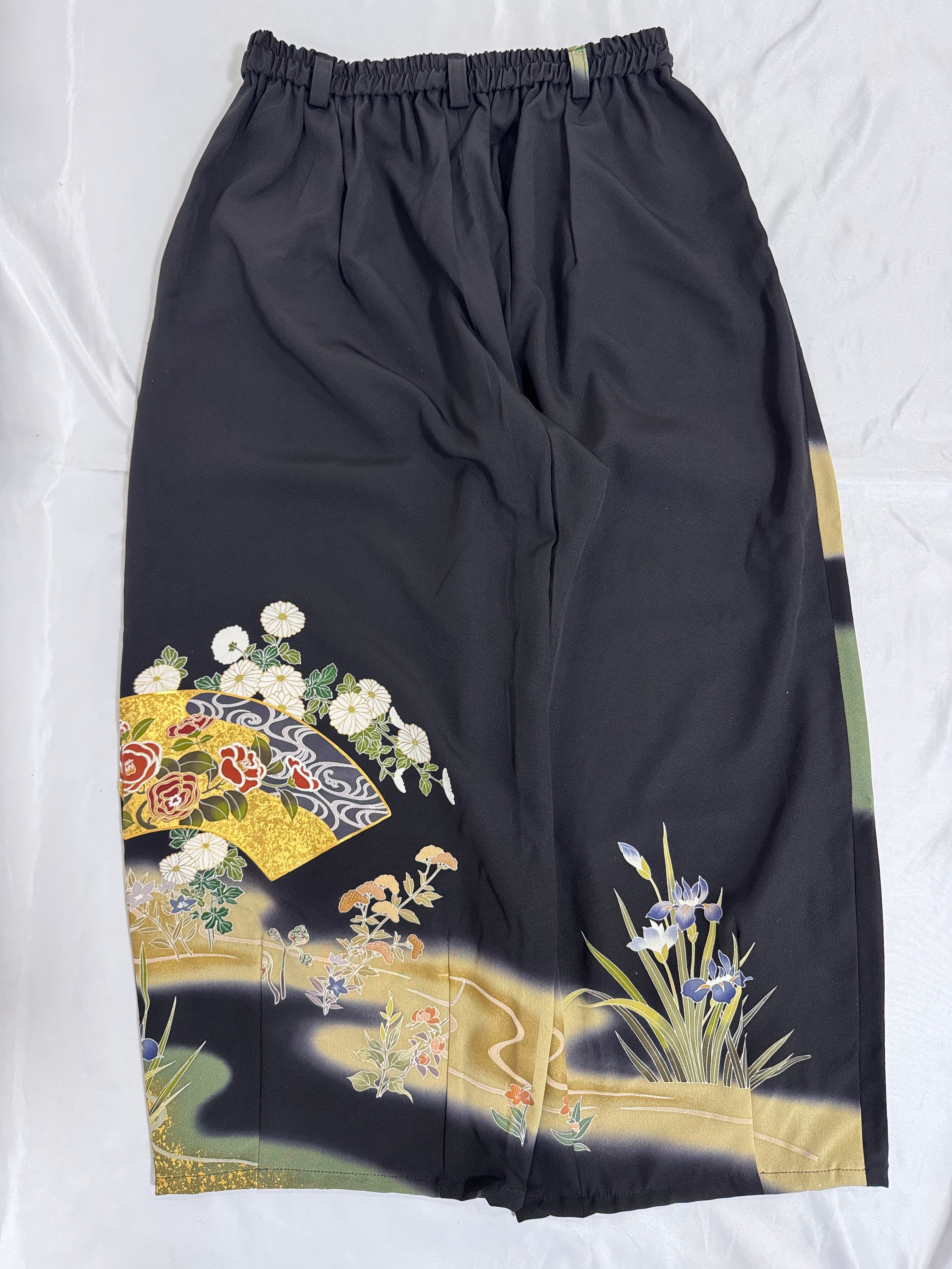 A one-of-a-kind piece upcycled from vintage tomesode kiomno into straight-leg pants.