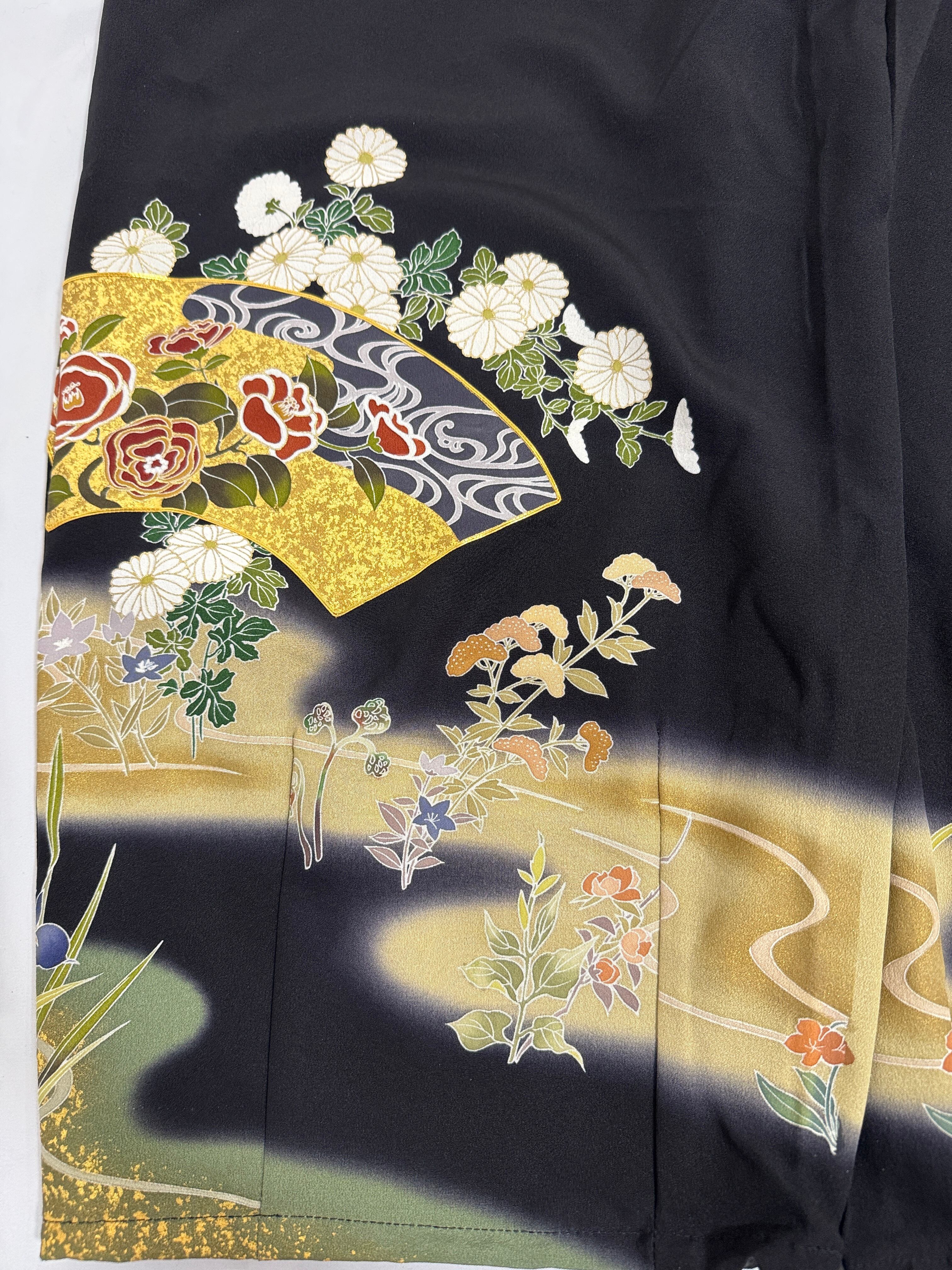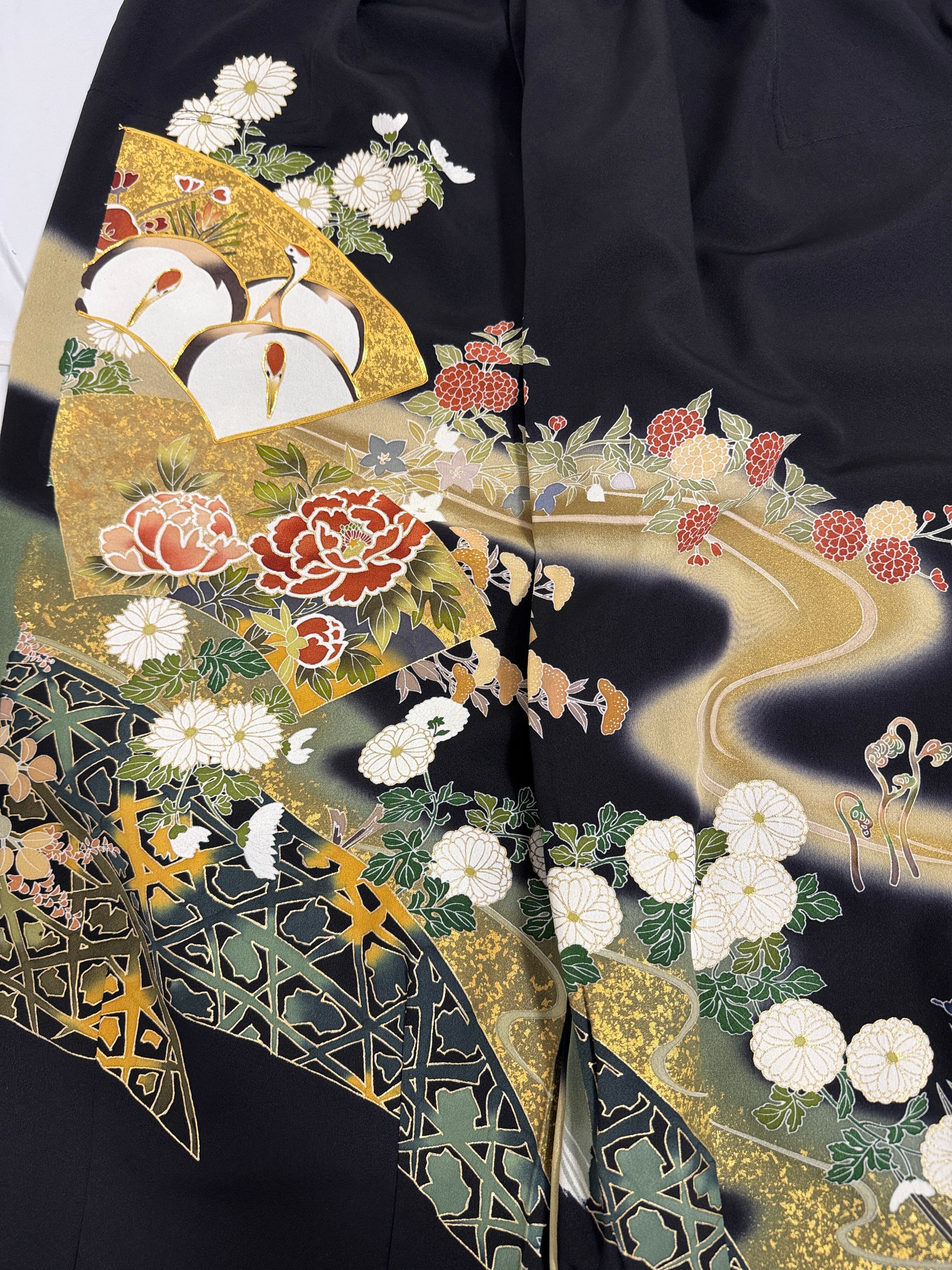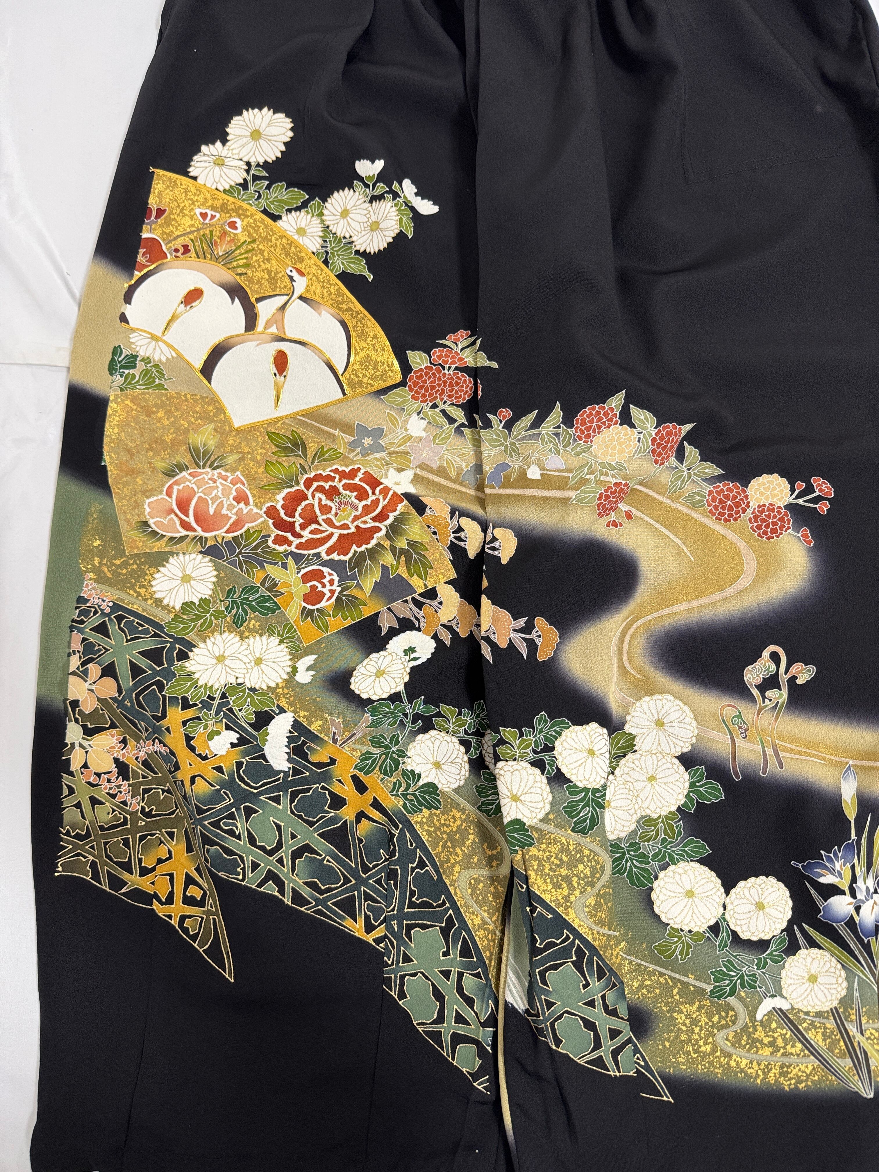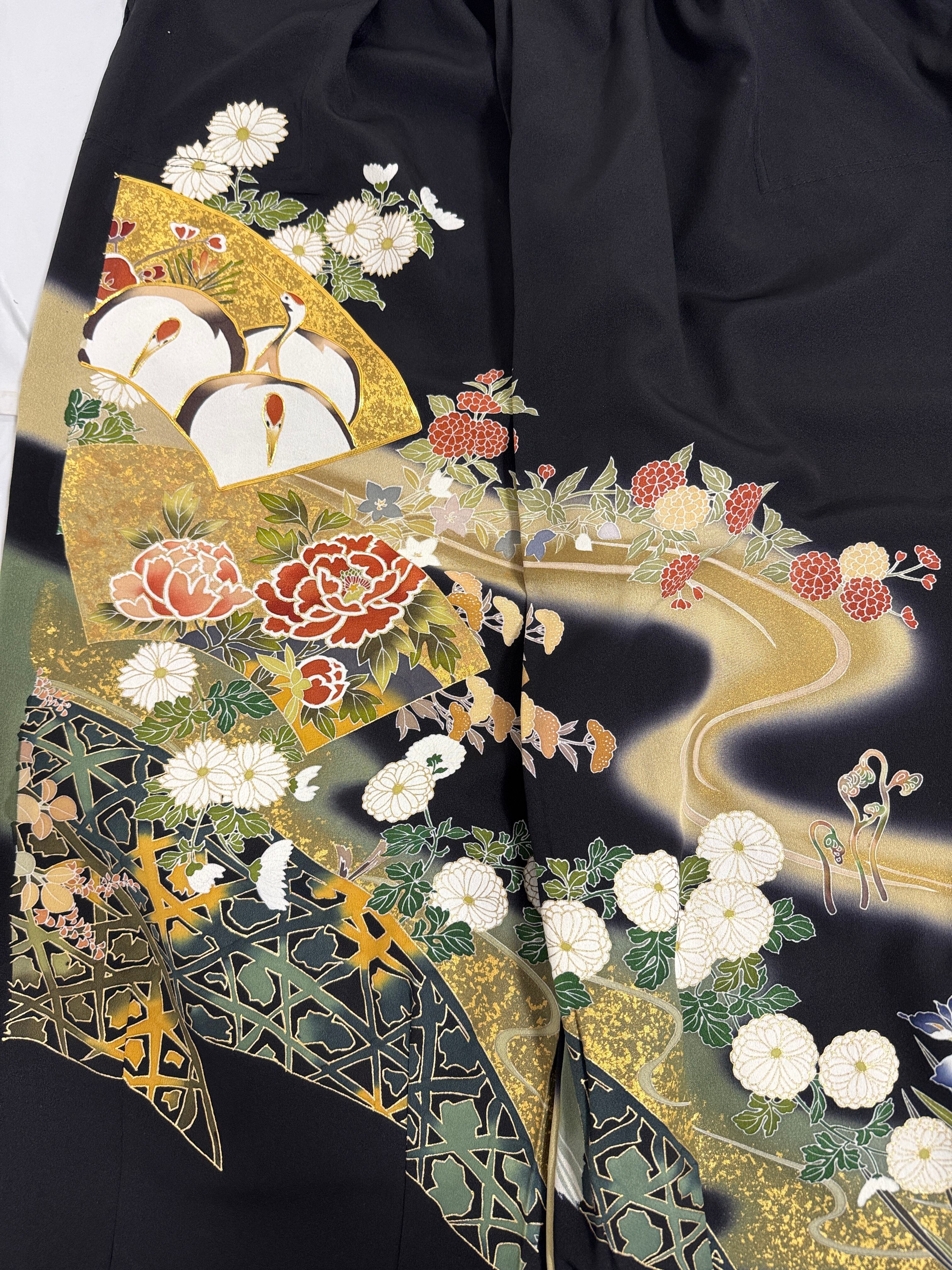優雅に流れる金彩の曲線、四季の花々、そして鶴の意匠が美しい一着です。