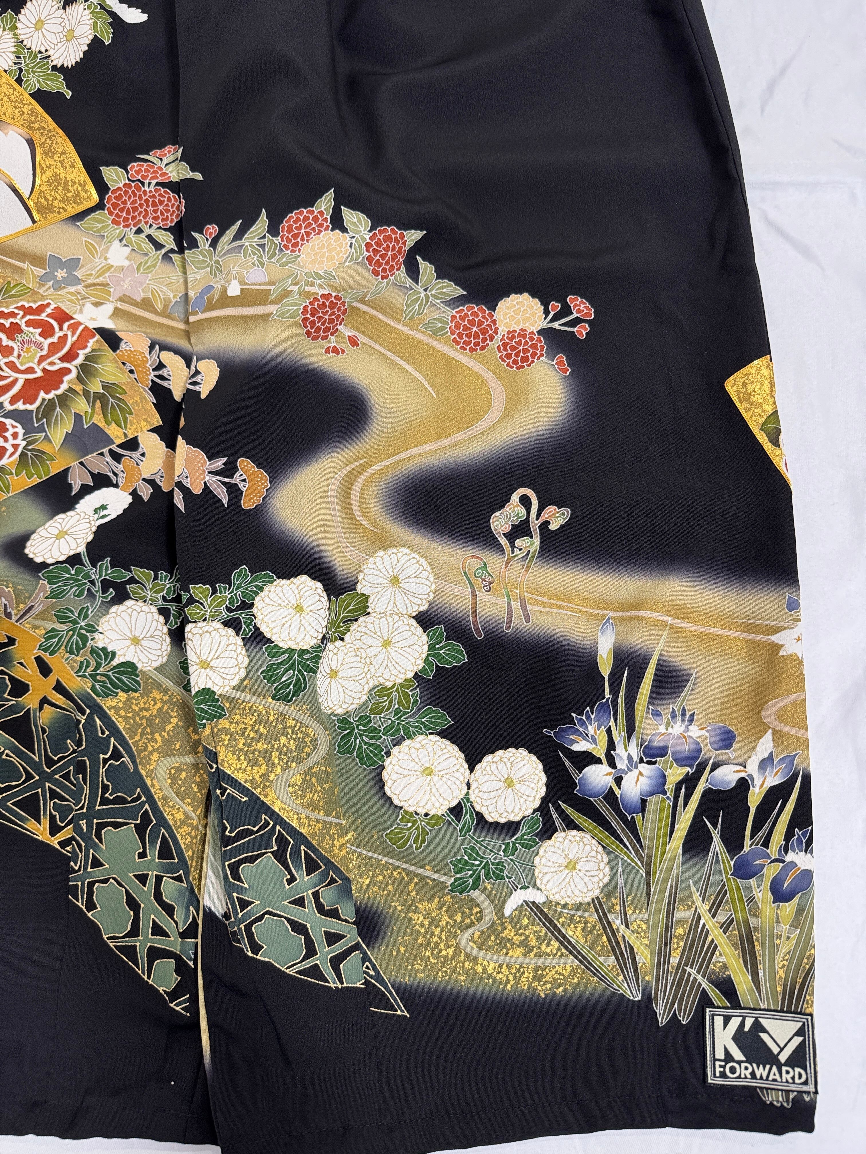A beautiful kimono featuring gracefully flowing gold-painted curves, seasonal flowers, and cranes.