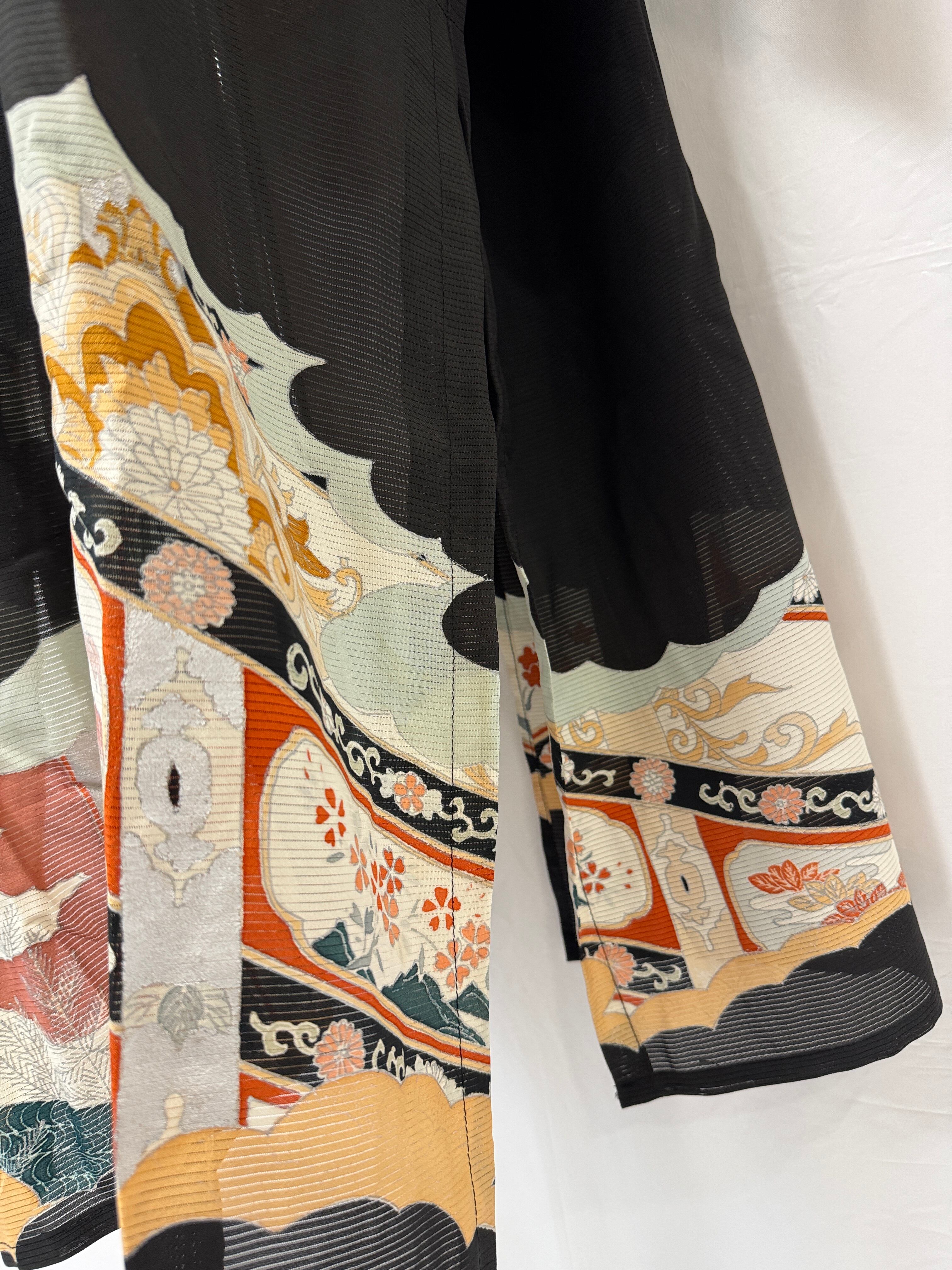 A one-of-a-kind long coat crafted from luxurious summer tomesode kimono fabric, showcasing beautiful sheer elegance.