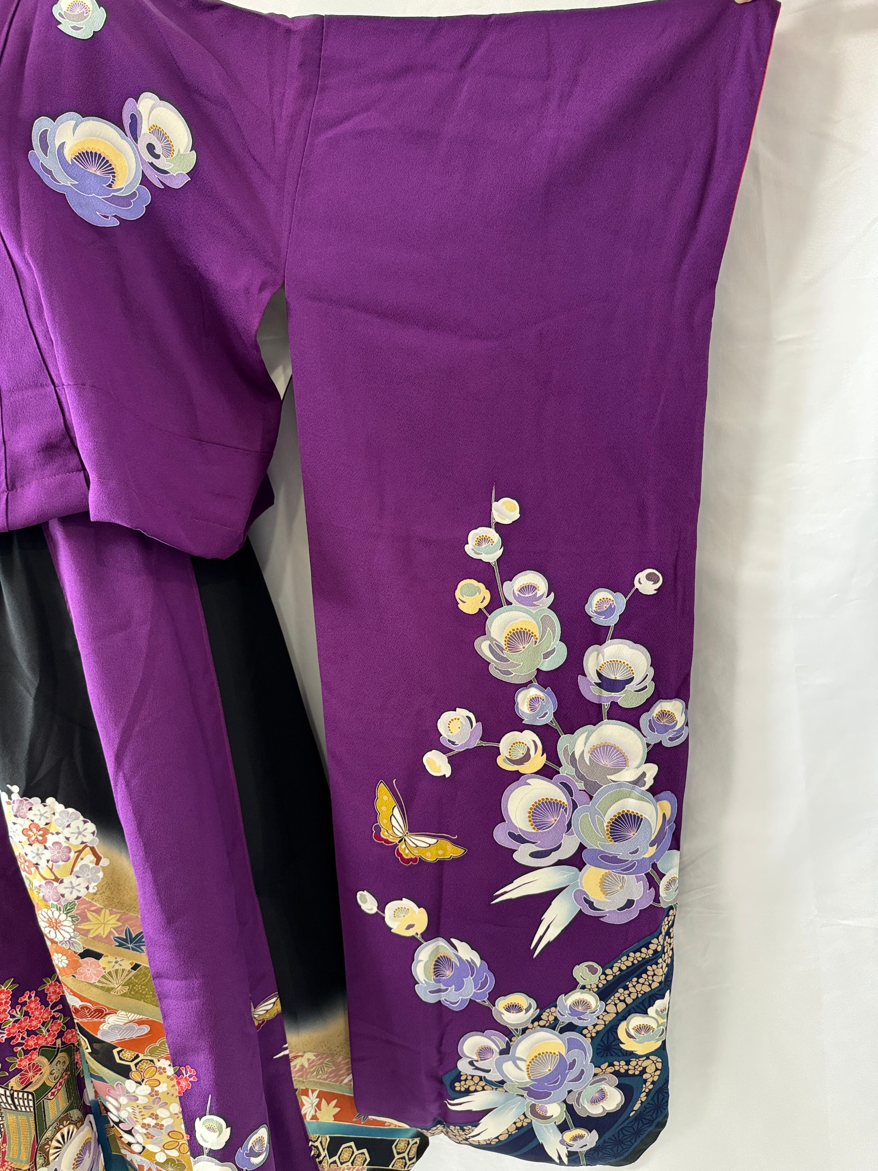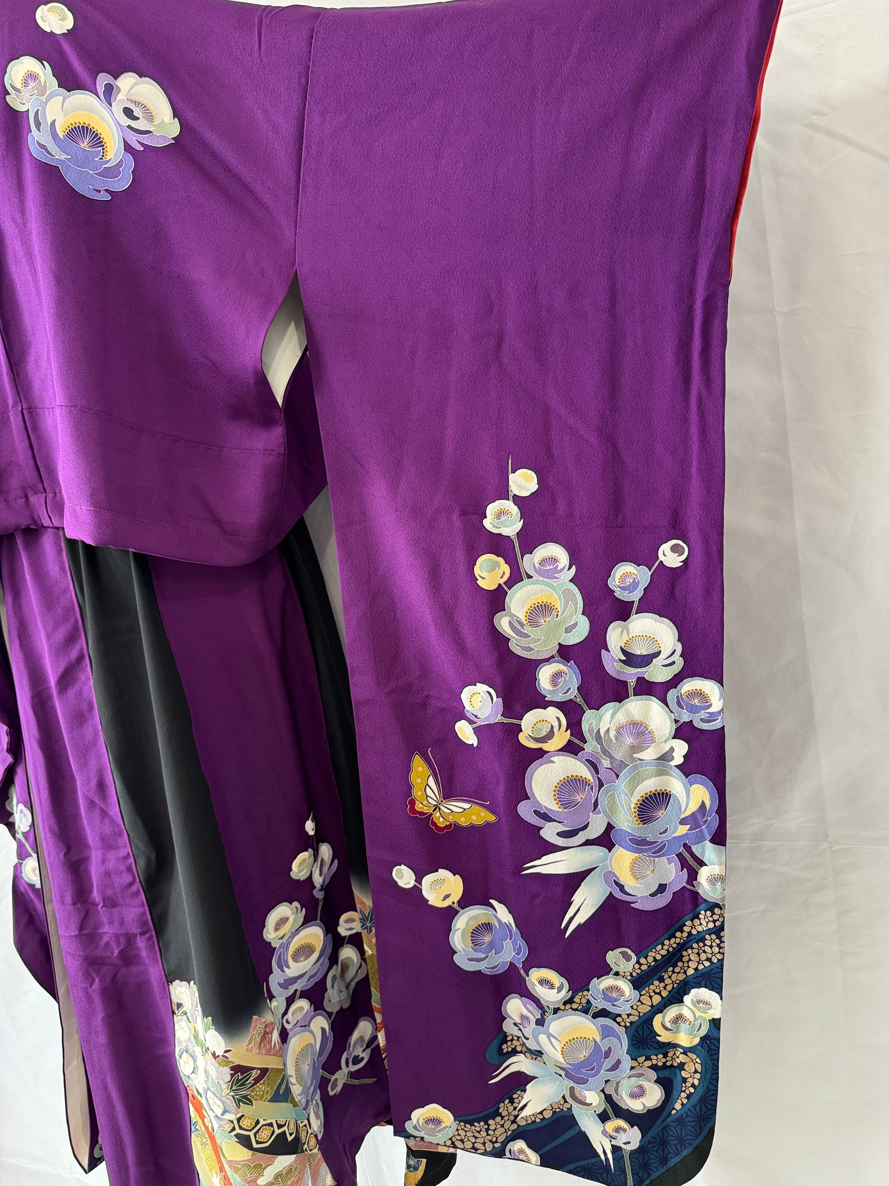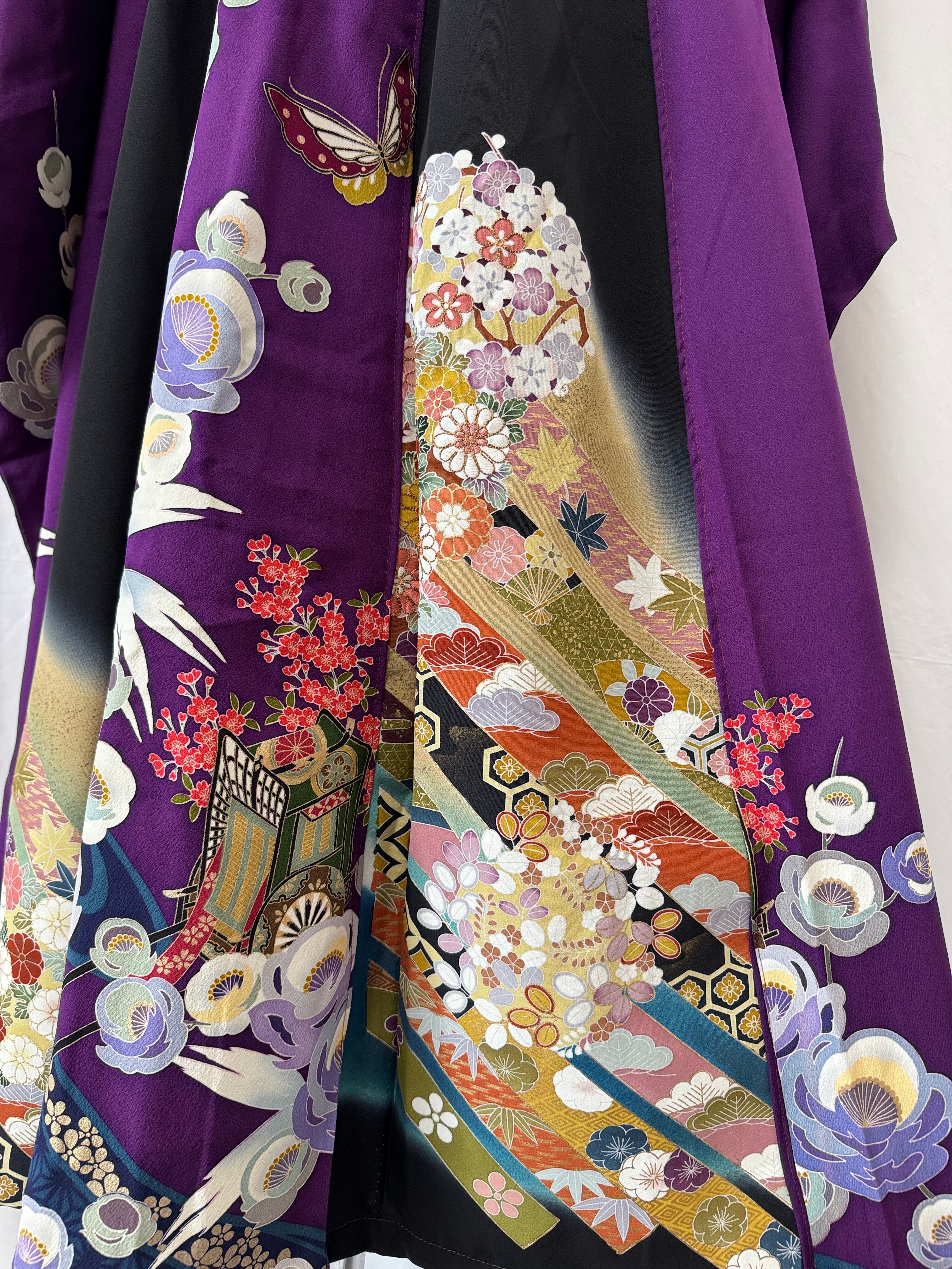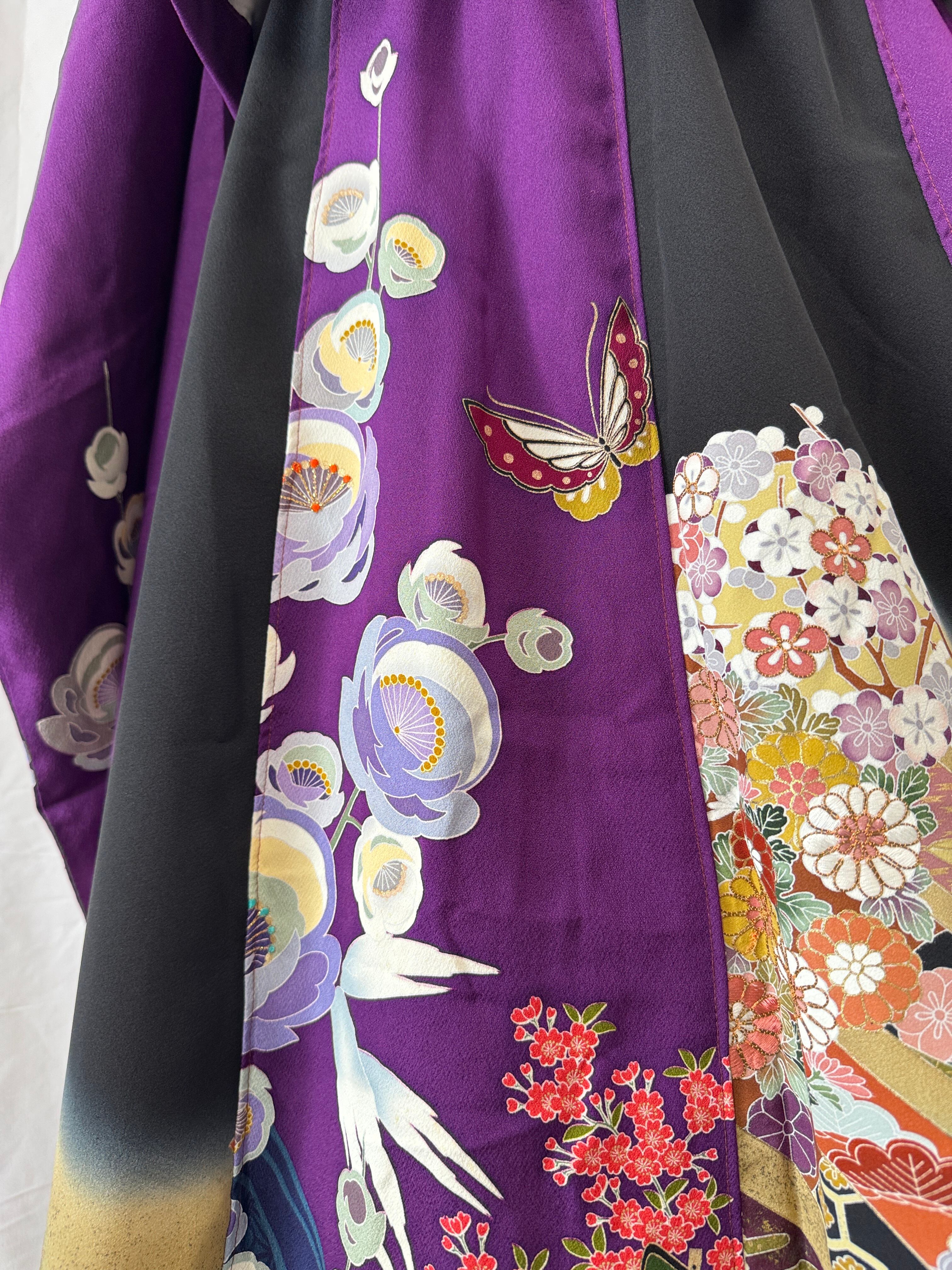 深みのある紫をベースに、咲き誇る花々と舞う蝶。