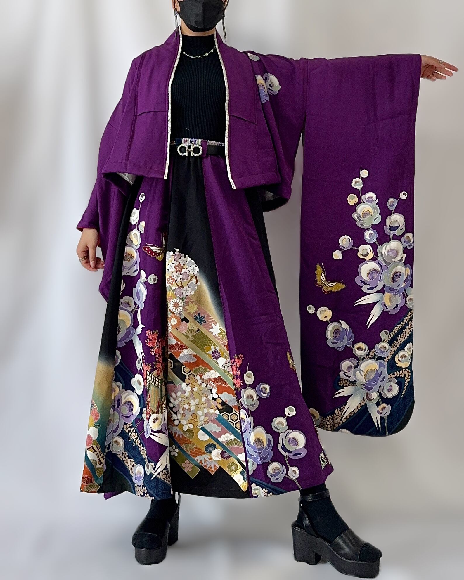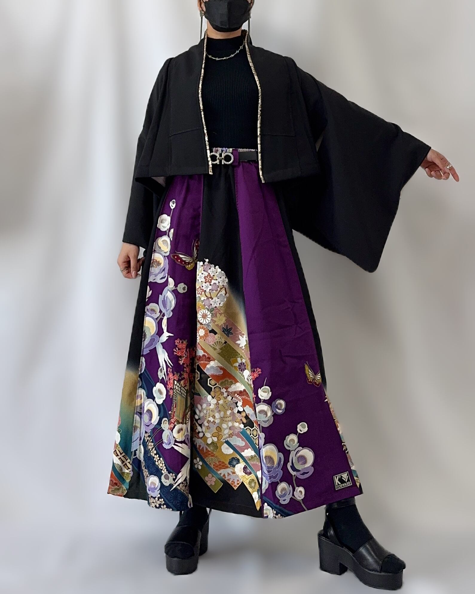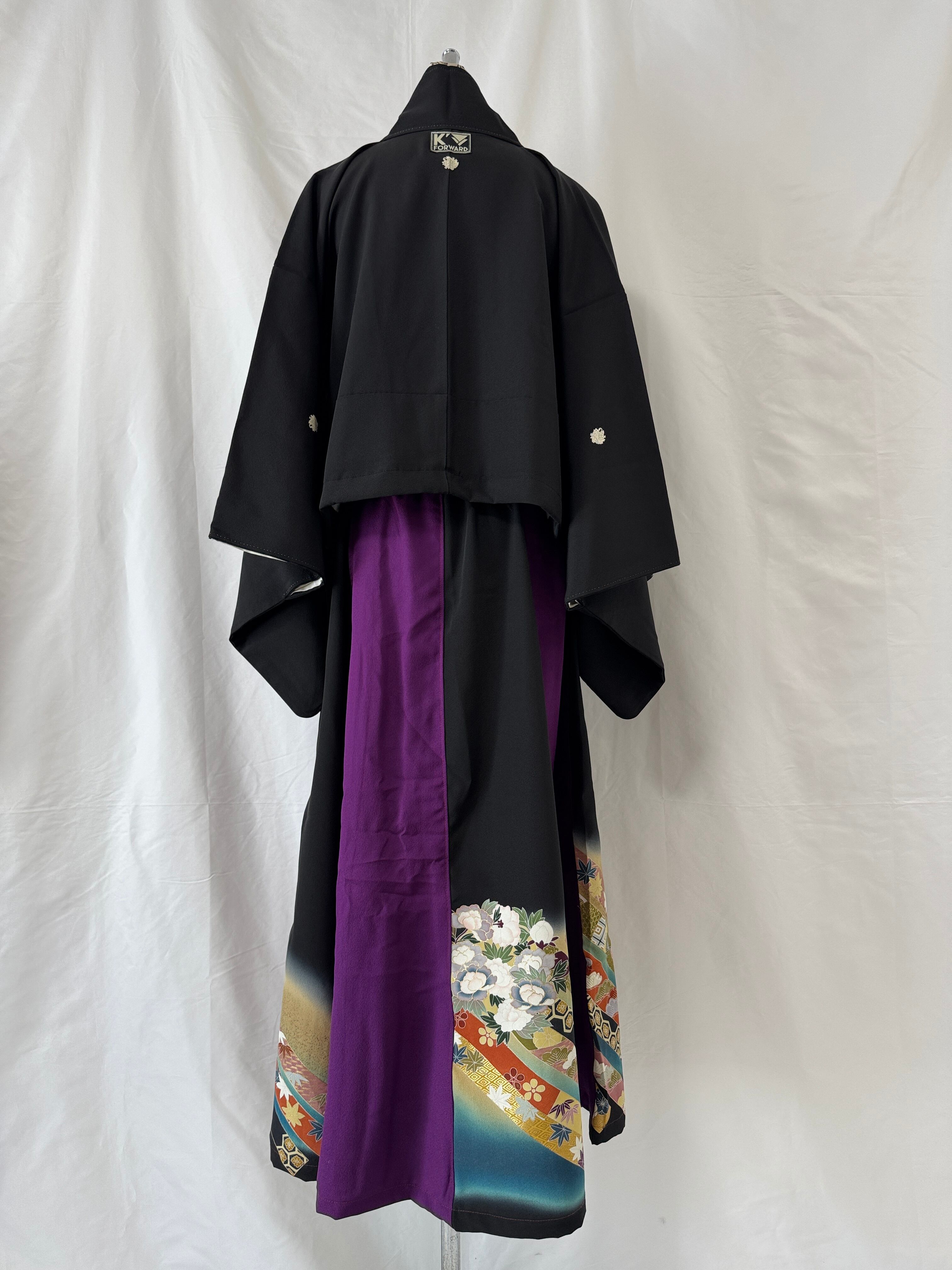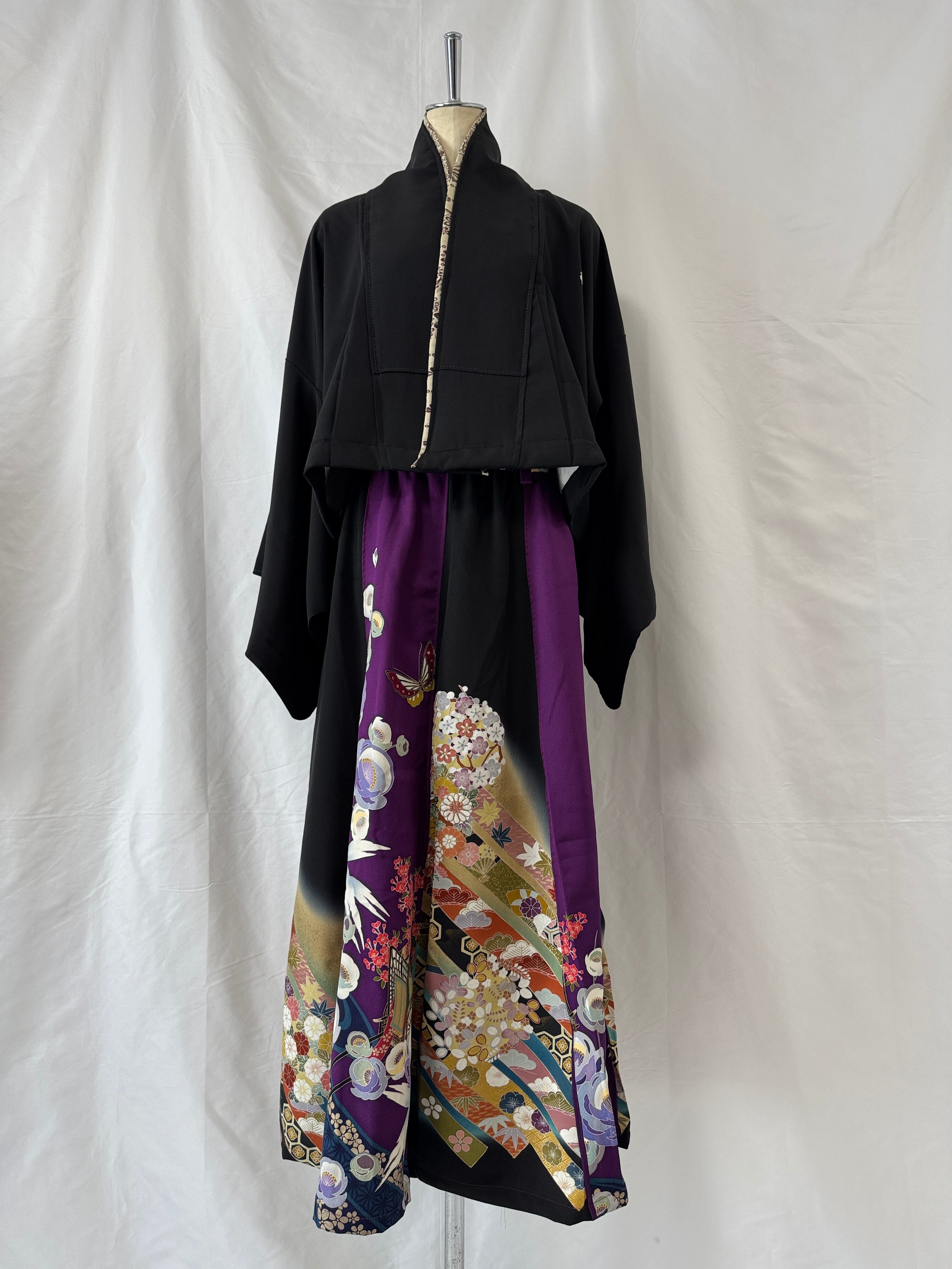 格式高い『振袖』と『黒留袖』を贅沢に掛け合わせ、現代の装いとして再構築したK´FORWARD プレミアムラインの一点物セットアップ。