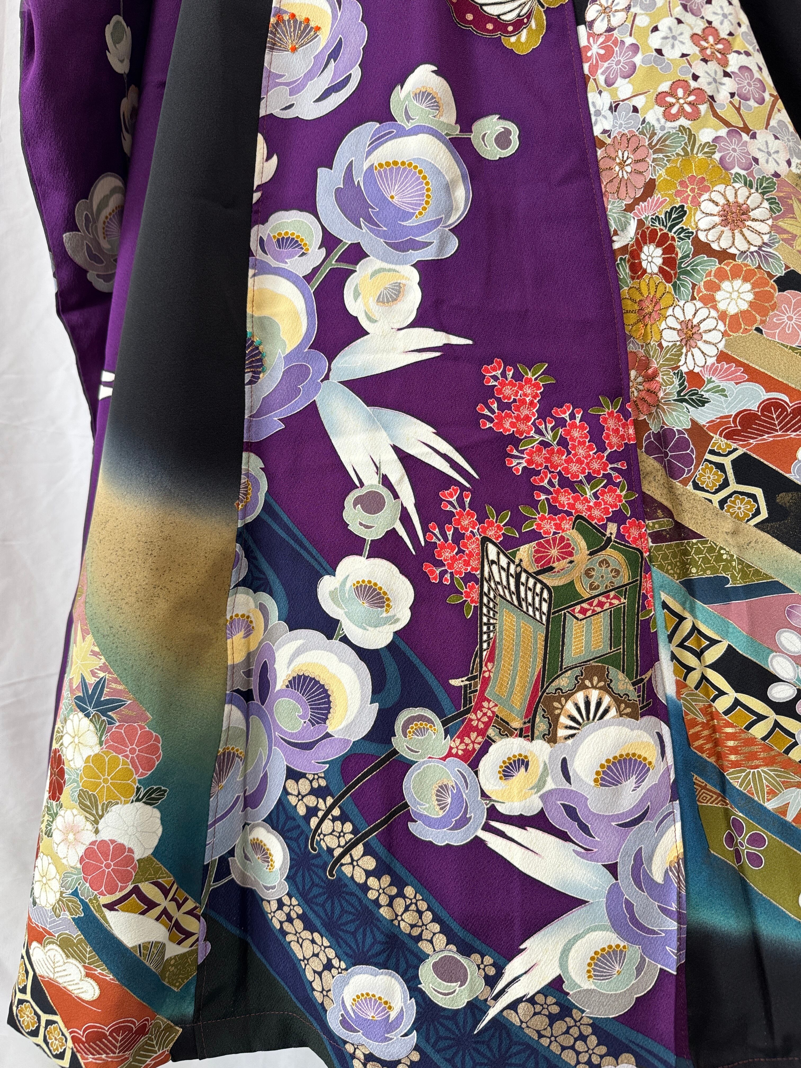 スカートは、2着の着物の裾部分を贅沢に組み合わせて制作することで、柄のつながりを活かしつつ、美しいフレアシルエットが実現しています。